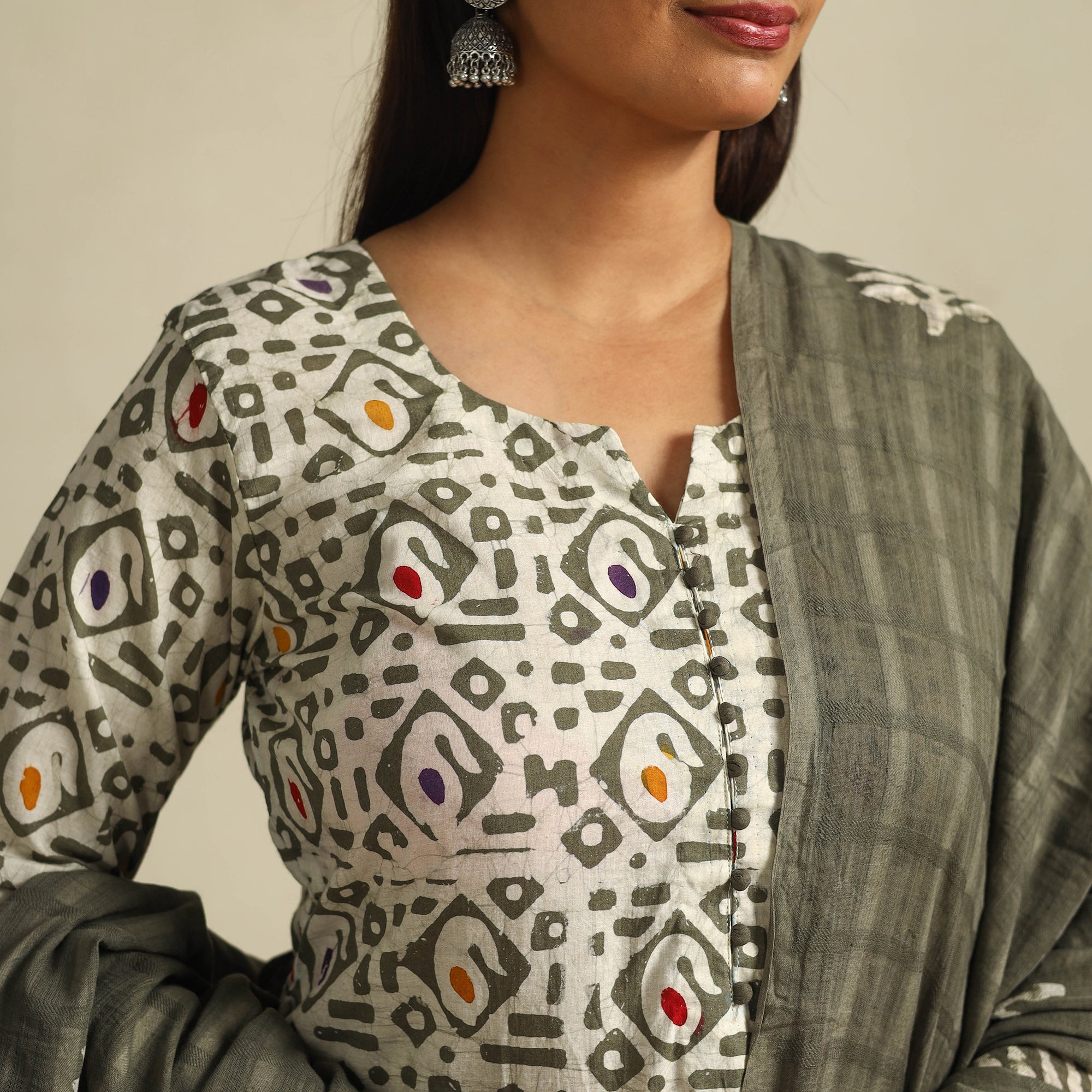 Celebrate the charm of green batik with this hand-printed cotton suit set. Crafted using the traditional wax-resist dyeing technique, it includes a kurta with a side pocket, an elasticated waist palazzo with two pockets, and a mul cotton dupatta. Comfortable, breathable, and rich in artistry, this set is perfect for festive gatherings or everyday styling.