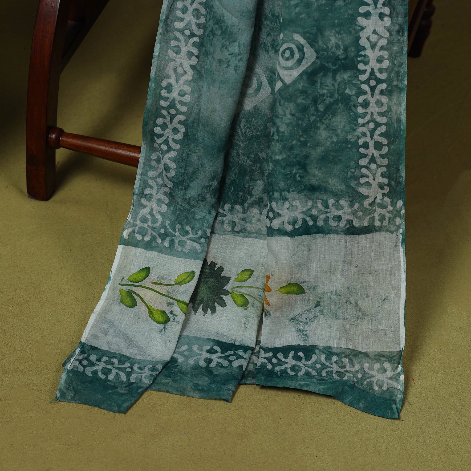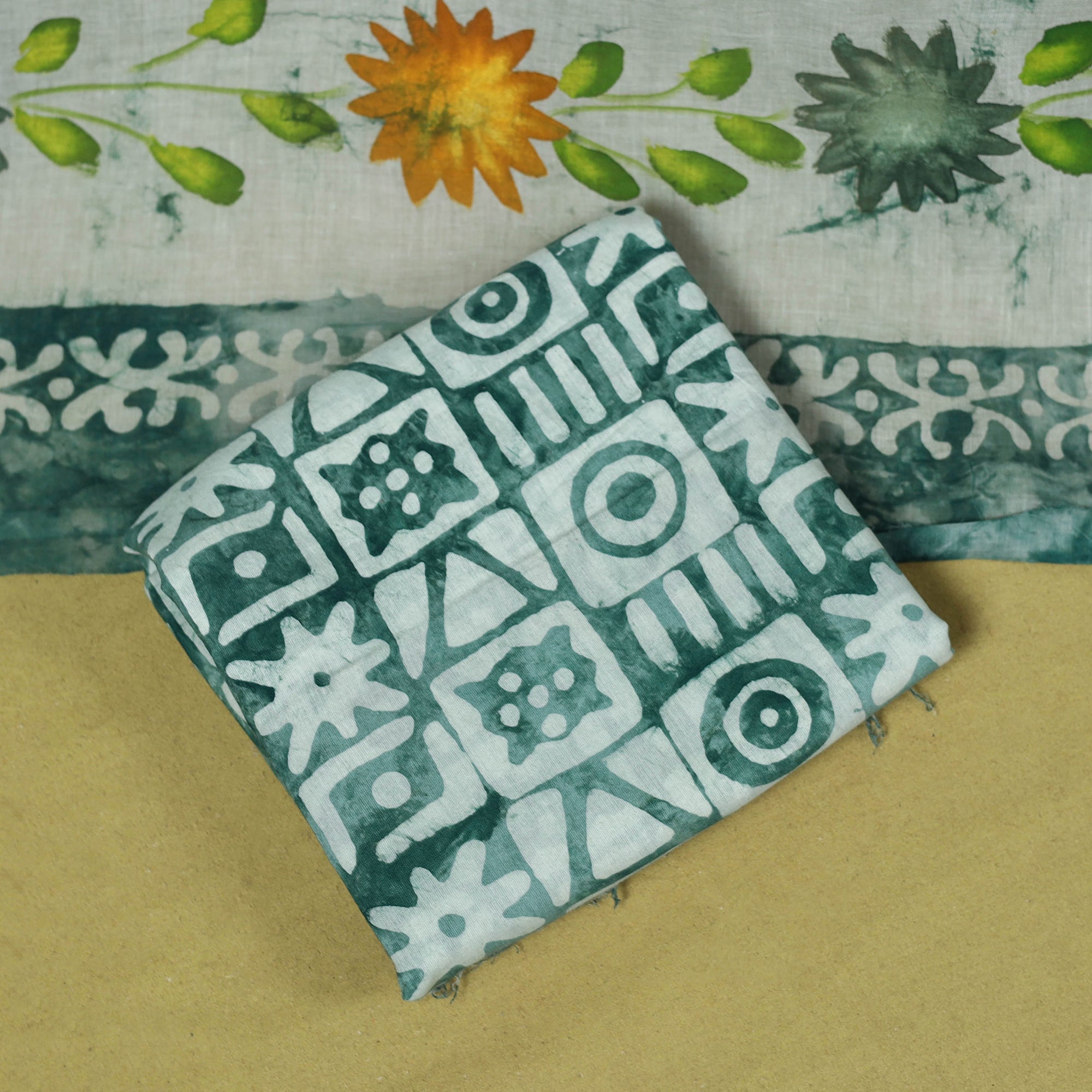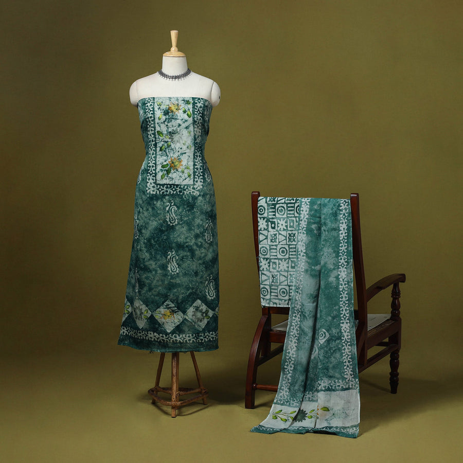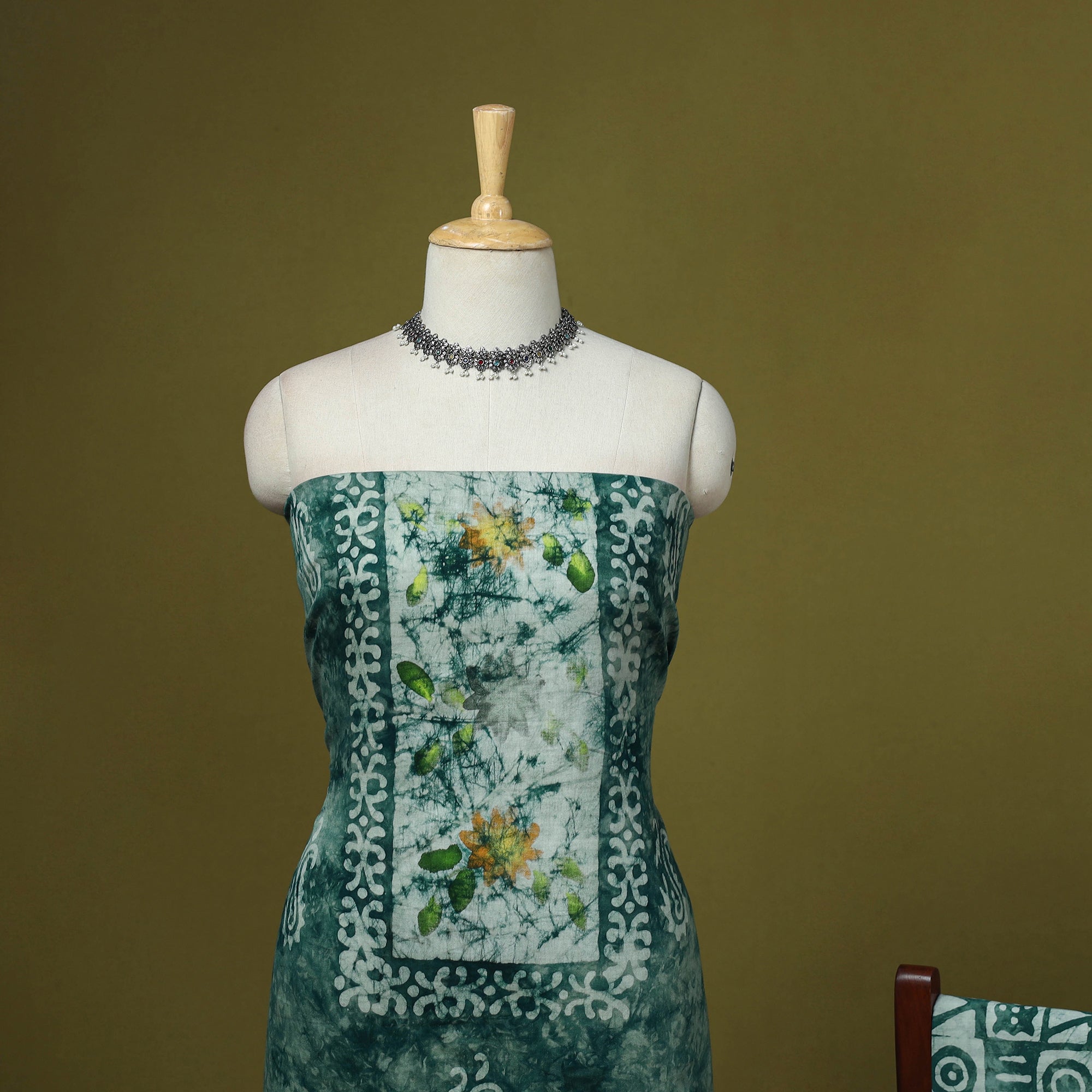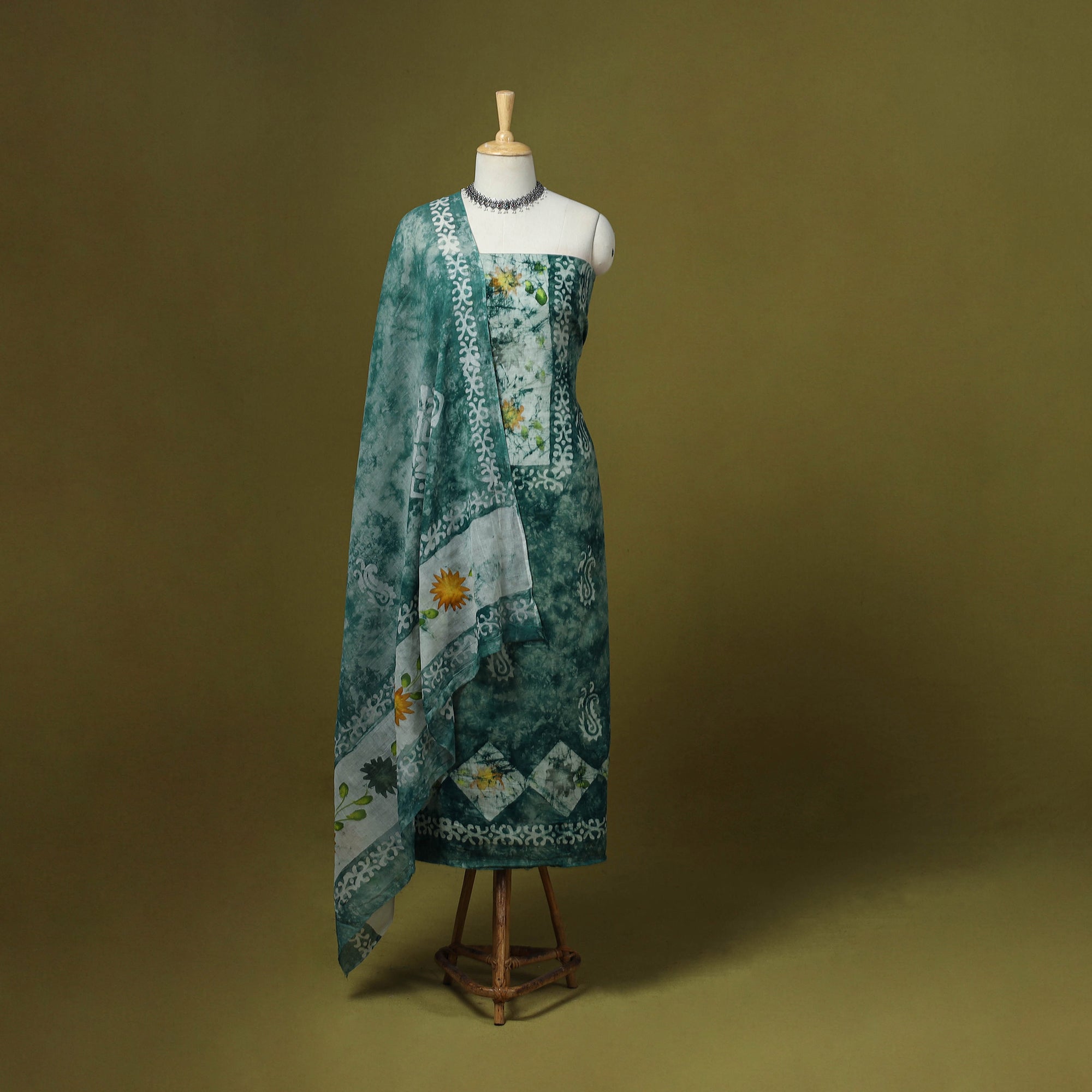 Green cotton hand block batik print 3pc unstitched dress material from Madhya Pradesh is created using the traditional wax-resist dyeing technique, known for its bold and artistic patterns. The set includes fabric for the kurta, a coordinated bottom and a cotton dupatta. The motifs highlight regional artistry passed down through generations, making it a comfortable and stylish choice for festive occasions or elegant everyday wear. Get it tailored your way to create a uniquely beautiful outfit that reflects your personal style.