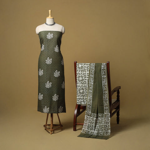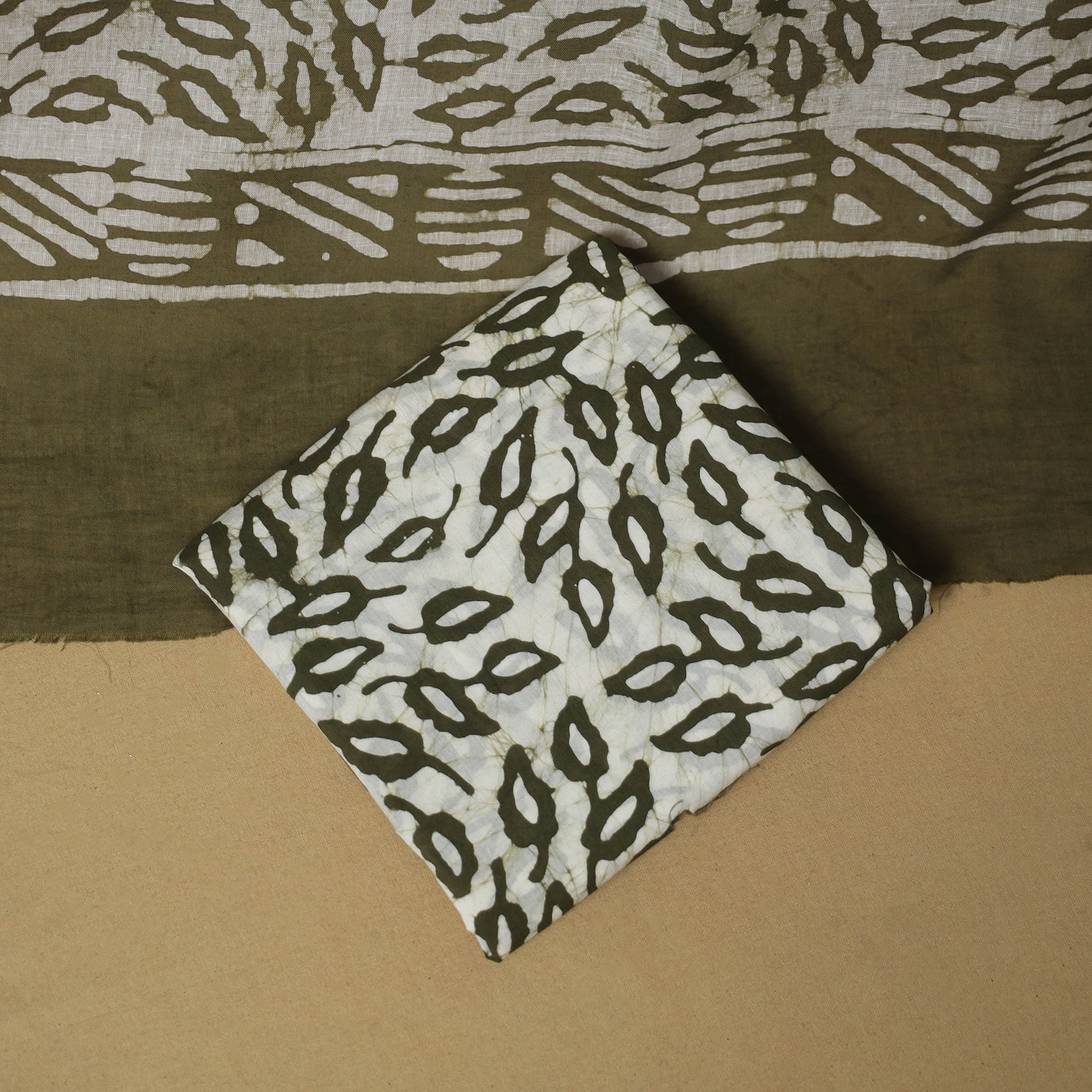Green cotton hand block batik print 3pc unstitched dress material from Madhya Pradesh is created using the traditional wax-resist dyeing technique, known for its bold and artistic patterns. The set includes kurta fabric that features jacquard weaving, a coordinated bottom and a mul cotton dupatta. The motifs highlight regional artistry passed down through generations, making it a comfortable and stylish choice for festive occasions or elegant everyday wear. Get it tailored your way to create a uniquely beautiful outfit that reflects your personal style.