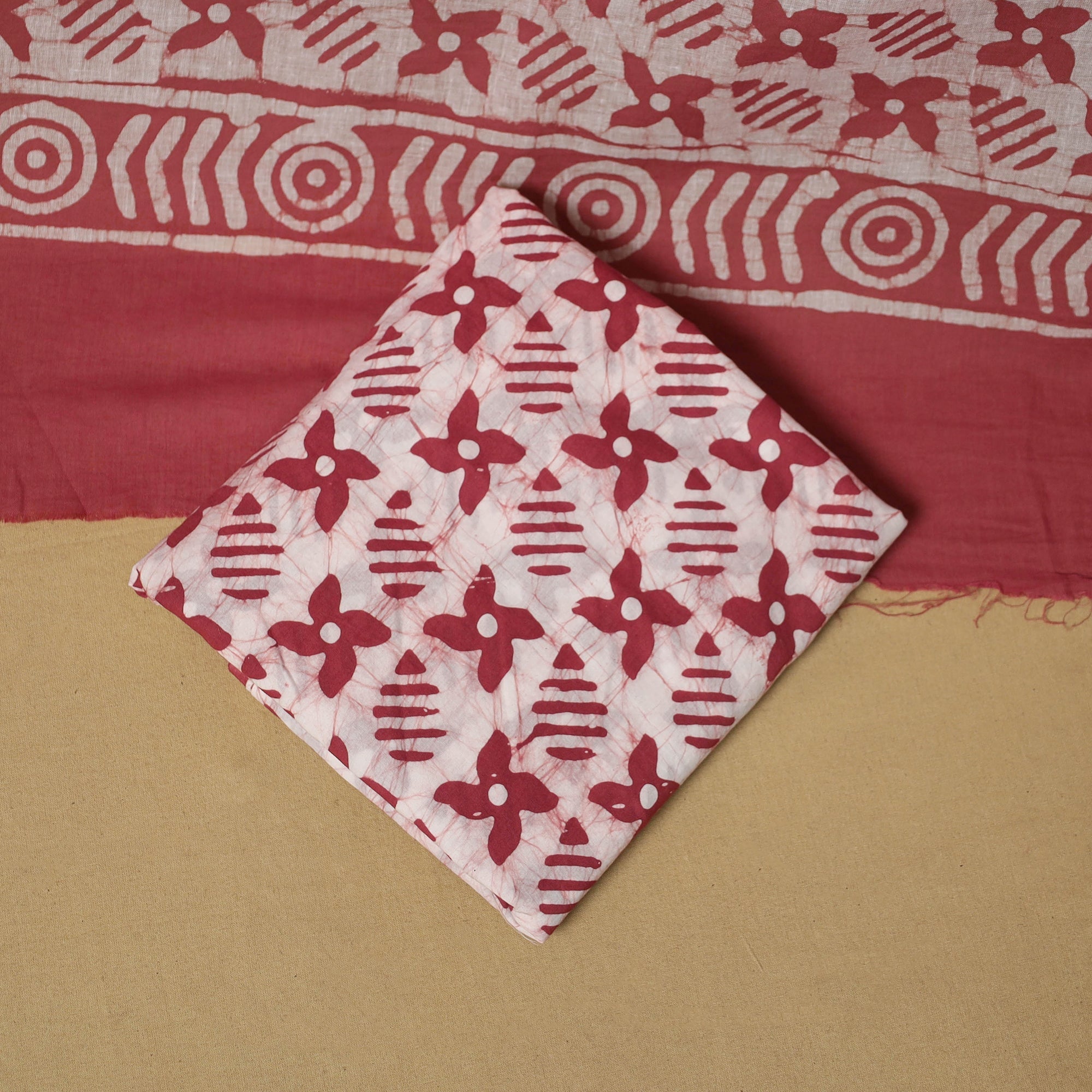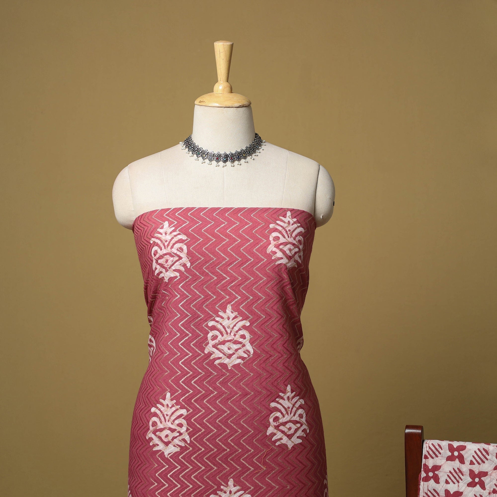 Pink cotton hand block batik print 3pc unstitched dress material from Madhya Pradesh is created using the traditional wax-resist dyeing technique, known for its bold and artistic patterns. The set includes kurta fabric that features jacquard weaving, a coordinated bottom and a mul cotton dupatta. The motifs highlight regional artistry passed down through generations, making it a comfortable and stylish choice for festive occasions or elegant everyday wear. Get it tailored your way to create a uniquely beautiful outfit that reflects your personal style.