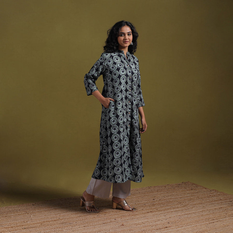 Black - Cotton Hand Block Batik Print A-Line Kurta for women 13