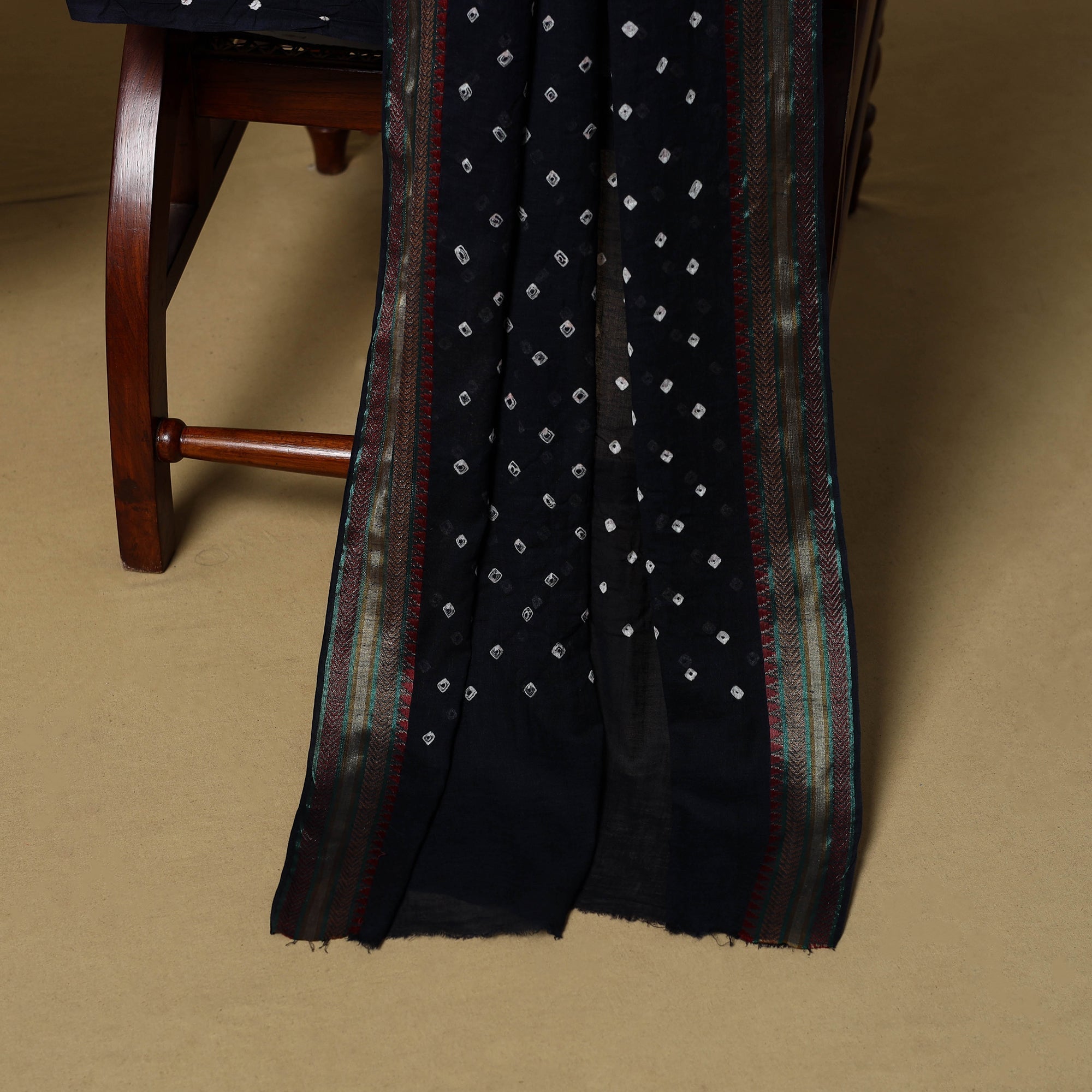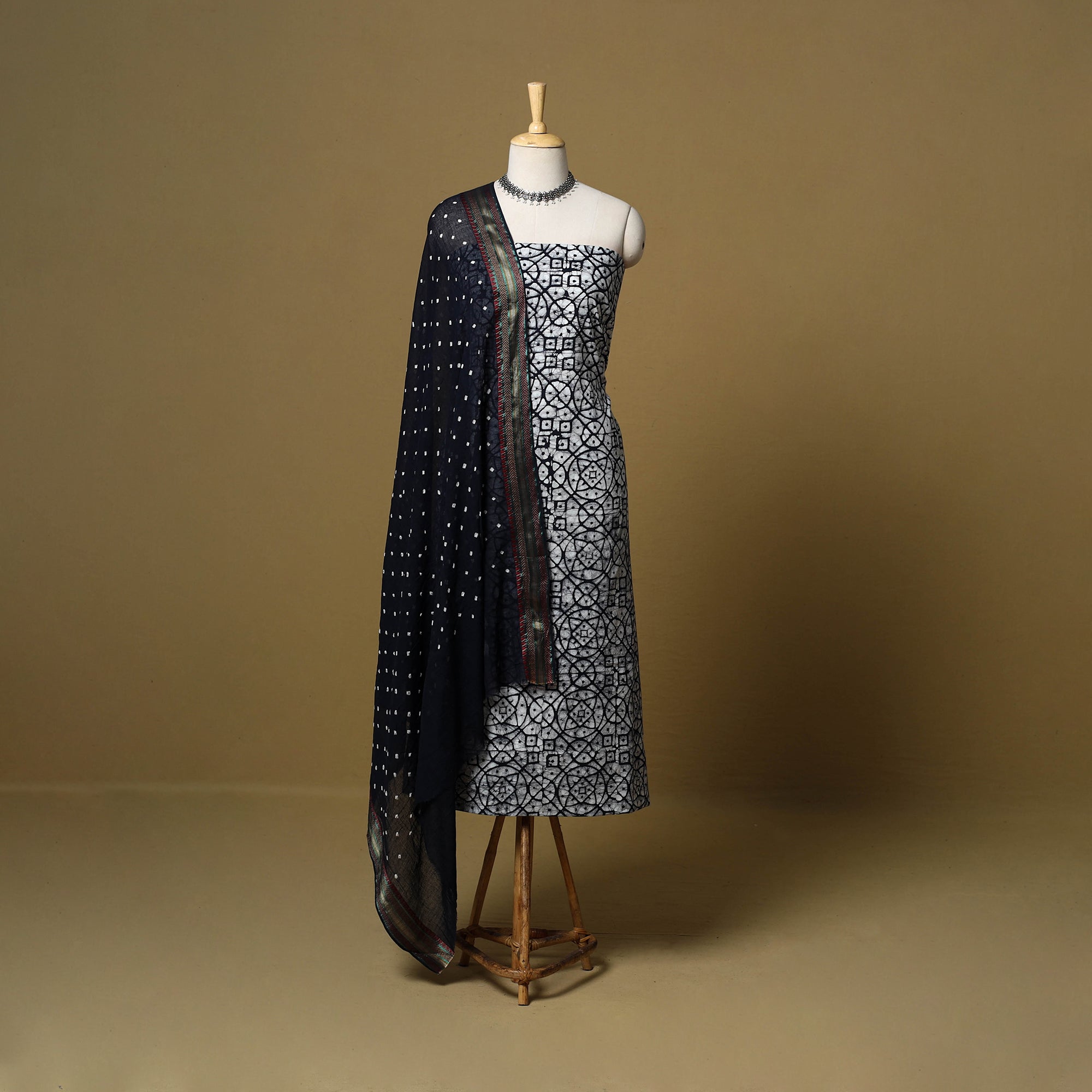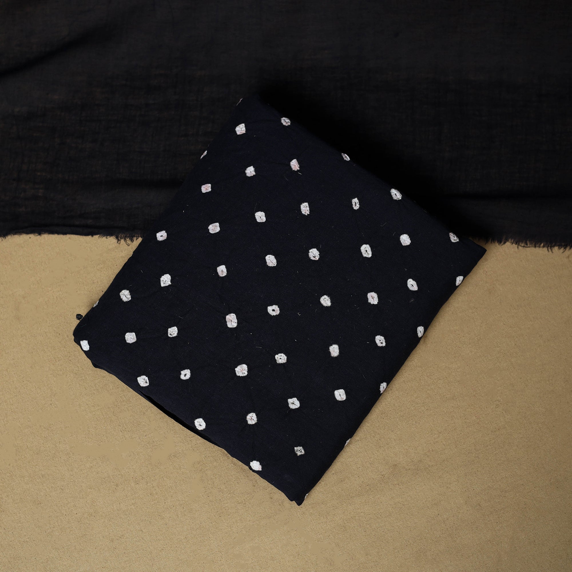 Black 3pc pure cotton unstitched dress material from the Kutch region, showcasing the area’s renowned batik and bandhani techniques. The set includes a Batik kurta fabric along with a Bandhani bottom and dupatta, creating a harmonious blend of two regional styles. Making it suitable for everyday wear or any occasions.