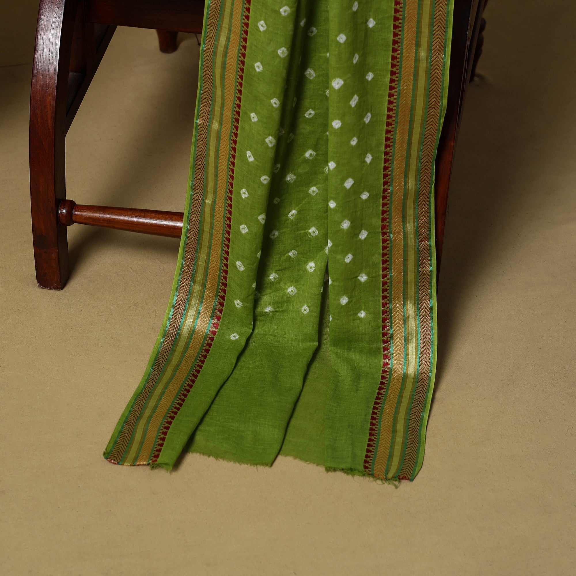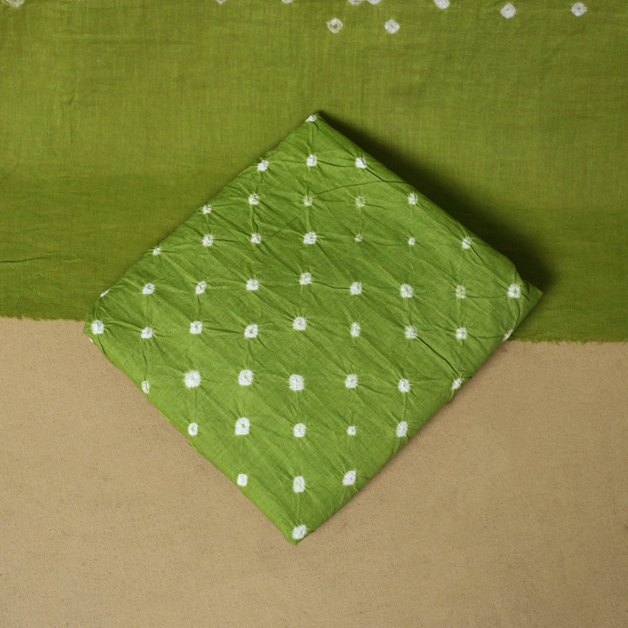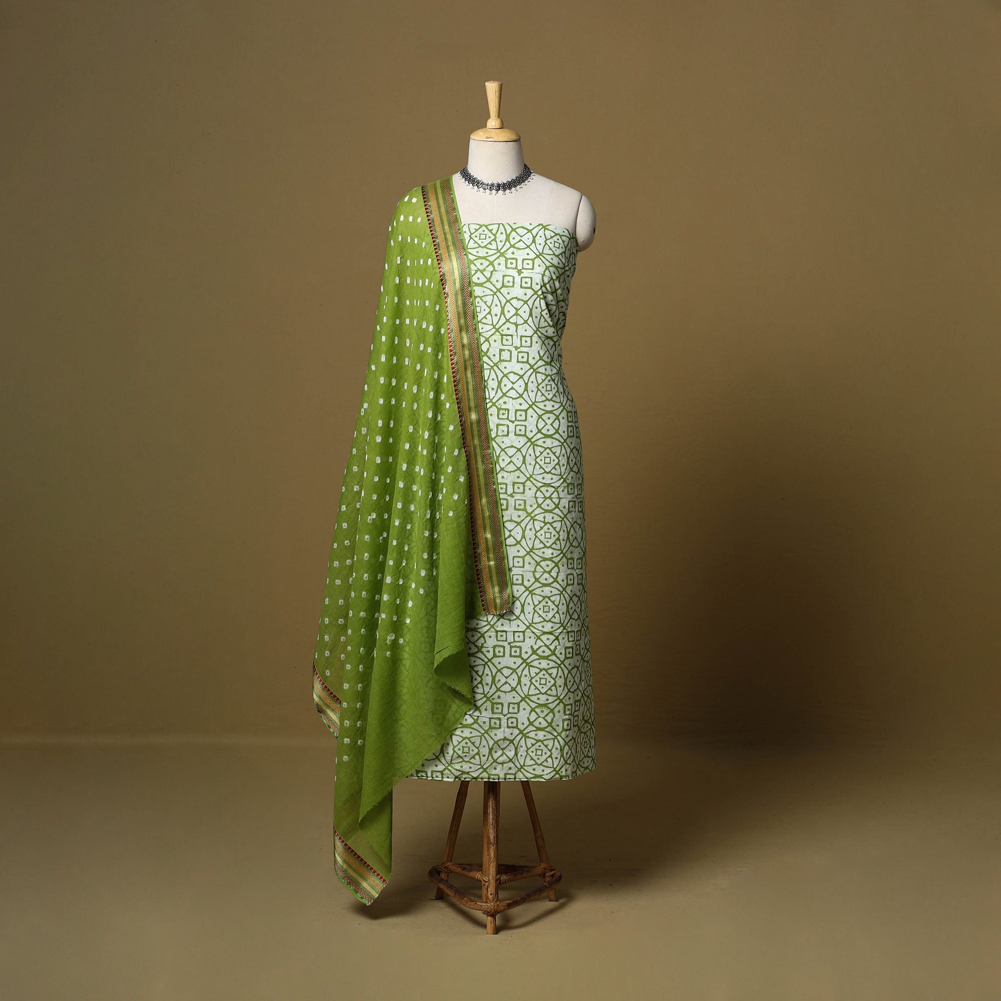 Green 3pc pure cotton unstitched dress material from the Kutch region, showcasing the area’s renowned batik and bandhani techniques. The set includes a Batik kurta fabric along with a Bandhani bottom and dupatta, creating a harmonious blend of two regional styles. Making it suitable for everyday wear or any occasions.