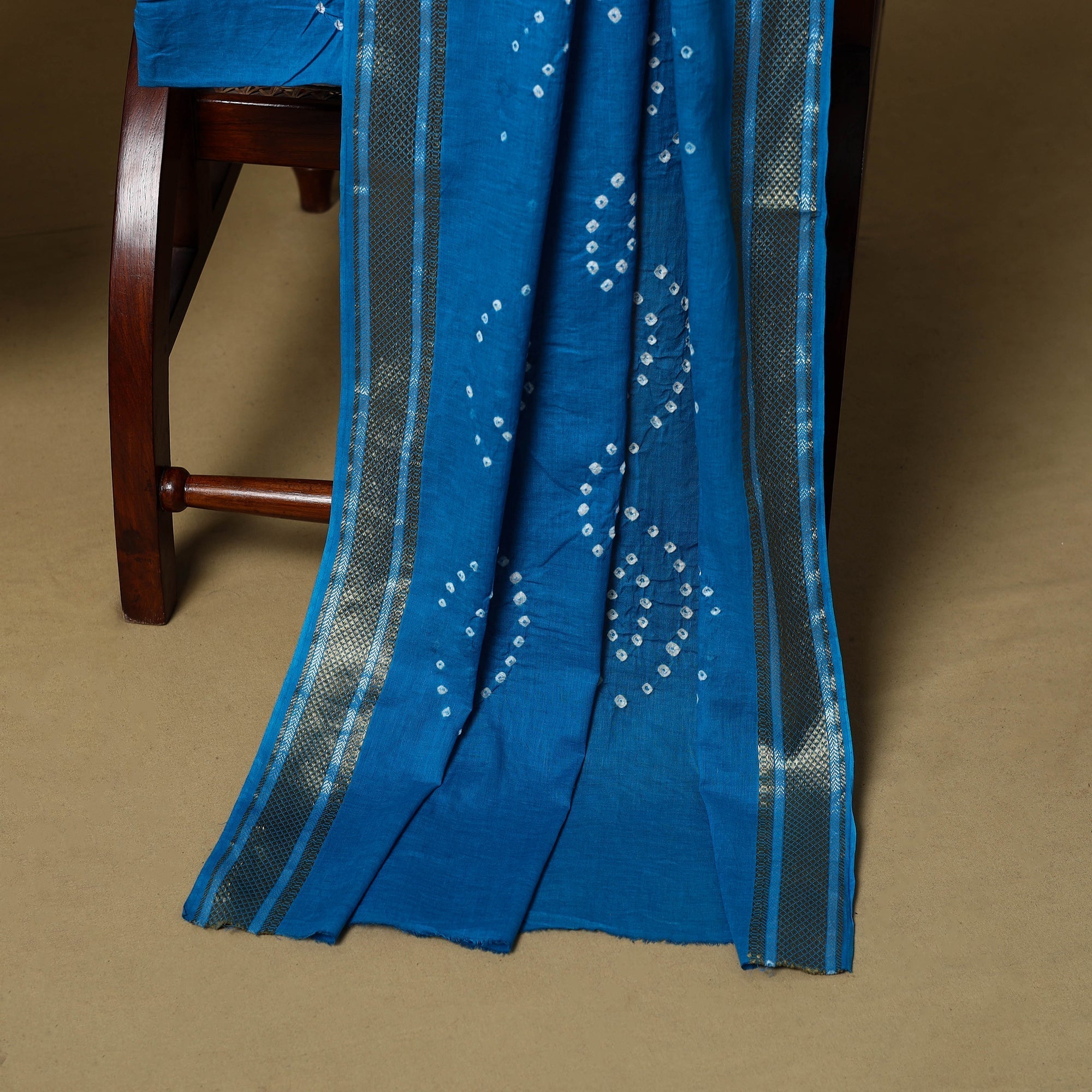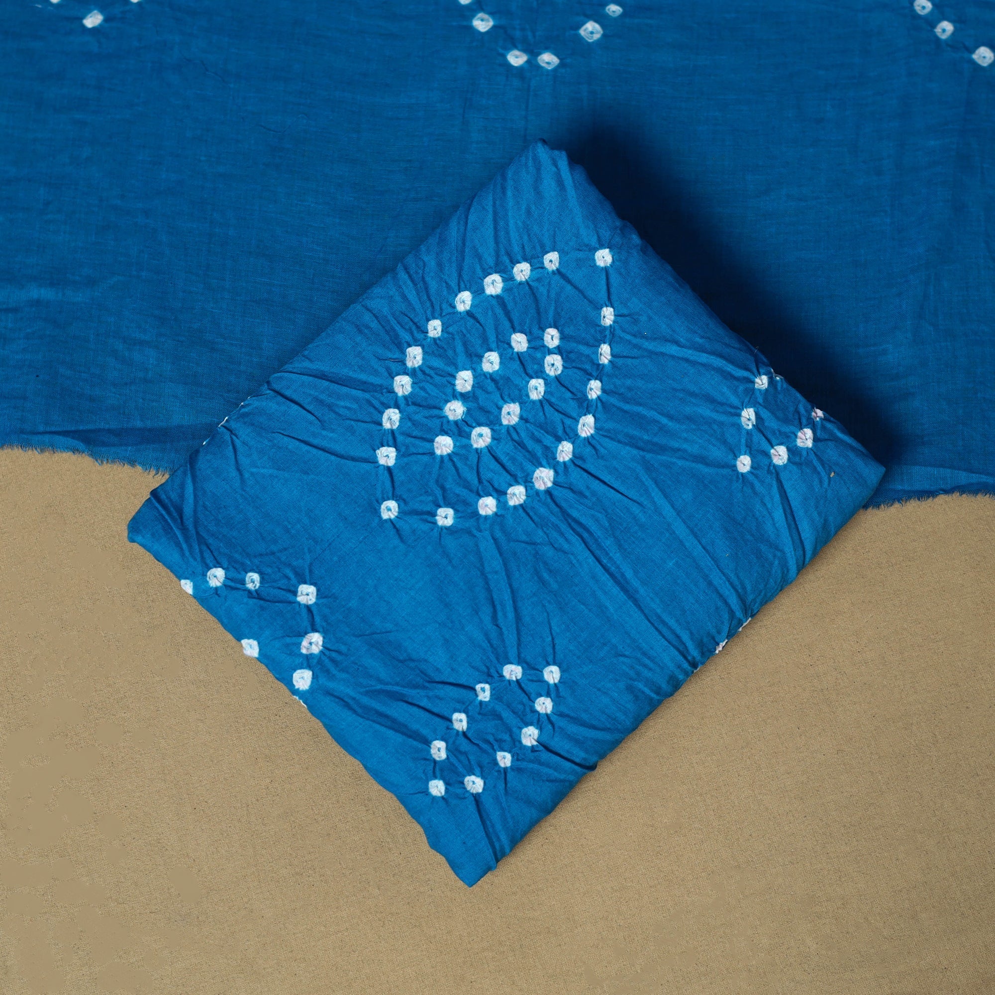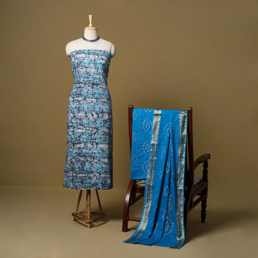Blue 3pc pure cotton unstitched dress material from the Kutch region, showcasing the area’s renowned batik and bandhani techniques. The set includes a Batik kurta fabric along with a Bandhani bottom and dupatta, creating a harmonious blend of two regional styles. Making it suitable for everyday wear or any occasions.