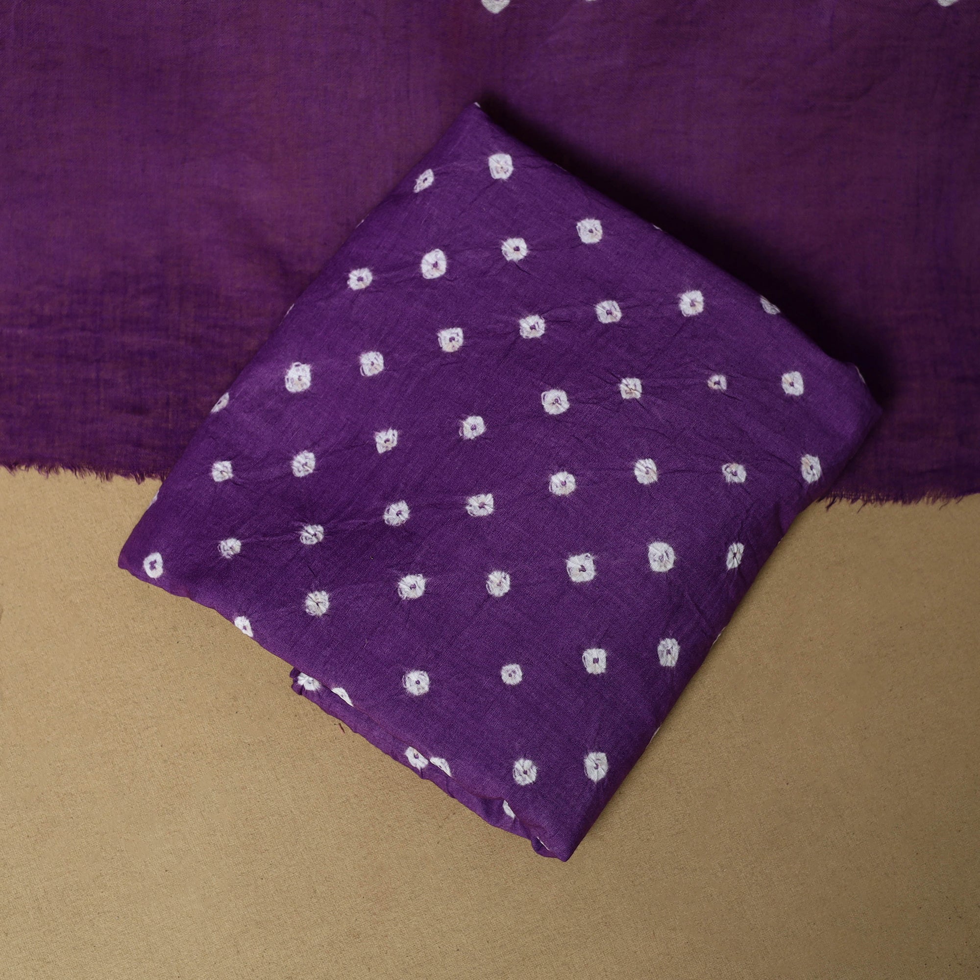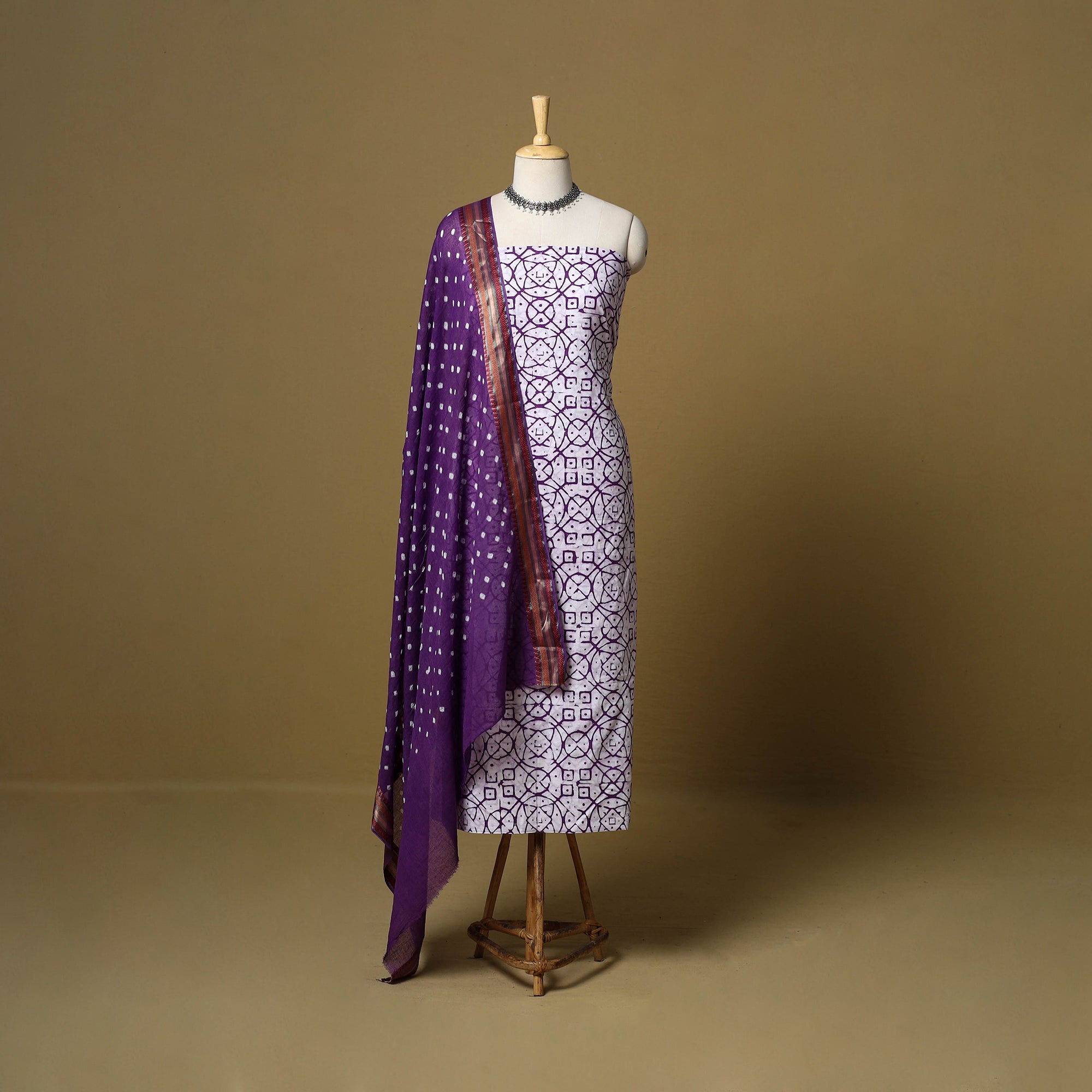 Purple 3pc pure cotton unstitched dress material from the Kutch region, showcasing the area’s renowned batik and bandhani techniques. The set includes a Batik kurta fabric along with a Bandhani bottom and dupatta, creating a harmonious blend of two regional styles. Making it suitable for everyday wear or any occasions.