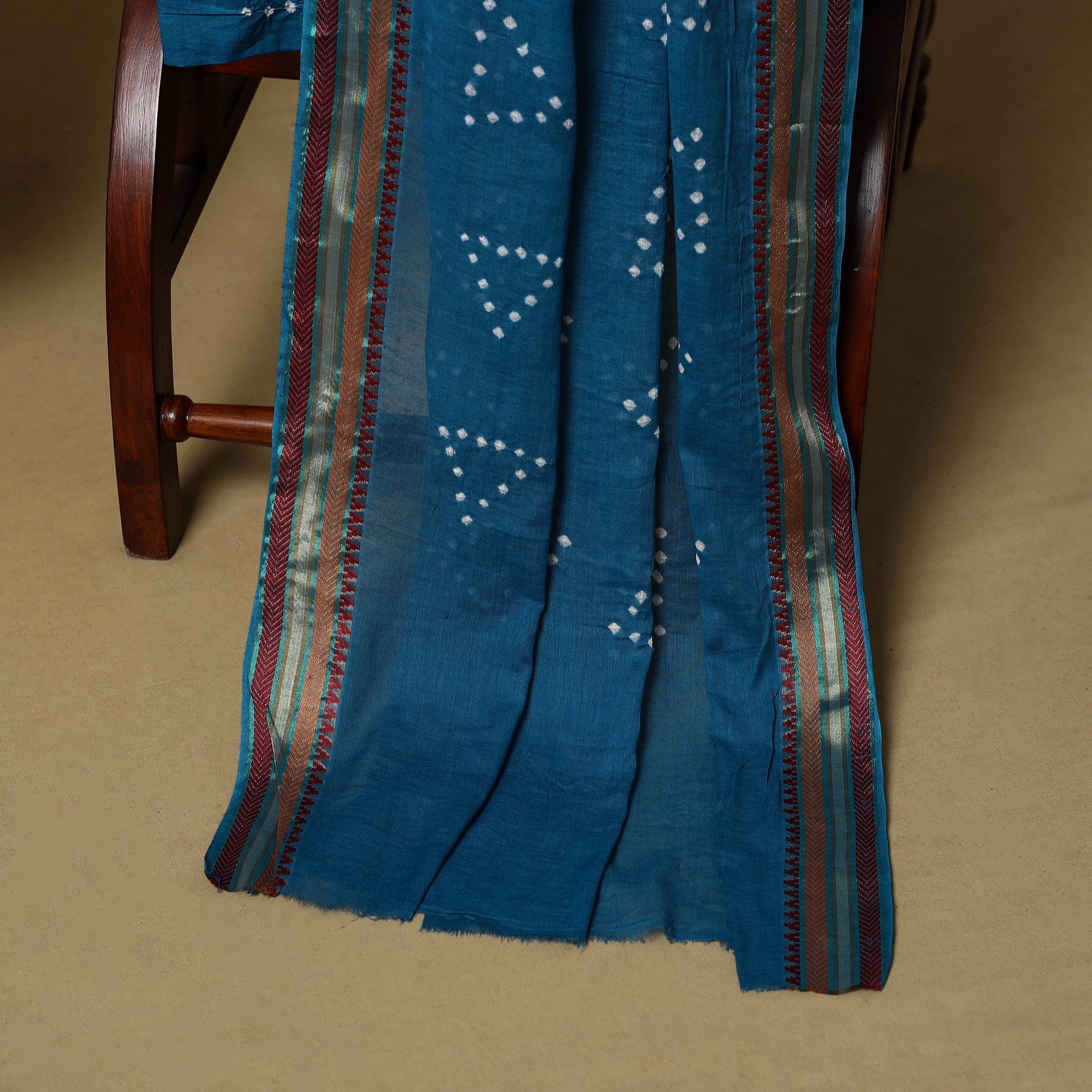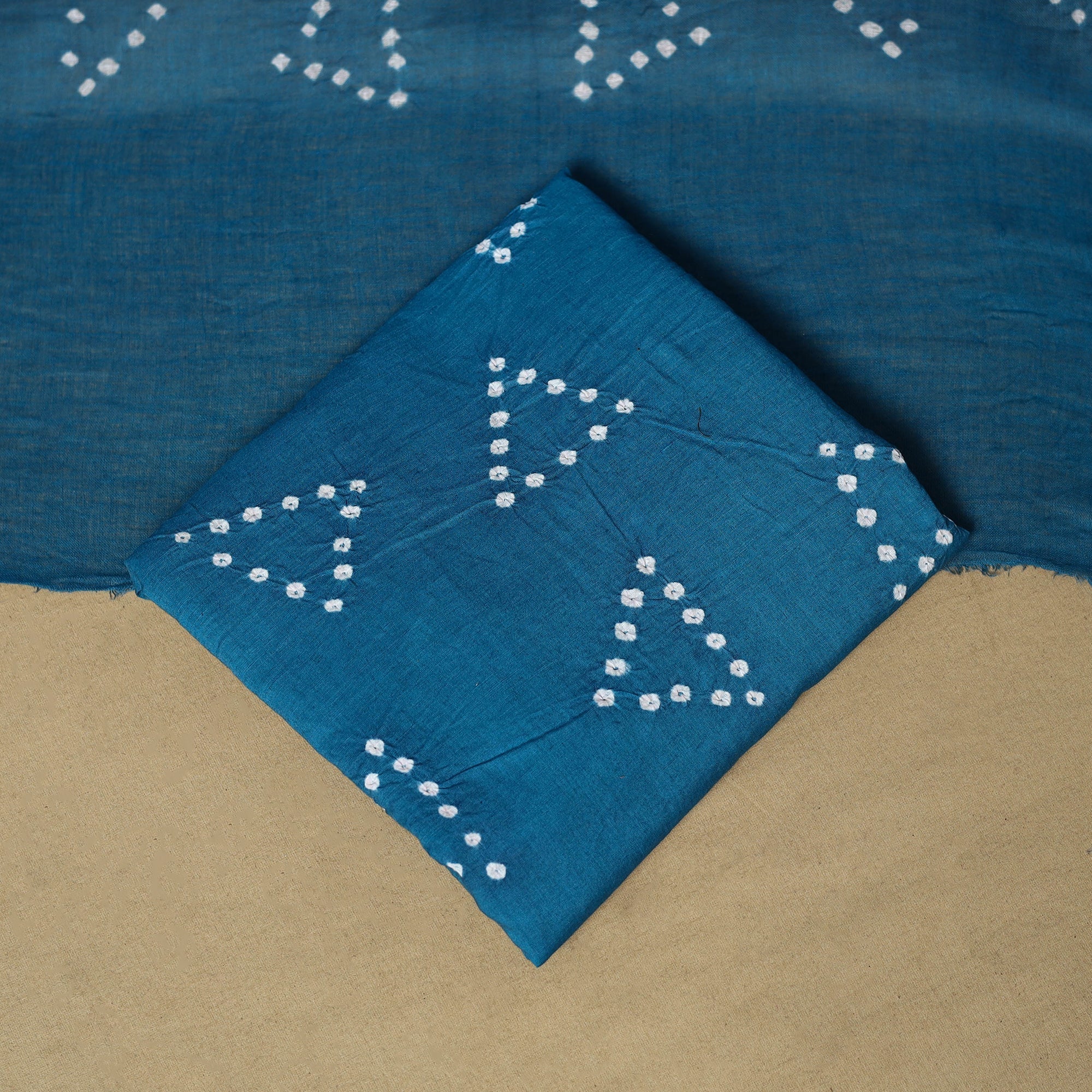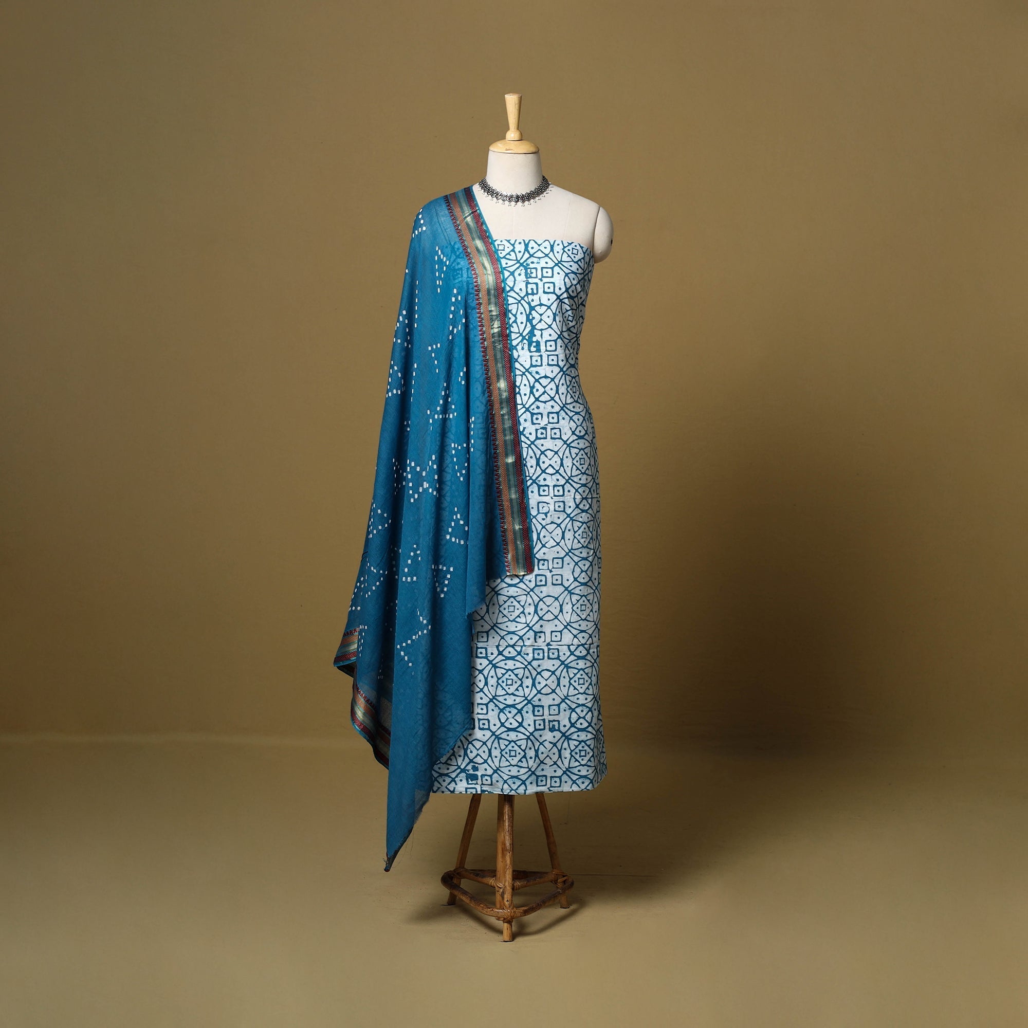 Blue 3pc pure cotton unstitched dress material from the Kutch region, showcasing the area’s renowned batik and bandhani techniques. The set includes a Batik kurta fabric along with a Bandhani bottom and dupatta, creating a harmonious blend of two regional styles. Making it suitable for everyday wear or any occasions.