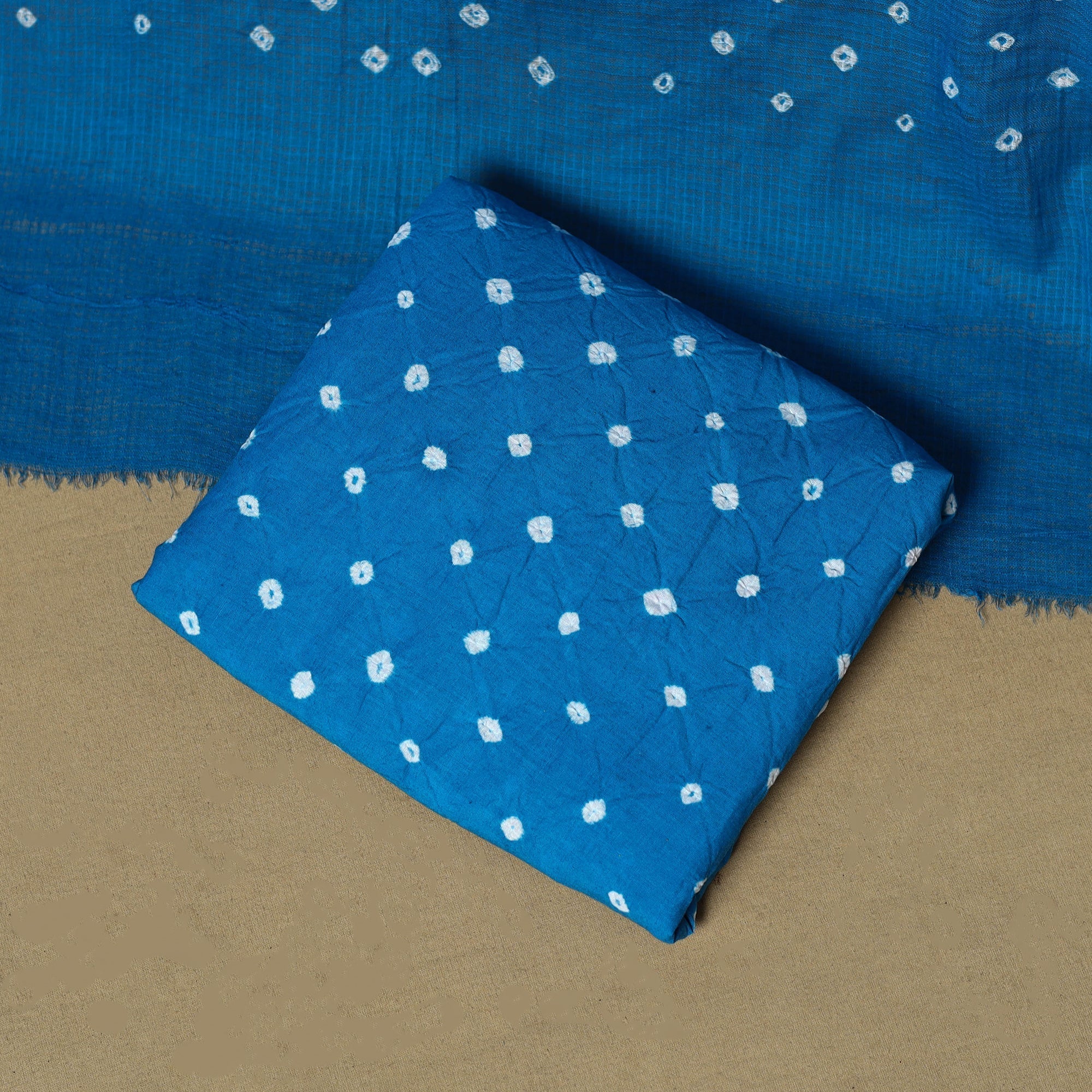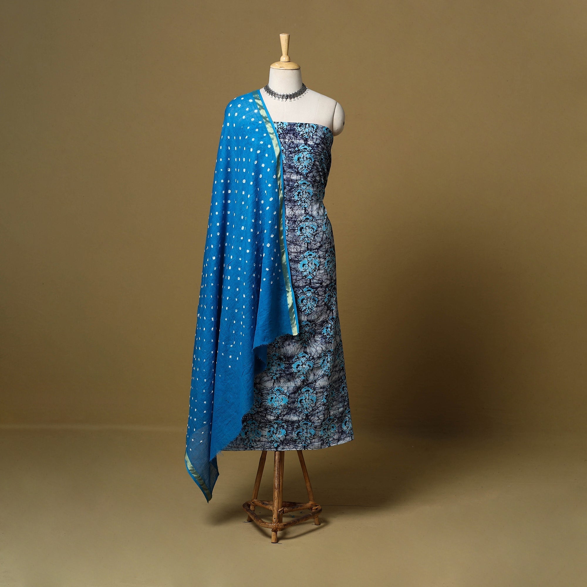 Blue 3pc pure cotton unstitched dress material from the Kutch region, showcasing the area’s renowned batik and bandhani techniques. The set includes a Batik kurta fabric along with a Bandhani bottom and dupatta, creating a harmonious blend of two regional styles. Making it suitable for everyday wear or any occasions.