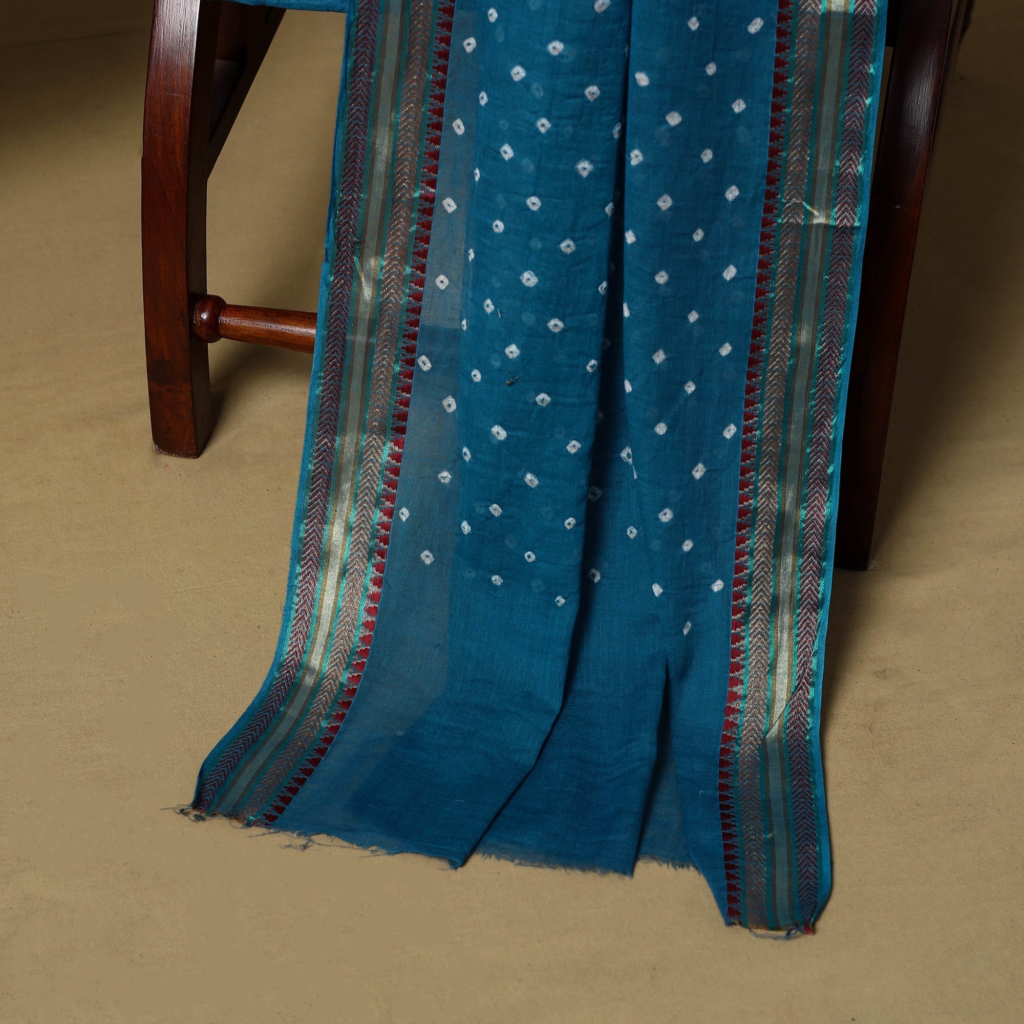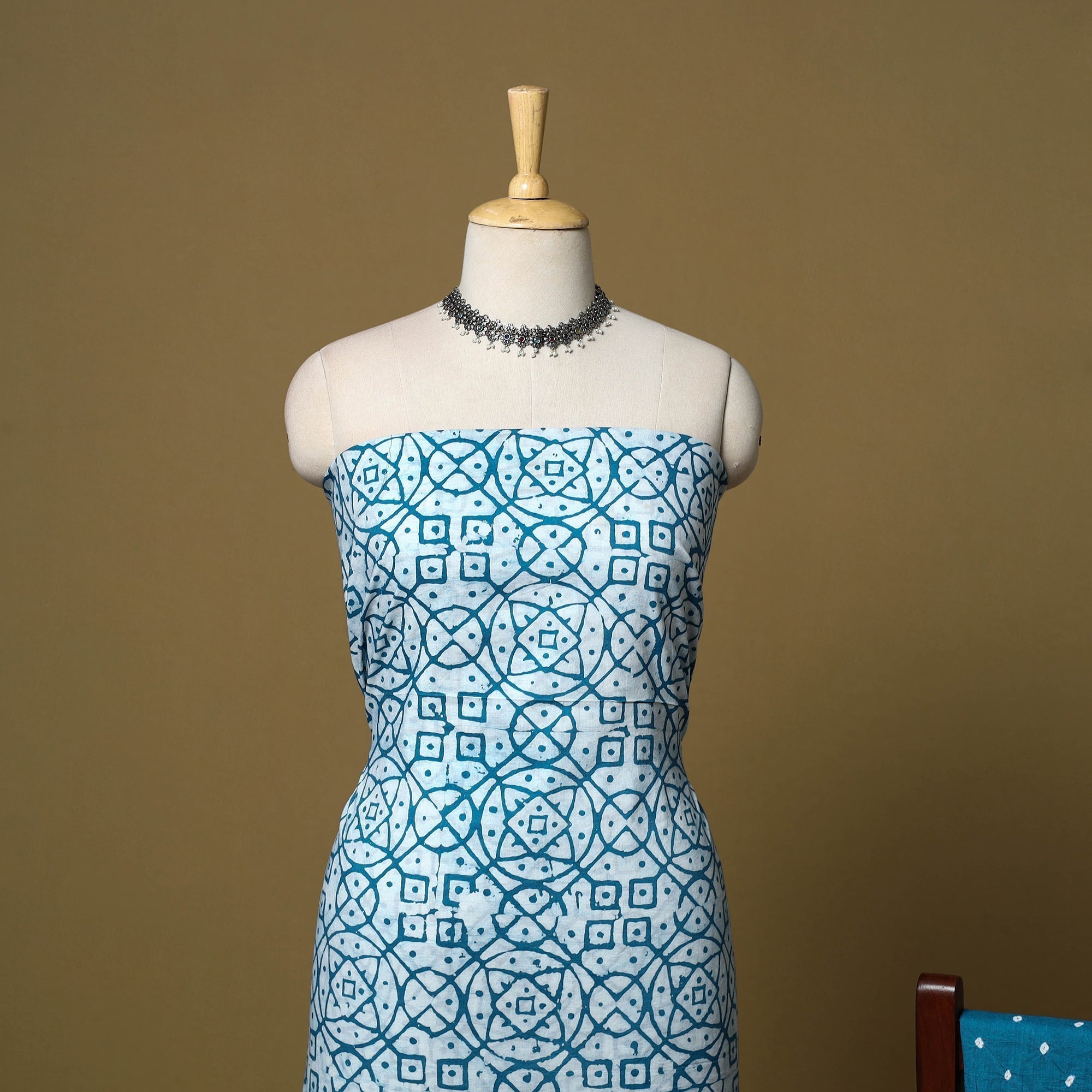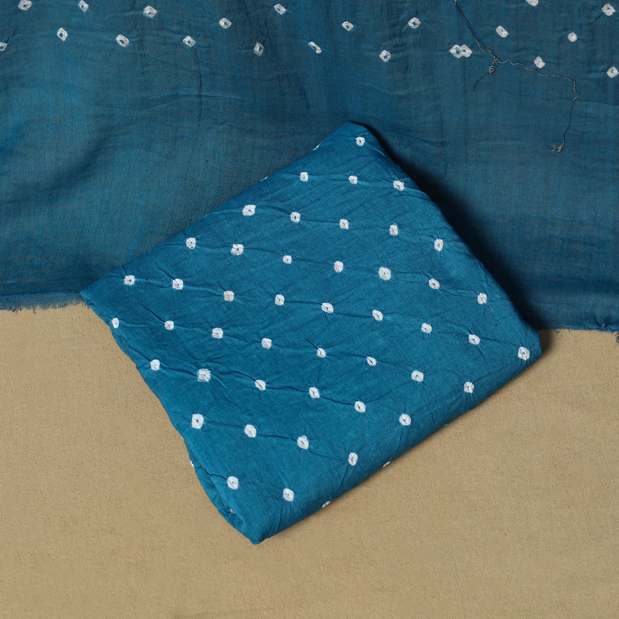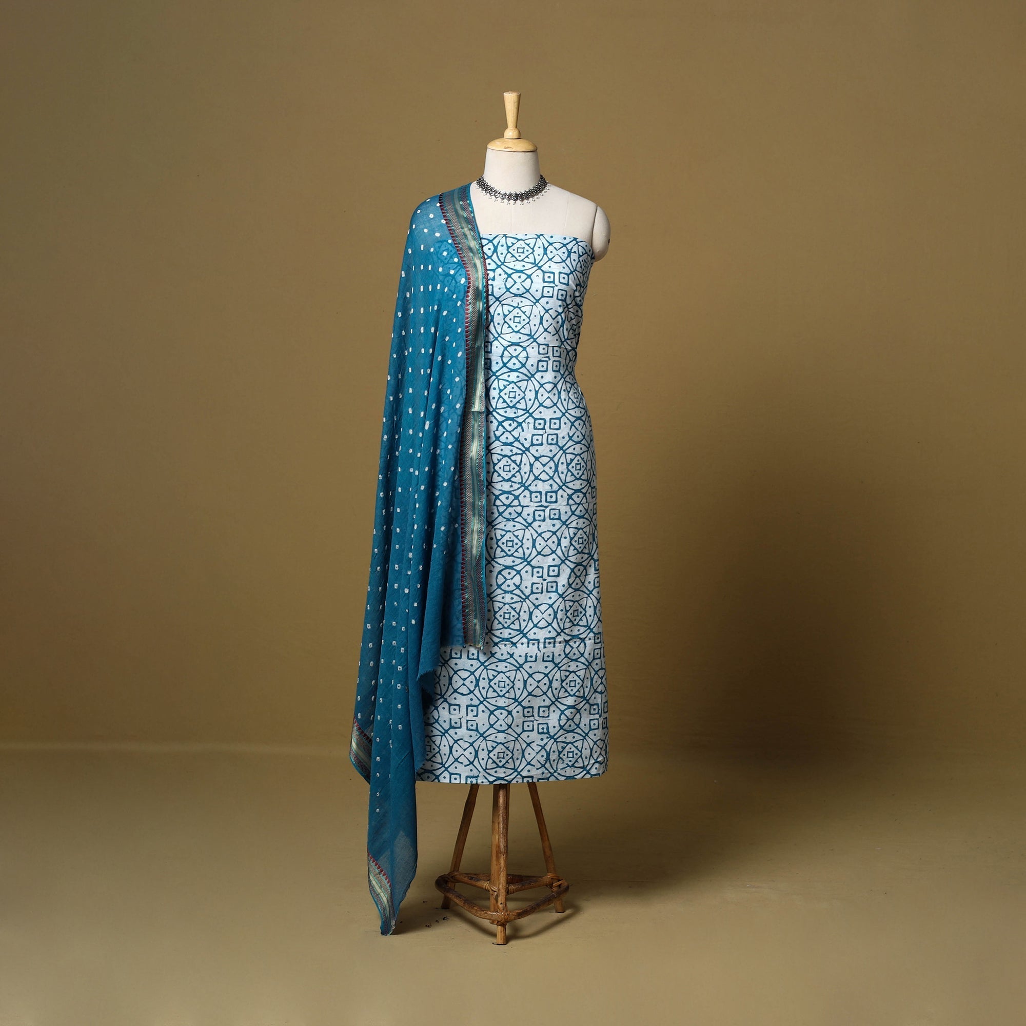 Blue 3pc pure cotton unstitched dress material from the Kutch region, showcasing the area’s renowned batik and bandhani techniques. The set includes a Batik kurta fabric along with a Bandhani bottom and dupatta, creating a harmonious blend of two regional styles. Making it suitable for everyday wear or any occasions.