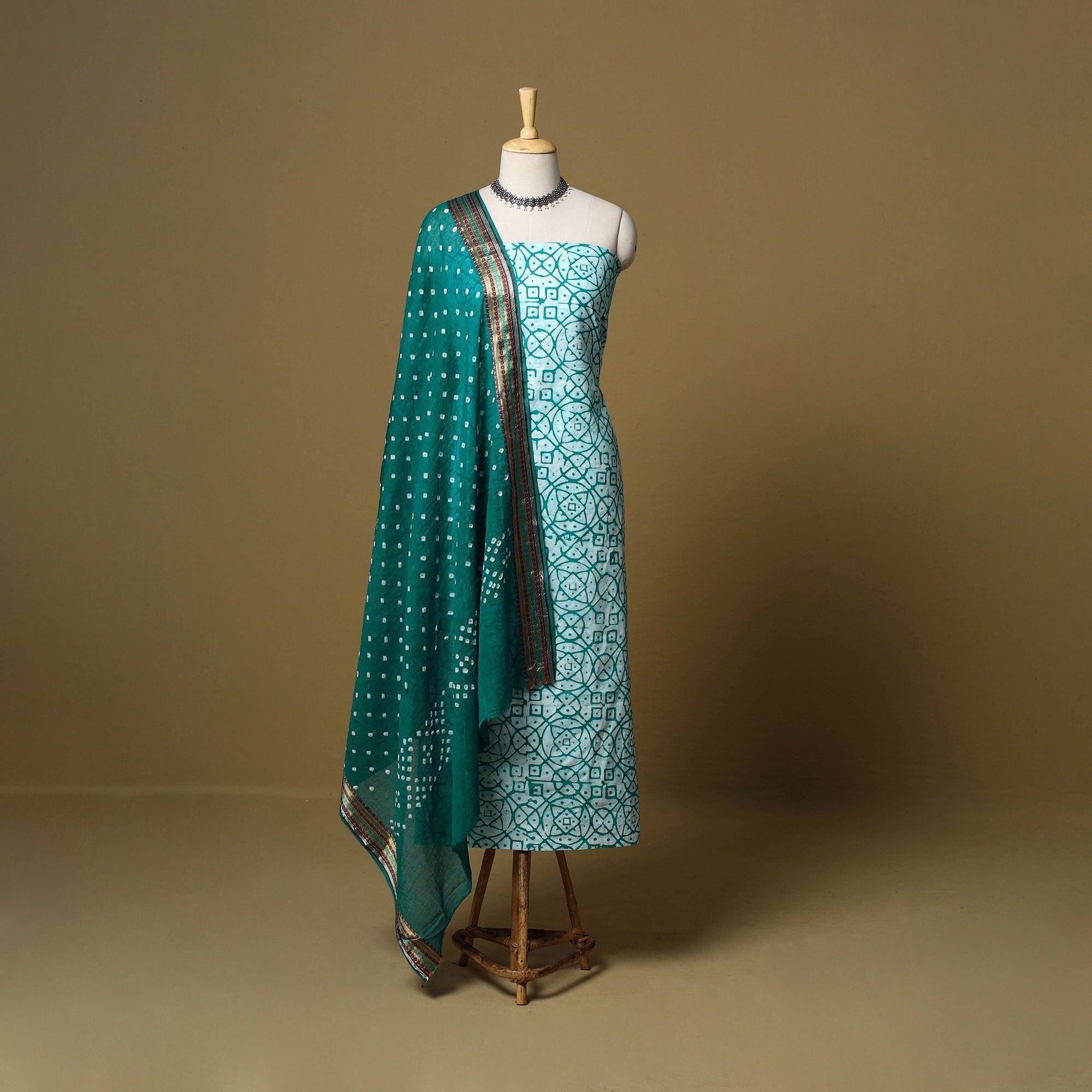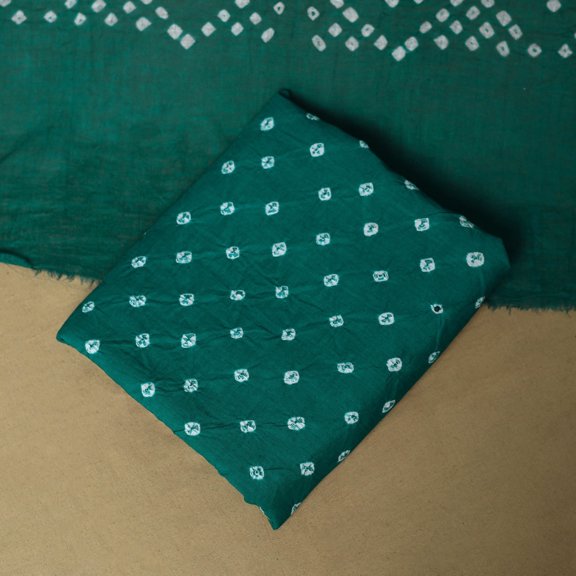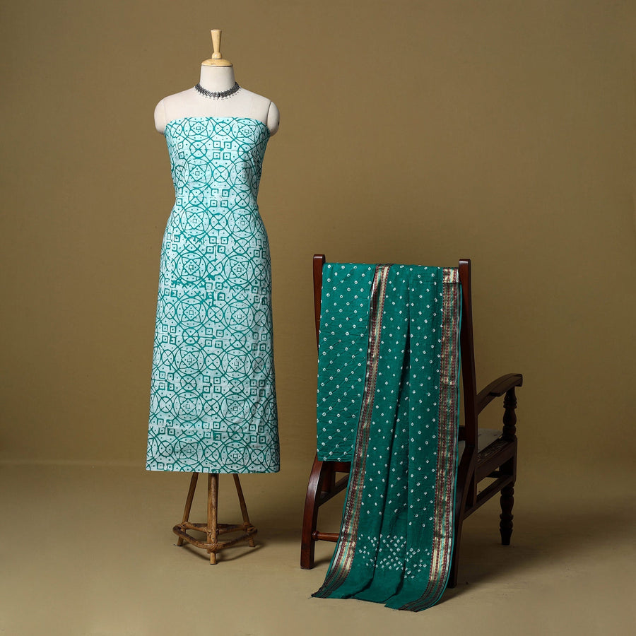 Green 3pc pure cotton unstitched dress material from the Kutch region, showcasing the area’s renowned batik and bandhani techniques. The set includes a Batik kurta fabric along with a Bandhani bottom and dupatta, creating a harmonious blend of two regional styles. Making it suitable for everyday wear or any occasions.