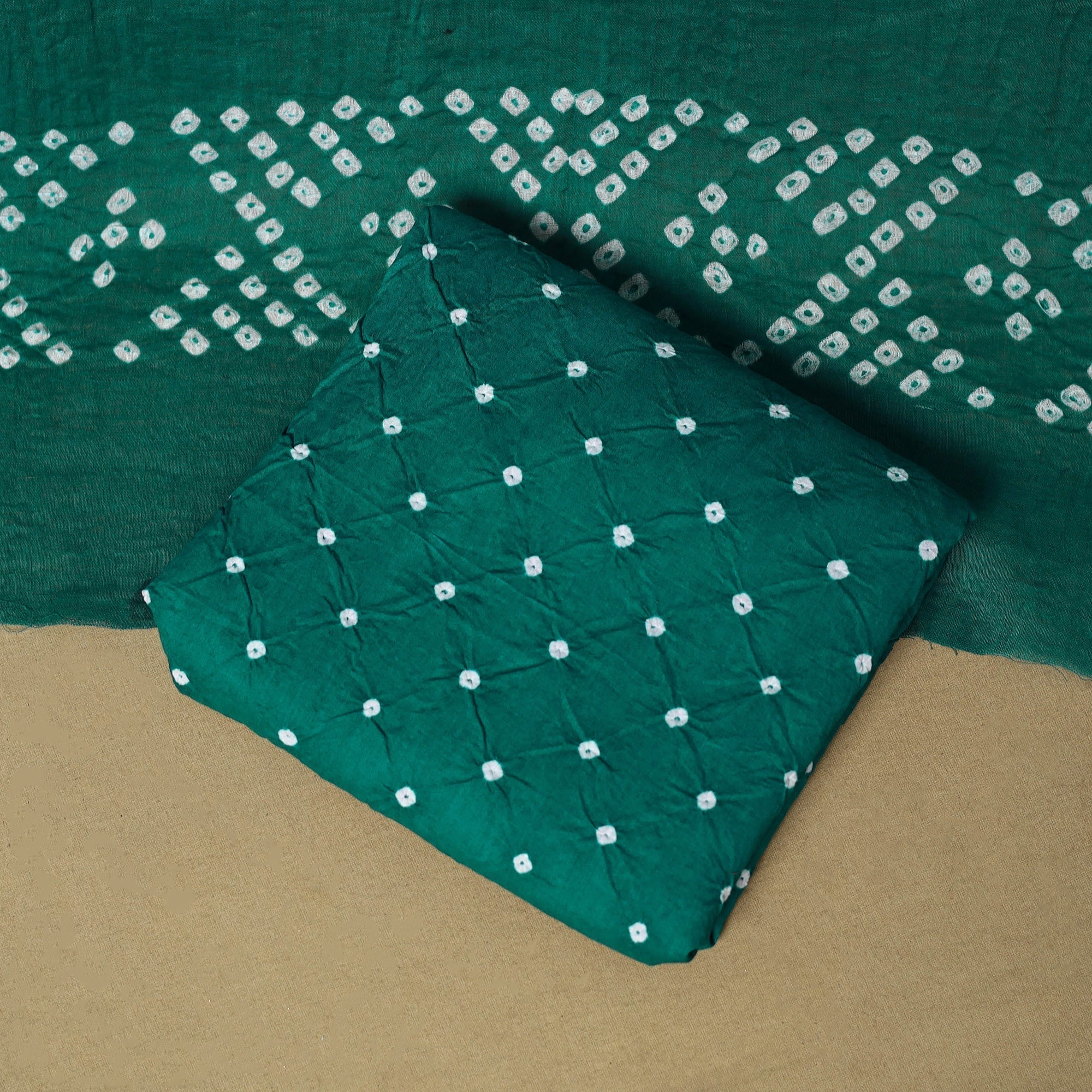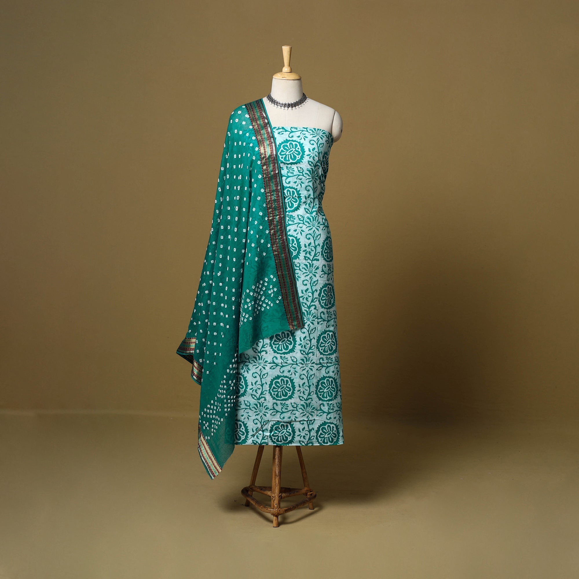 Green 3pc pure cotton unstitched dress material from the Kutch region, showcasing the area’s renowned batik and bandhani techniques. The set includes a Batik kurta fabric along with a Bandhani bottom and dupatta, creating a harmonious blend of two regional styles. Making it suitable for everyday wear or any occasions.