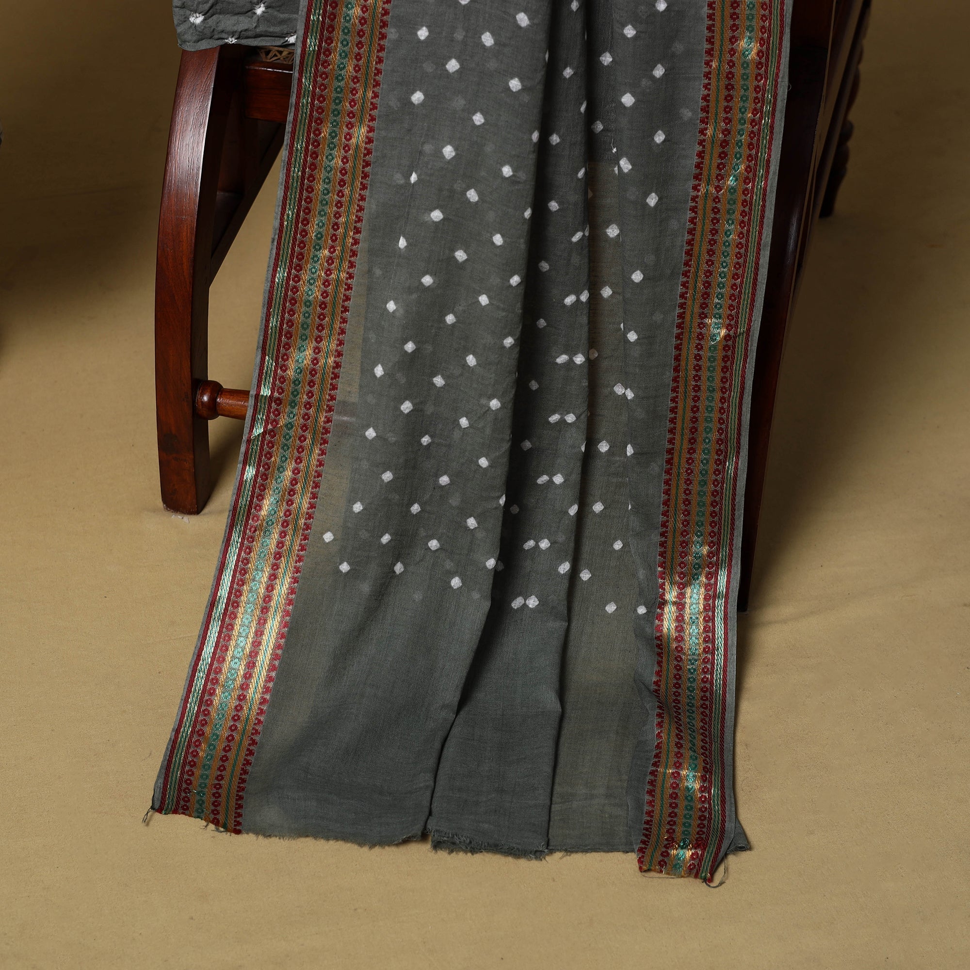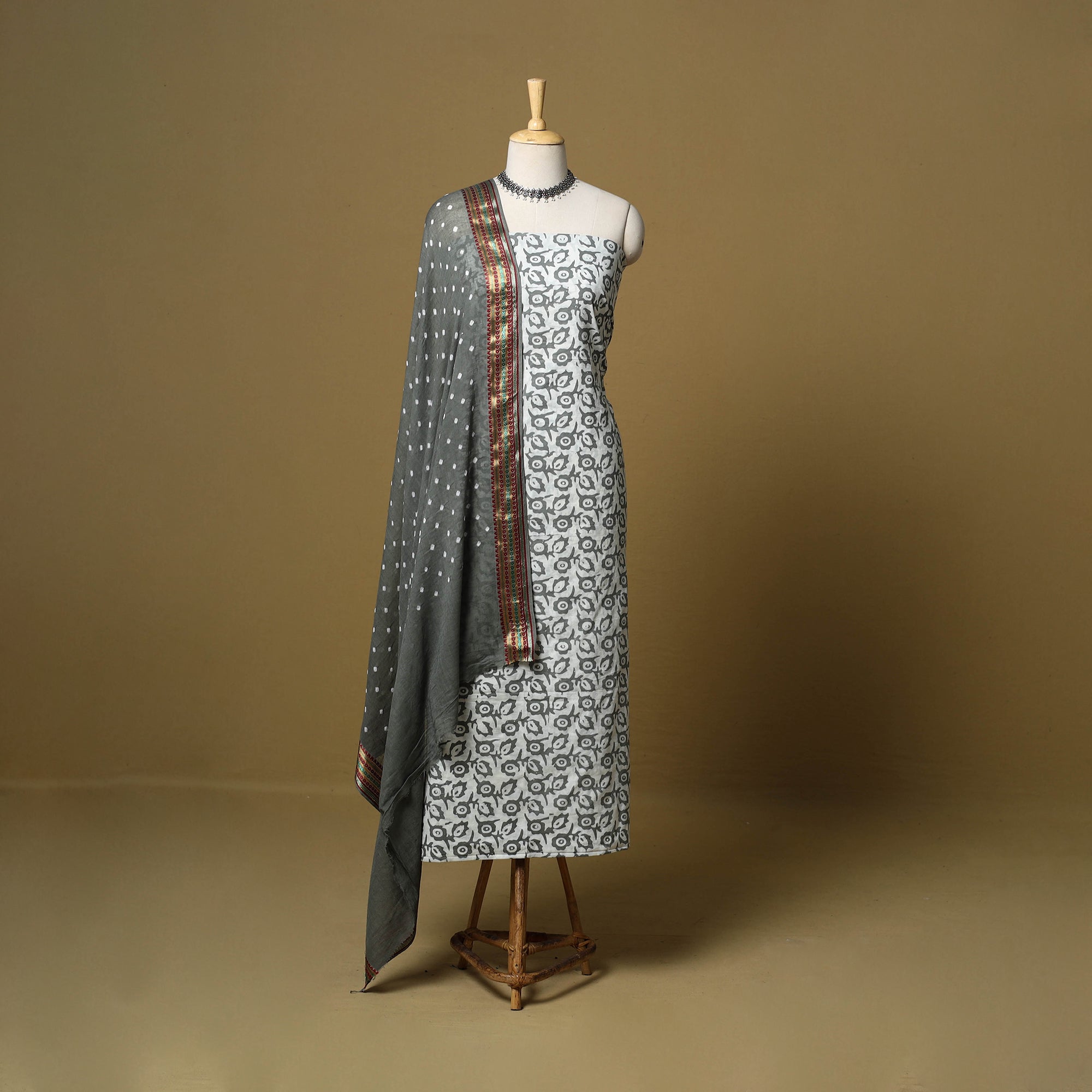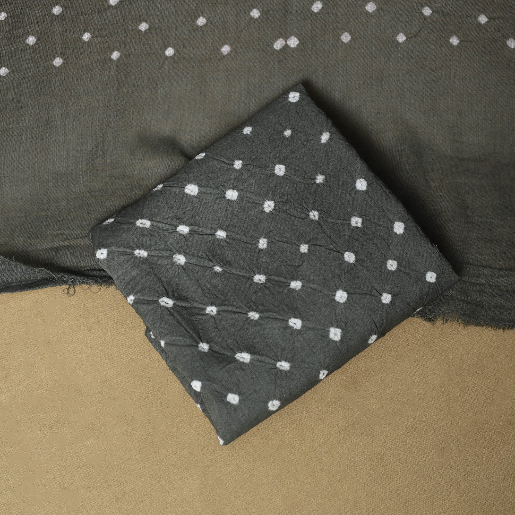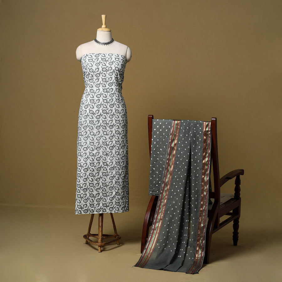Grey 3pc pure cotton unstitched dress material from the Kutch region, showcasing the area’s renowned batik and bandhani techniques. The set includes a Batik kurta fabric along with a Bandhani bottom and dupatta, creating a harmonious blend of two regional styles. Making it suitable for everyday wear or any occasions.