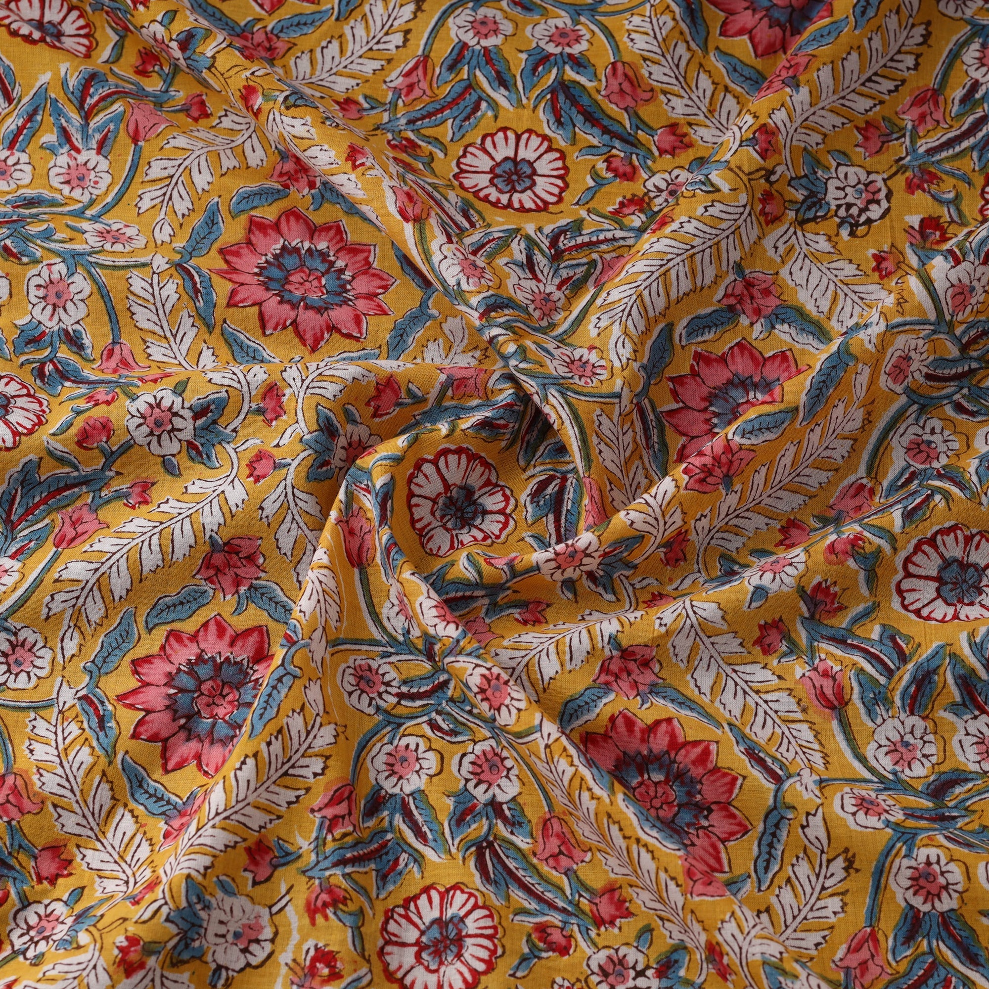 Yellow sanganeri hand block print cotton fabric from Sanganer, Jaipur, Rajasthan by master artisans. This centuries-old printing technique has been practiced for over 500 years and is known for its fine detailing and delicate floral patterns. The designs are printed using traditional hand-carved wooden blocks and bleed-free VAT dyes. The breathable, lightweight cotton fabric is ideal for making kurtas, dresses, tunics, as well as home decor items like cushions and curtains.