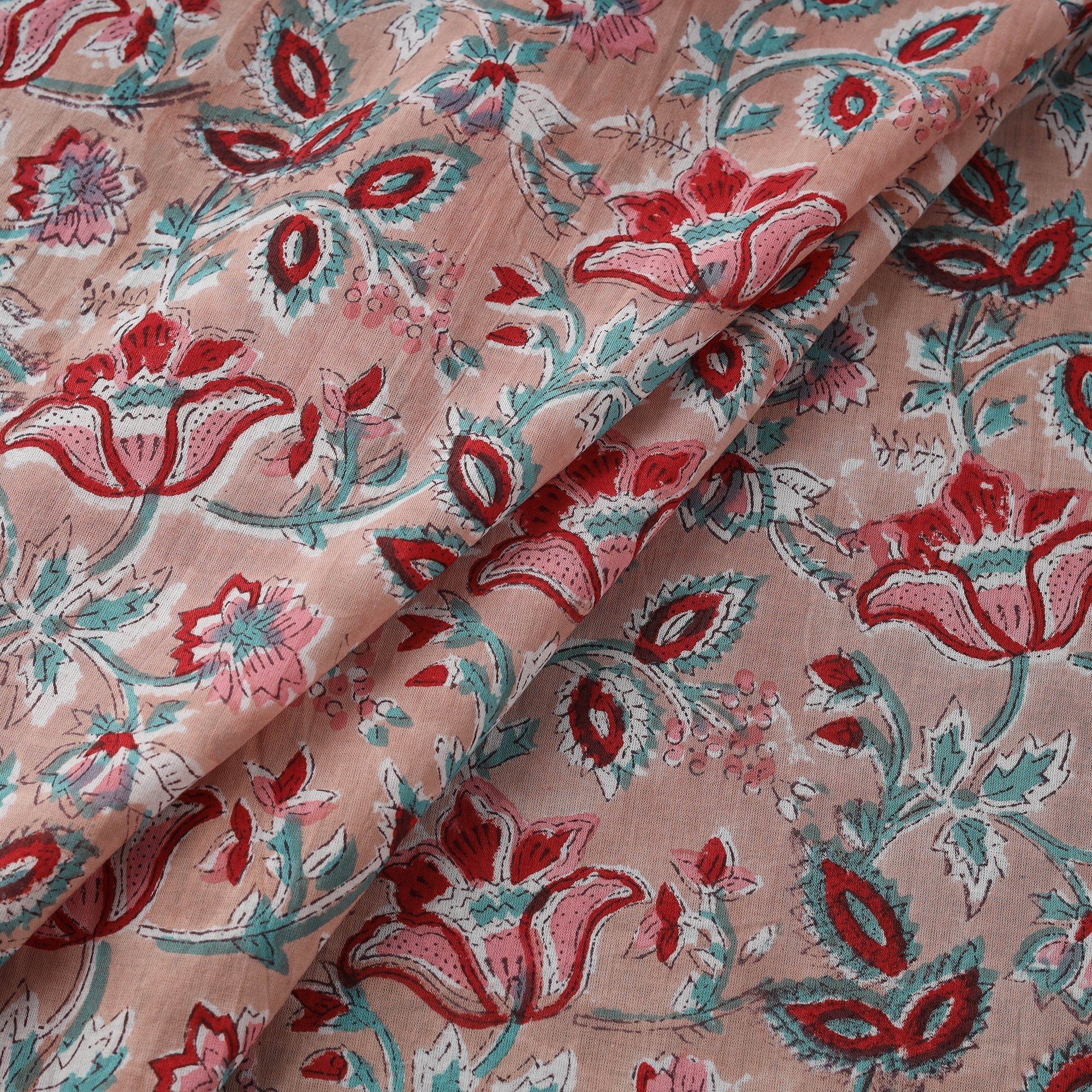 Hand block printed cotton fabric from Rajasthan is crafted by skilled artisans and features sanganeri motifs. Sanganeri hand block printing is a centuries-old technique, practiced for over 500 years, known for its fine detailing and floral patterns. Dyed using bleed-free VAT colours, it is lightweight and elegant, making it ideal for creating thoughtful apparel or home decor.