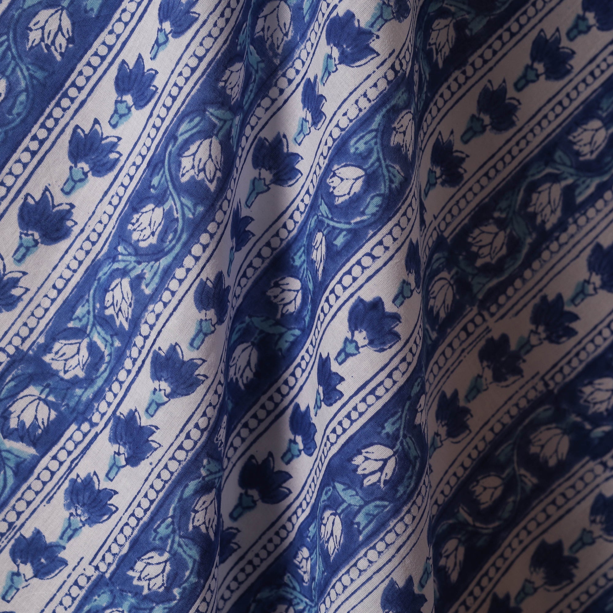 Blue pure cotton sanganeri fabric captures the charm of Rajasthan’s block printing heritage. Crafted using hand-carved wooden blocks, artisans create intricate floral patterns. Perfect for making kurtas, dresses, tunics or charming home accents like cushions and curtains, this soft, airy cotton ensures both style and comfort.