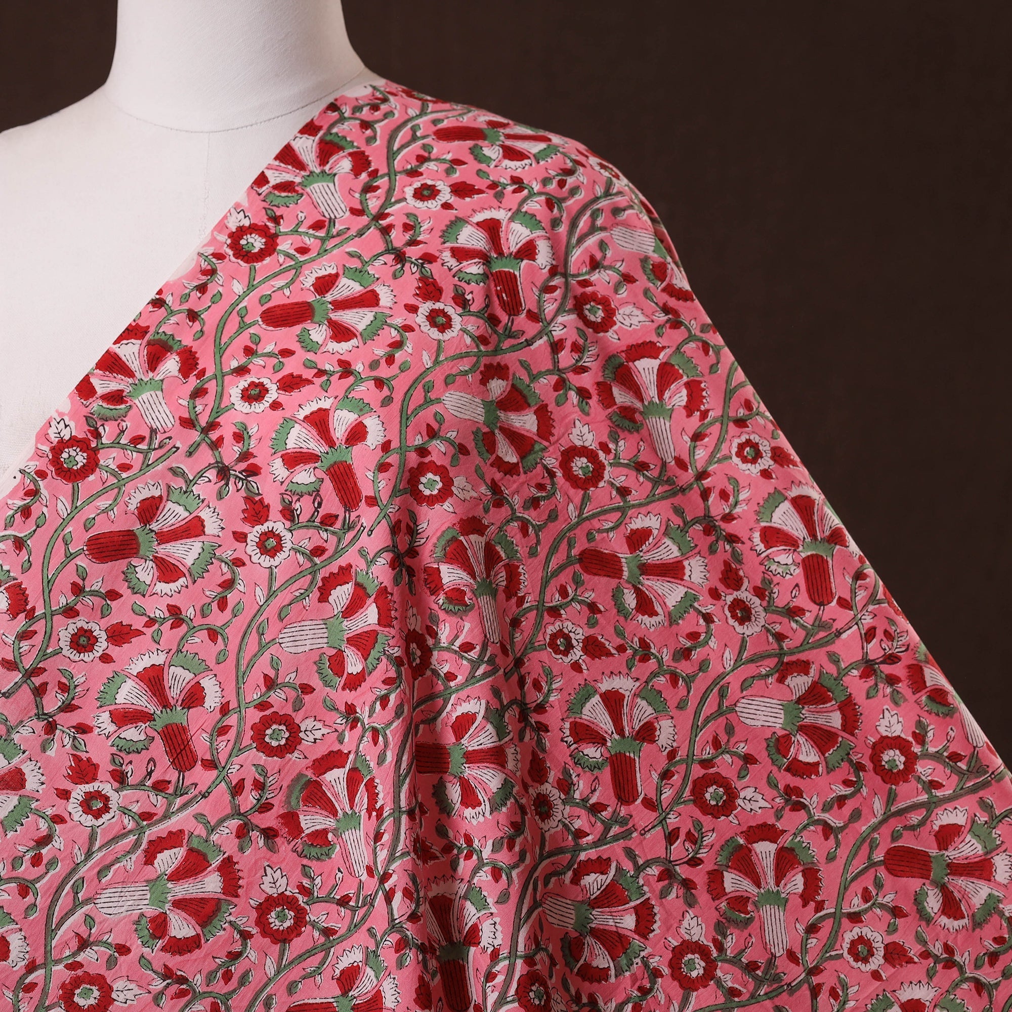 Pink pure cotton sanganeri fabric captures the charm of Rajasthan’s block printing heritage. Crafted using hand-carved wooden blocks, artisans create intricate floral patterns. Perfect for making kurtas, dresses, tunics or charming home accents like cushions and curtains, this soft, airy cotton ensures both style and comfort.