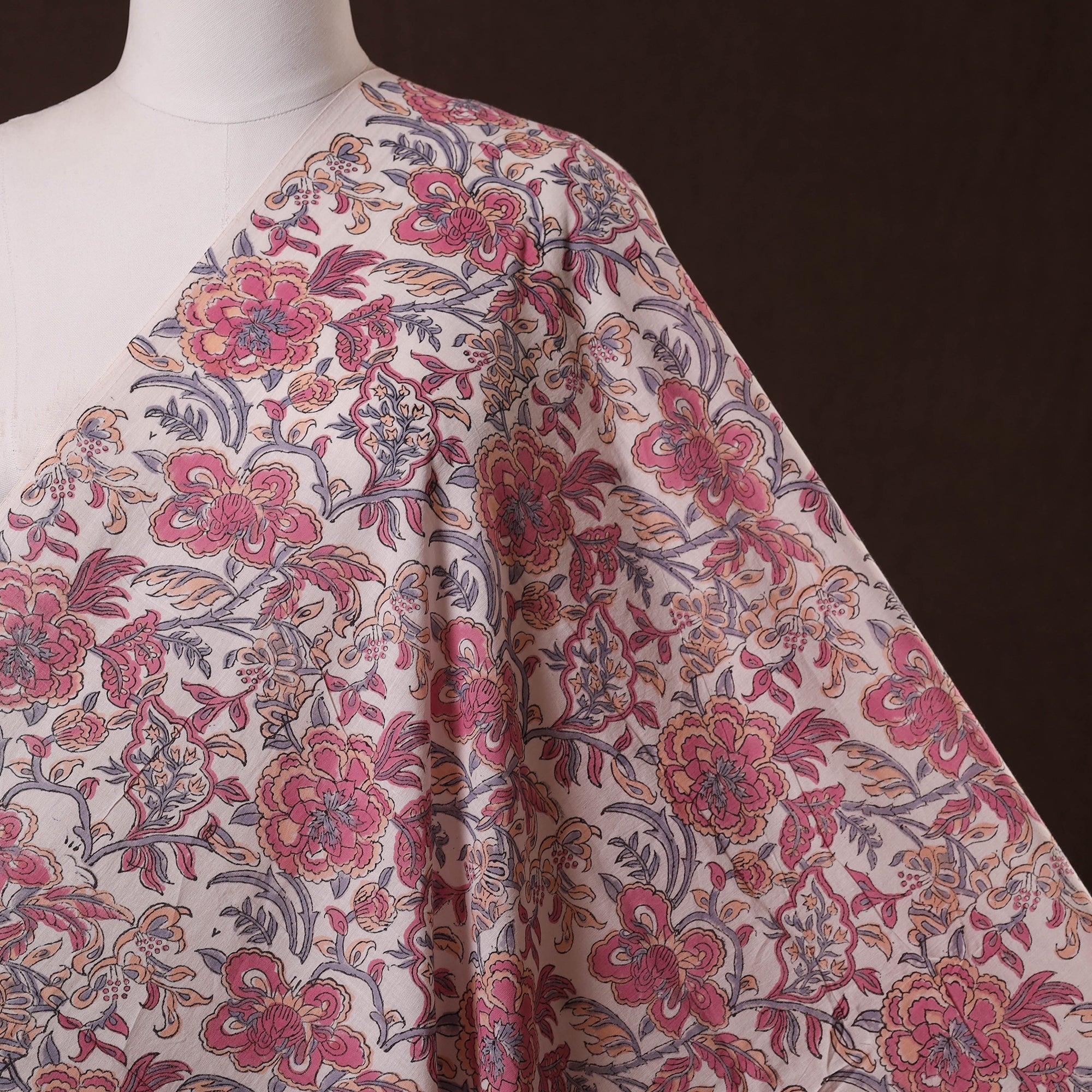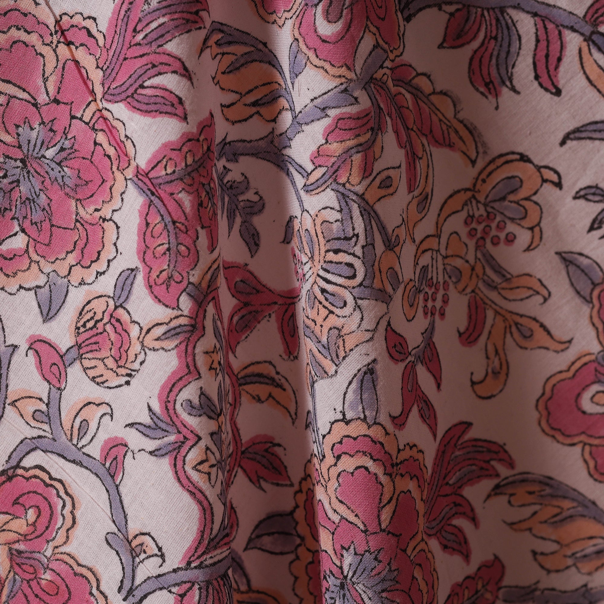 Pink pure cotton sanganeri fabric captures the charm of Rajasthan’s block printing heritage. Crafted using hand-carved wooden blocks, artisans create intricate floral patterns. Perfect for making kurtas, dresses, tunics or charming home accents like cushions and curtains, this soft, airy cotton ensures both style and comfort.