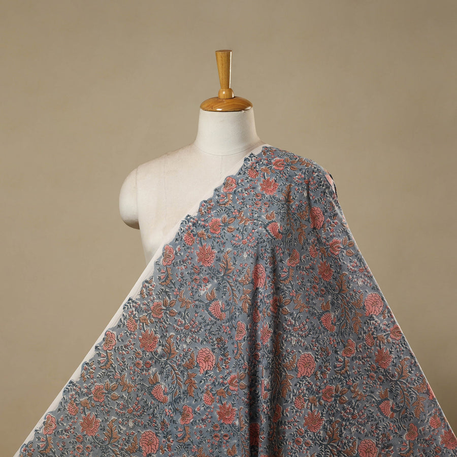 Grey sanganeri hand block print cotton fabric from Sanganer, Jaipur, Rajasthan by master artisans. This centuries-old printing technique has been practiced for over 500 years and is known for its fine detailing and delicate floral patterns. The designs are printed using traditional hand-carved wooden blocks and bleed-free VAT dyes. The breathable, lightweight cotton fabric is ideal for making kurtas, dresses, tunics, as well as home decor items like cushions and curtains.