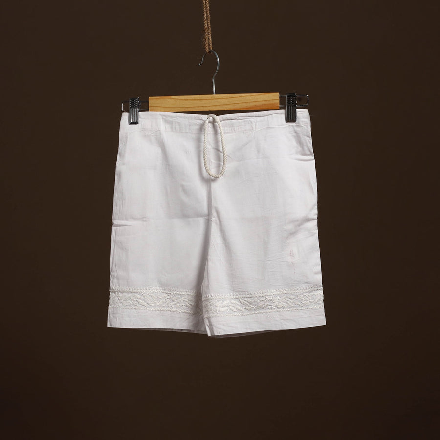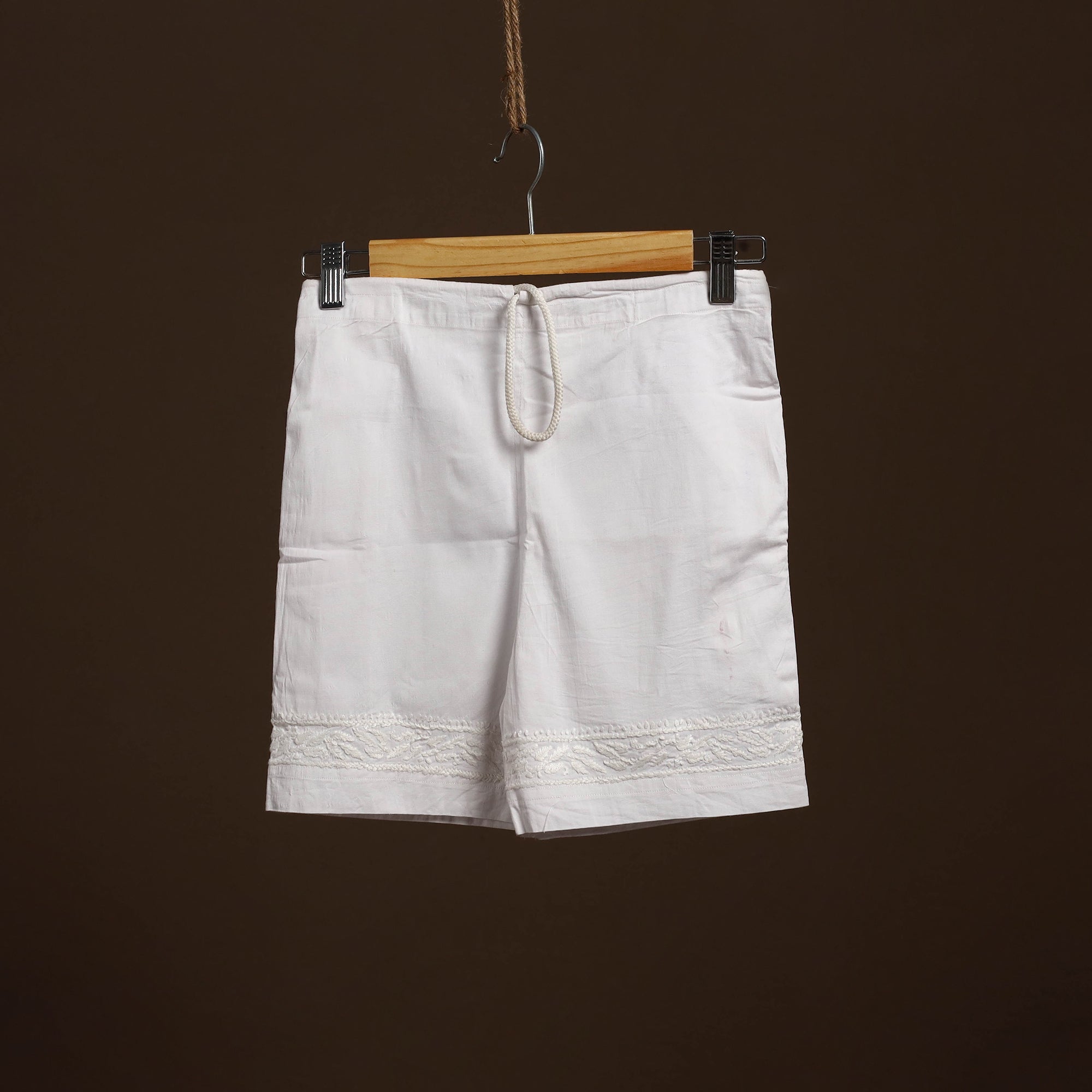 This white cotton short features traditional chikankari hand embroidery from Lucknow, adding refined detailing to a casual essential. Made from soft, durable cotton, it includes a comfortable inner waistband and a side pocket for everyday convenience. Perfect for relaxed days or casual outings.