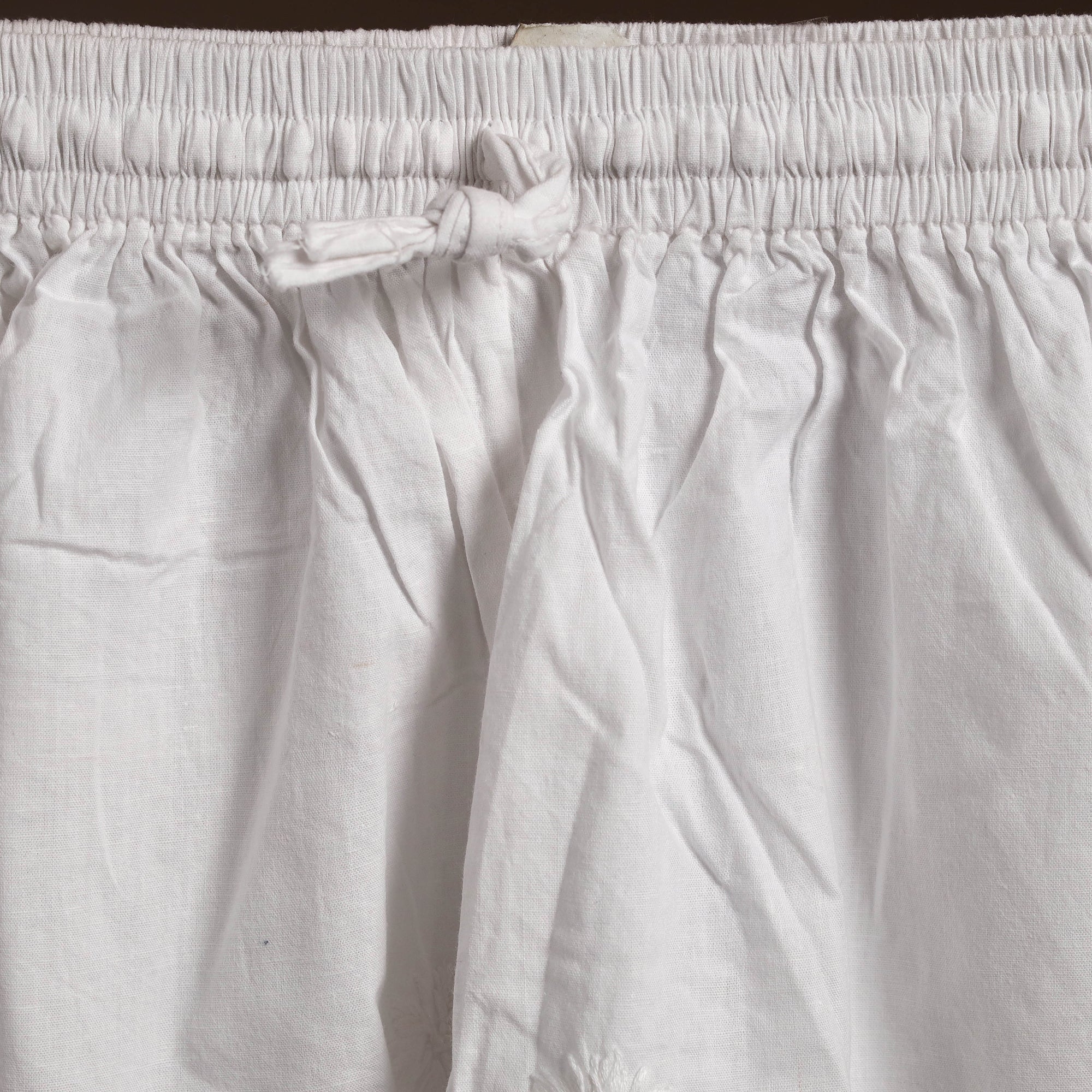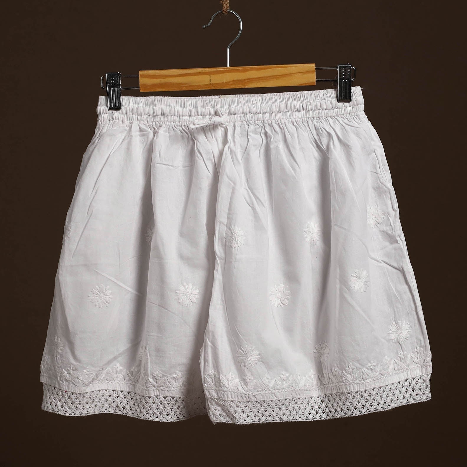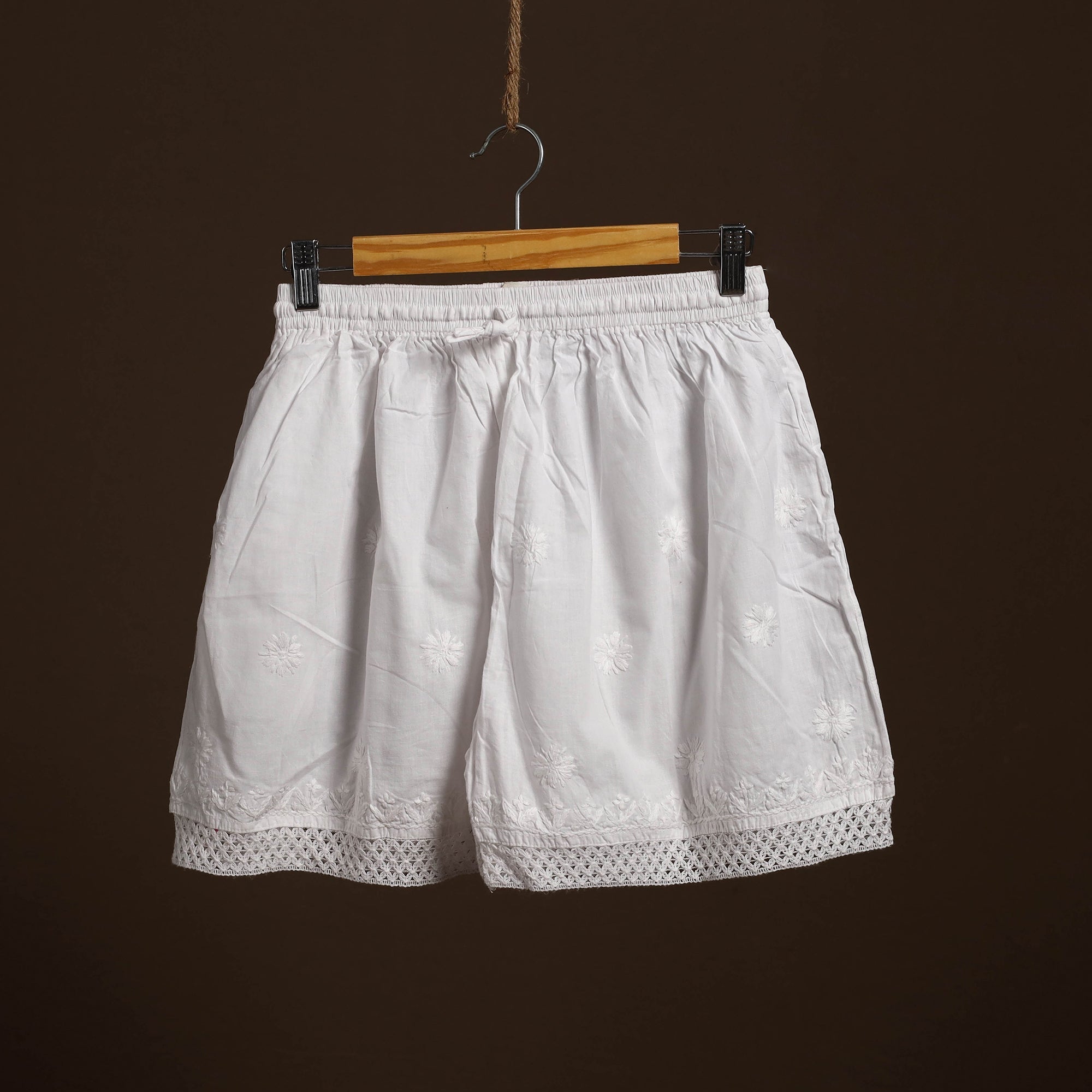 This white cotton short features traditional chikankari hand embroidery from Lucknow, adding refined detailing to a casual essential. Made from soft, durable cotton, it includes a comfortable inner waistband and a side pocket for everyday convenience. Perfect for relaxed days or casual outings.
