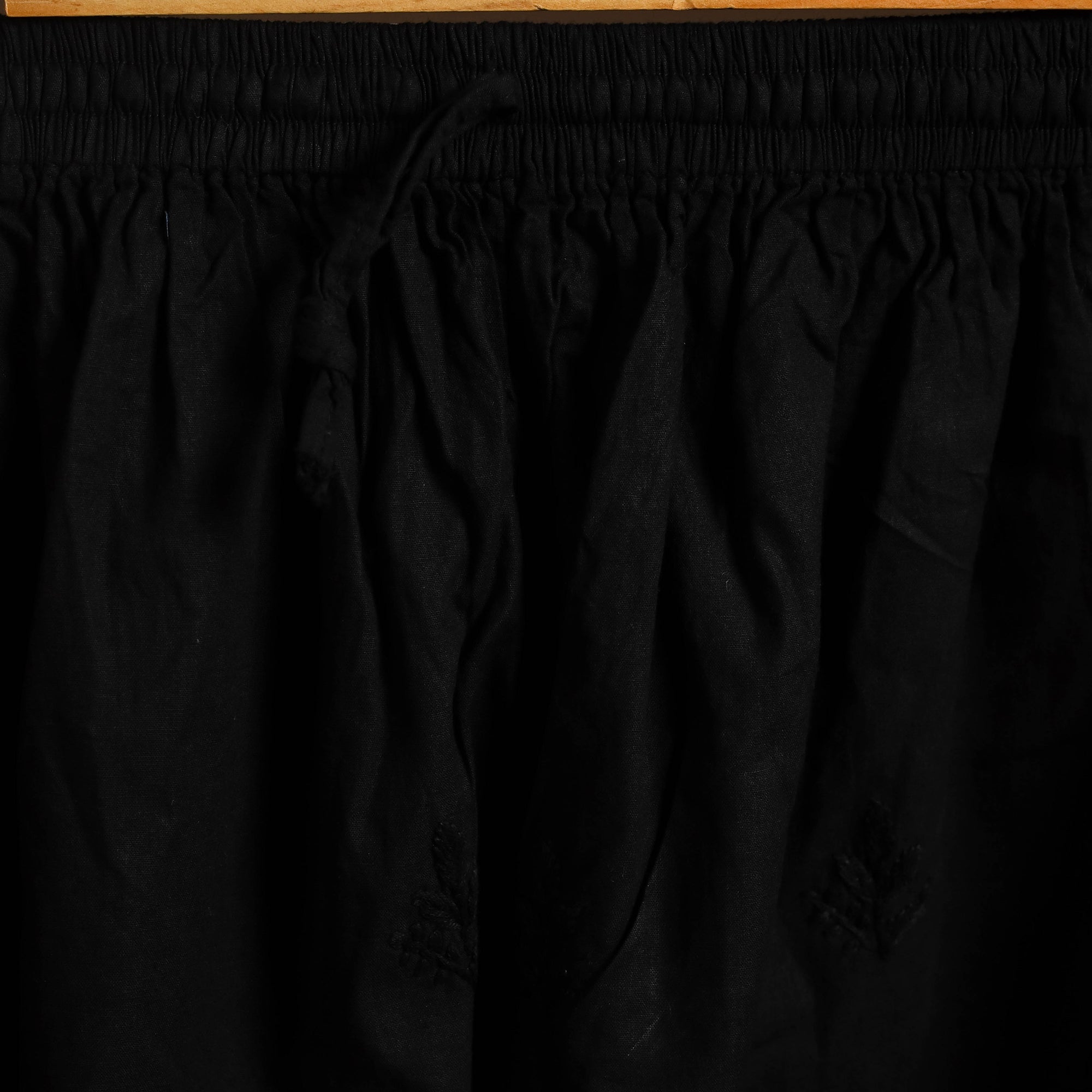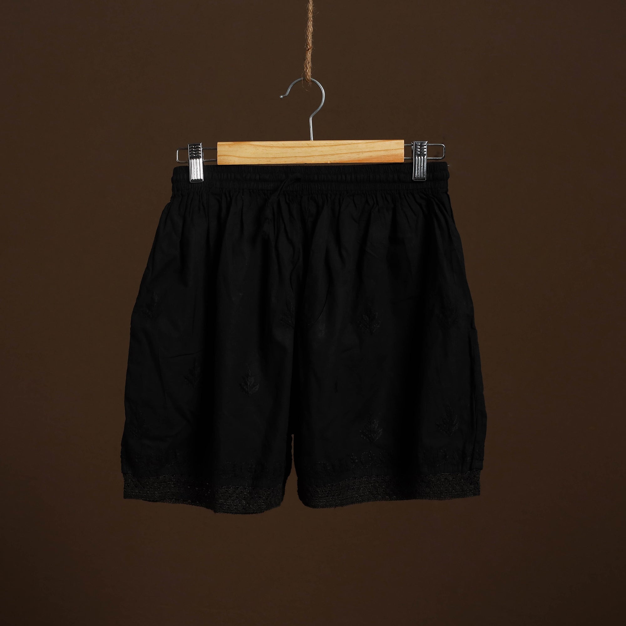 This black cotton short features traditional chikankari hand embroidery from Lucknow, adding refined detailing to a casual essential. Made from soft, durable cotton, it includes a comfortable inner waistband and a side pocket for everyday convenience. Perfect for relaxed days or casual outings.
