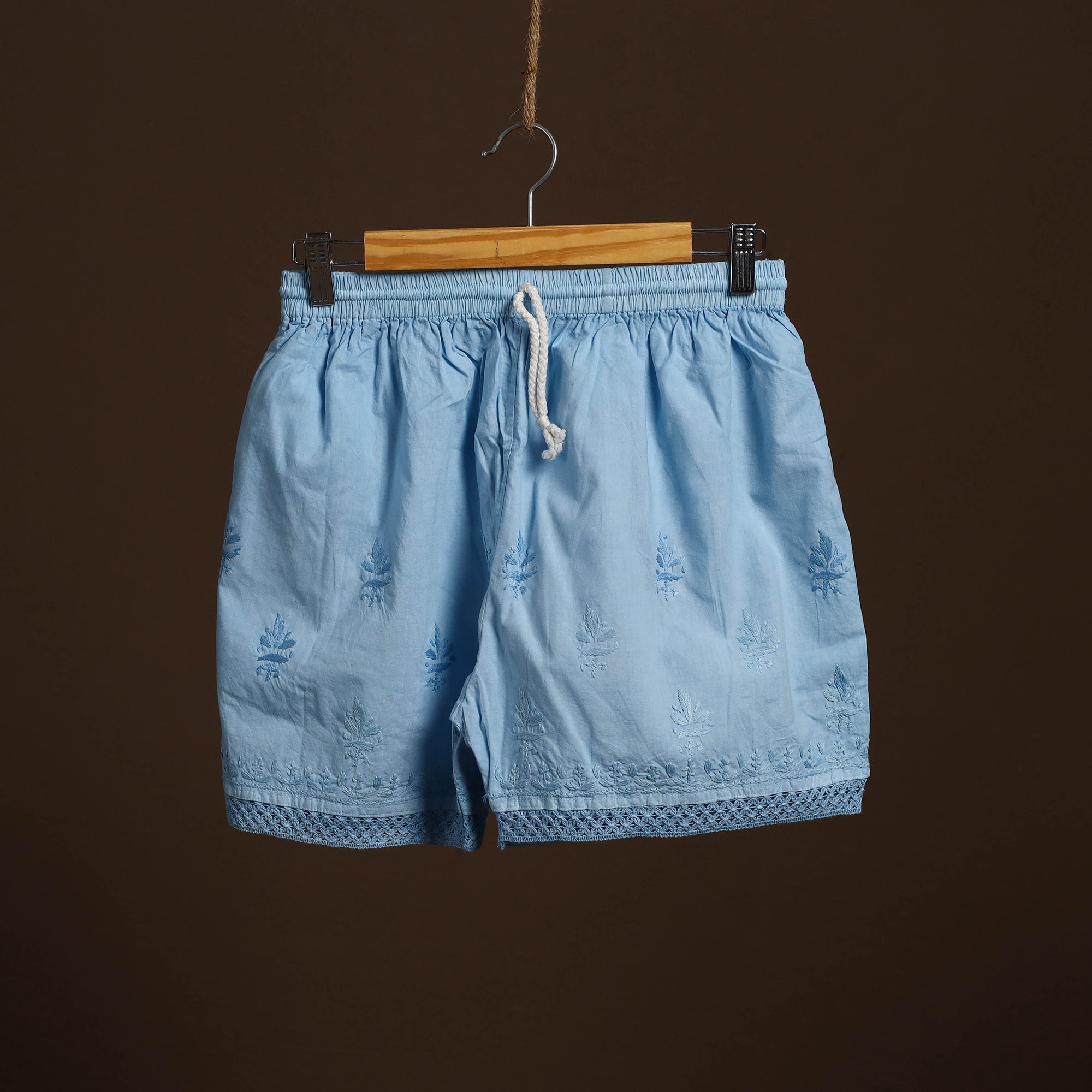 This blue cotton short features traditional chikankari hand embroidery from Lucknow, adding refined detailing to a casual essential. Made from soft, durable cotton, it includes a comfortable inner waistband and a side pocket for everyday convenience. Perfect for relaxed days or casual outings.