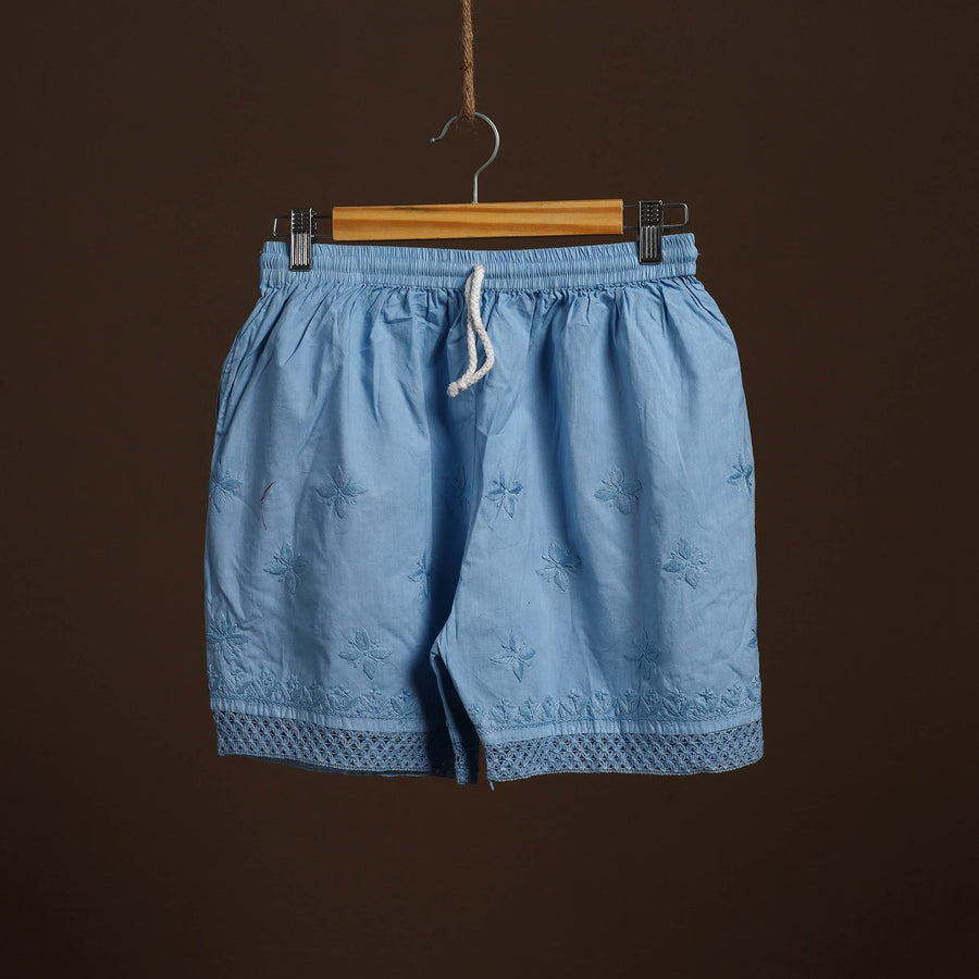 This blue cotton short features traditional chikankari hand embroidery from Lucknow, adding refined detailing to a casual essential. Made from soft, durable cotton, it includes a comfortable inner waistband and a side pocket for everyday convenience. Perfect for relaxed days or casual outings.
