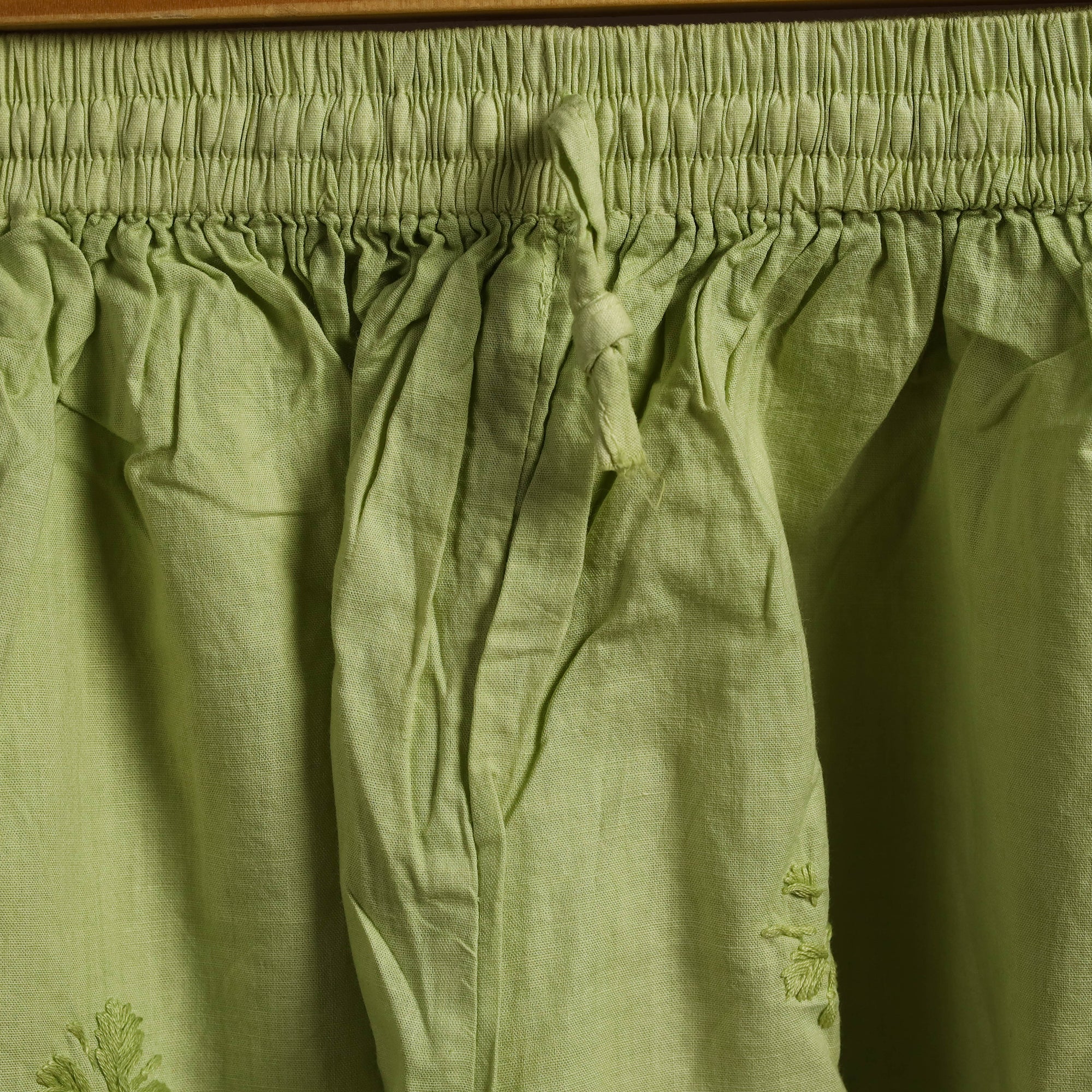 This green cotton short features traditional chikankari hand embroidery from Lucknow, adding refined detailing to a casual essential. Made from soft, durable cotton, it includes a comfortable inner waistband and a side pocket for everyday convenience. Perfect for relaxed days or casual outings.