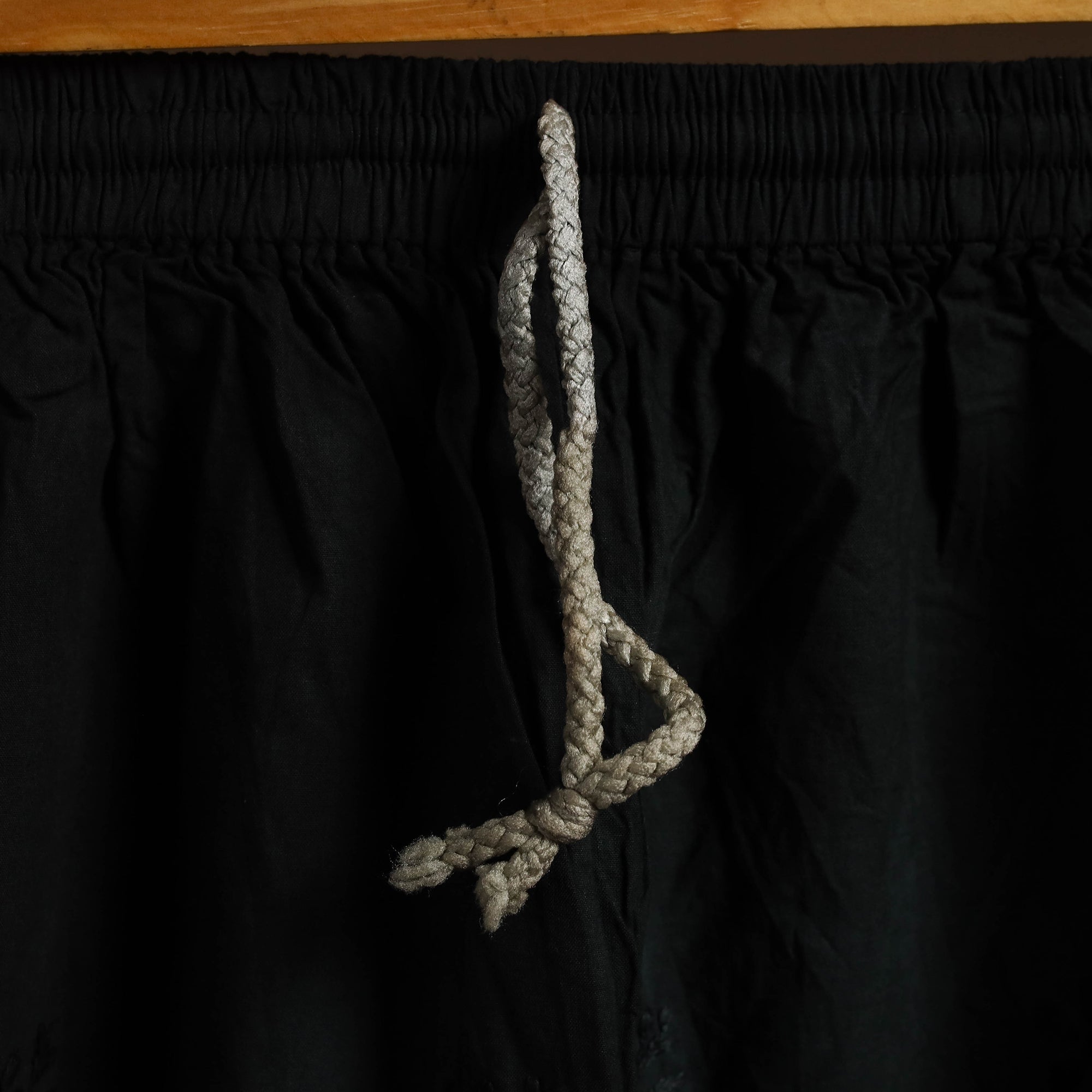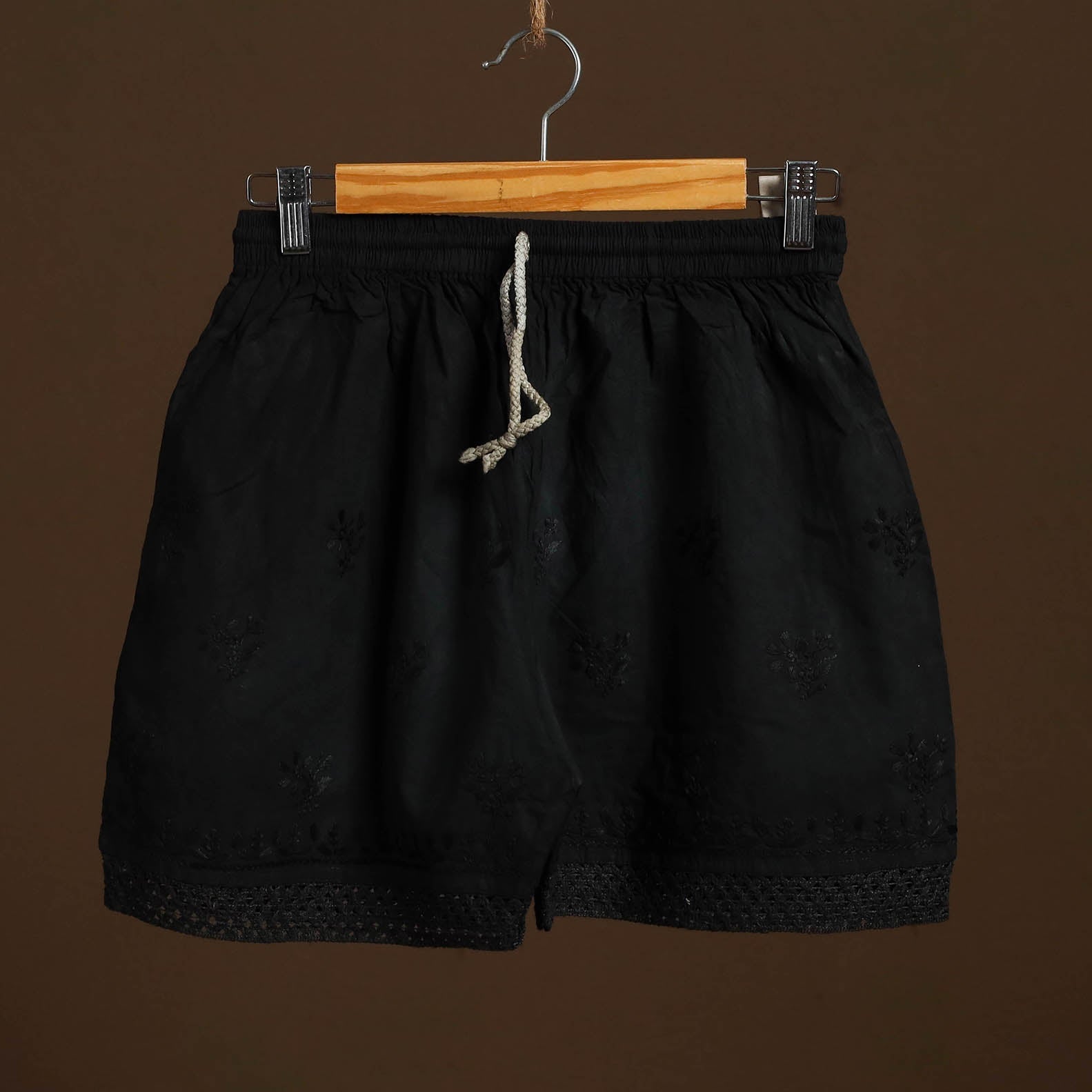 This black cotton short features traditional chikankari hand embroidery from Lucknow, adding refined detailing to a casual essential. Made from soft, durable cotton, it includes a comfortable inner waistband and a side pocket for everyday convenience. Perfect for relaxed days or casual outings.