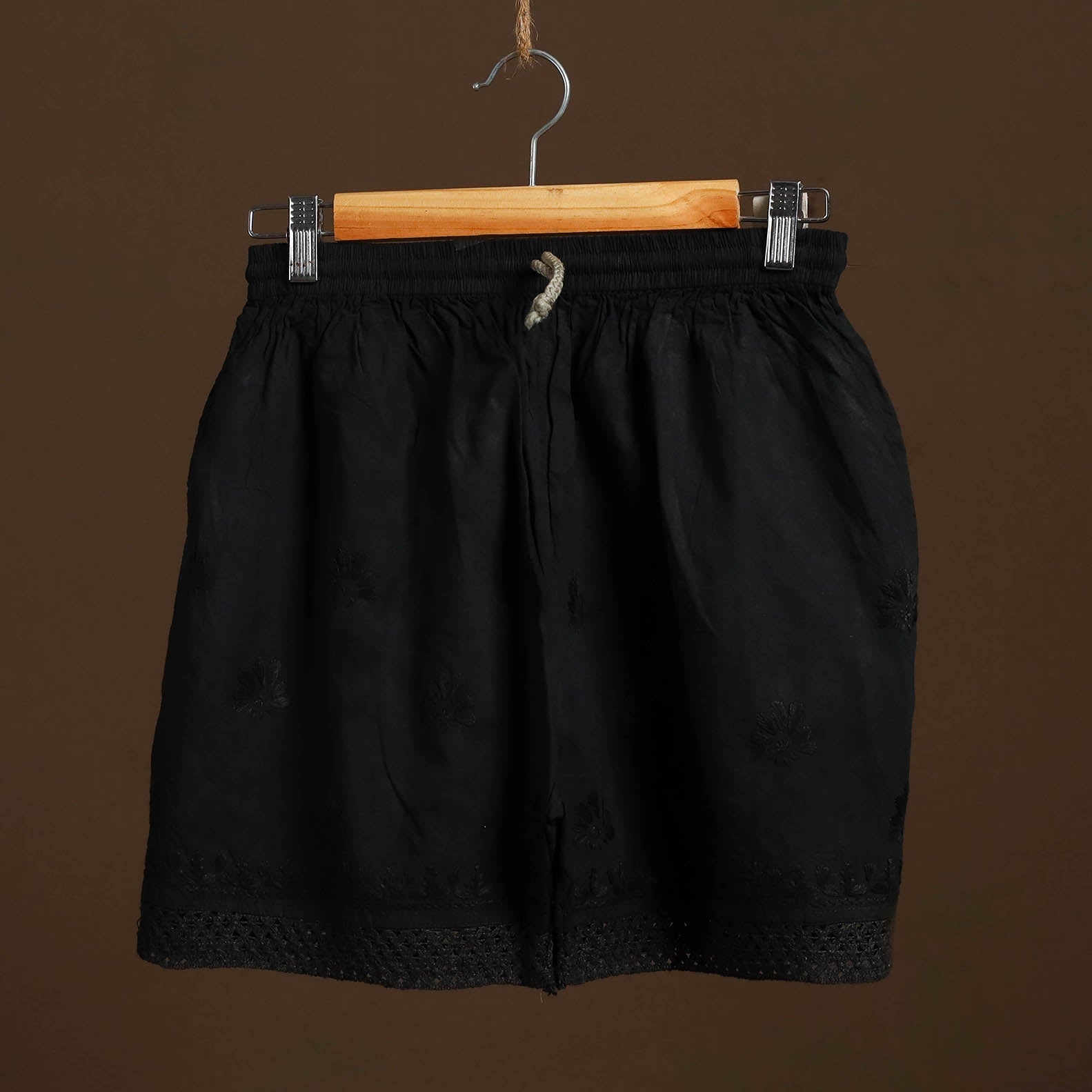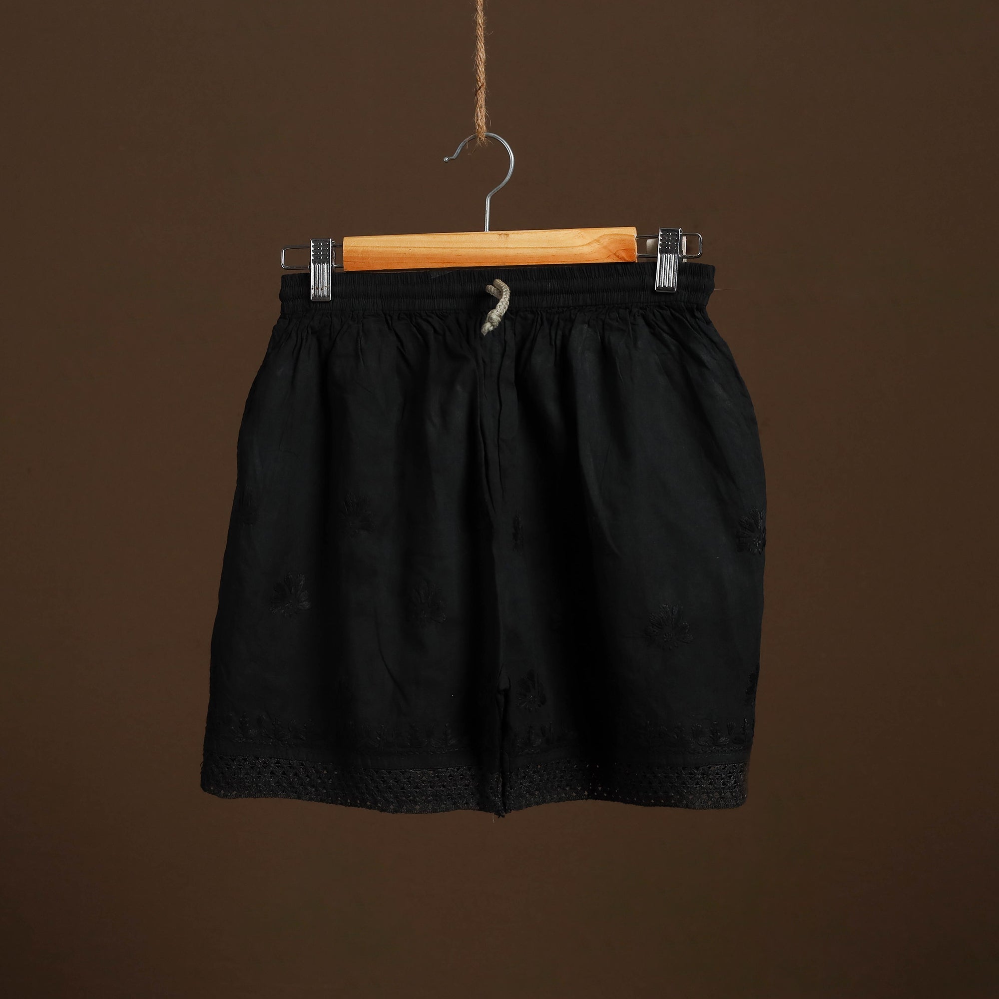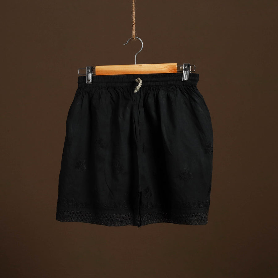 This black cotton short features traditional chikankari hand embroidery from Lucknow, adding refined detailing to a casual essential. Made from soft, durable cotton, it includes a comfortable inner waistband and a side pocket for everyday convenience. Perfect for relaxed days or casual outings.