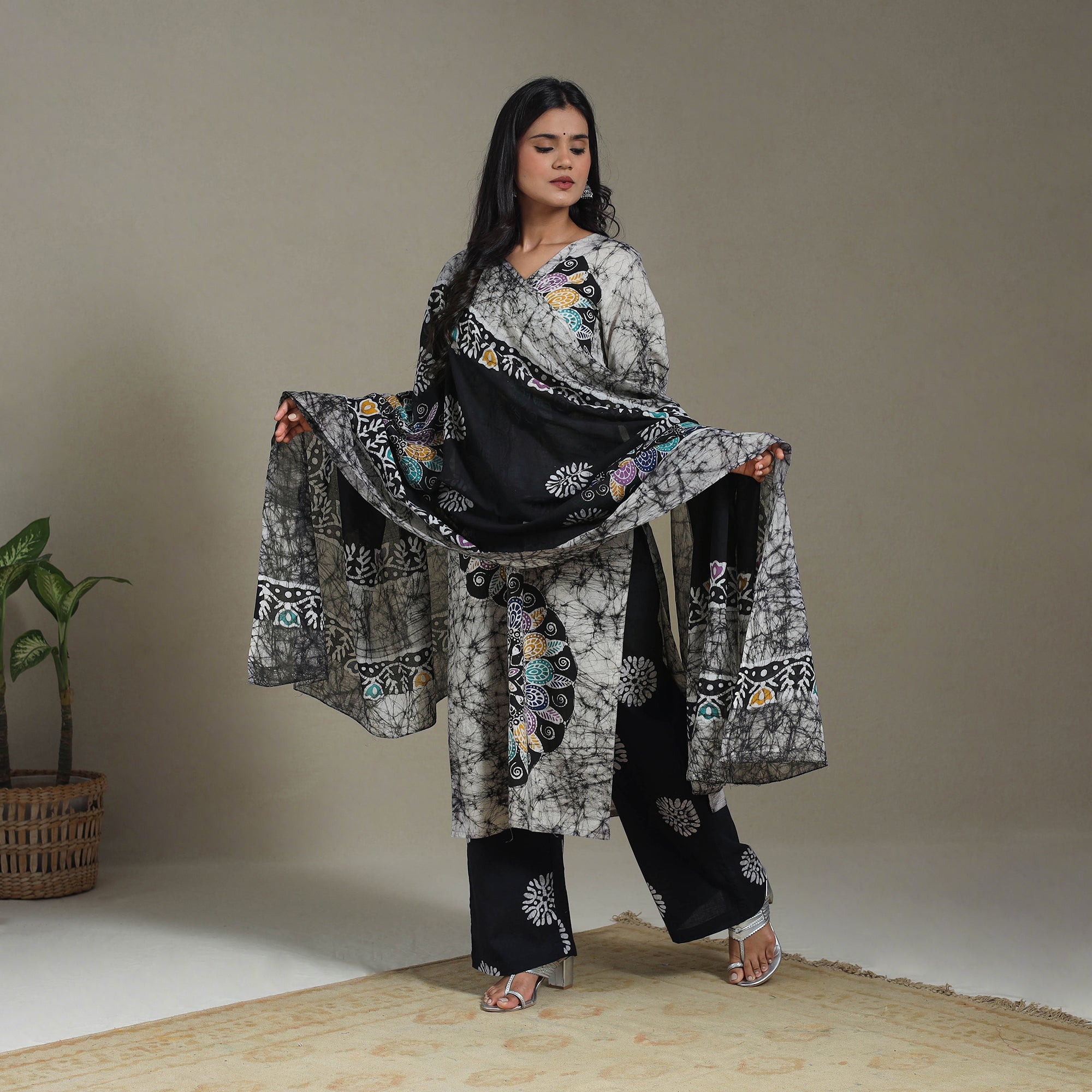 Elevate your everyday style with this black cotton kurta set featuring indonesian batik block prints. Made using the wax-resist dyeing method, the set includes a kurta with a handy side pocket, relaxed-fit palazzo pants with two pockets, and a soft cotton dupatta. Thoughtfully designed, it offers breathable comfort with artisanal beauty—perfect for festive charm or casual elegance.