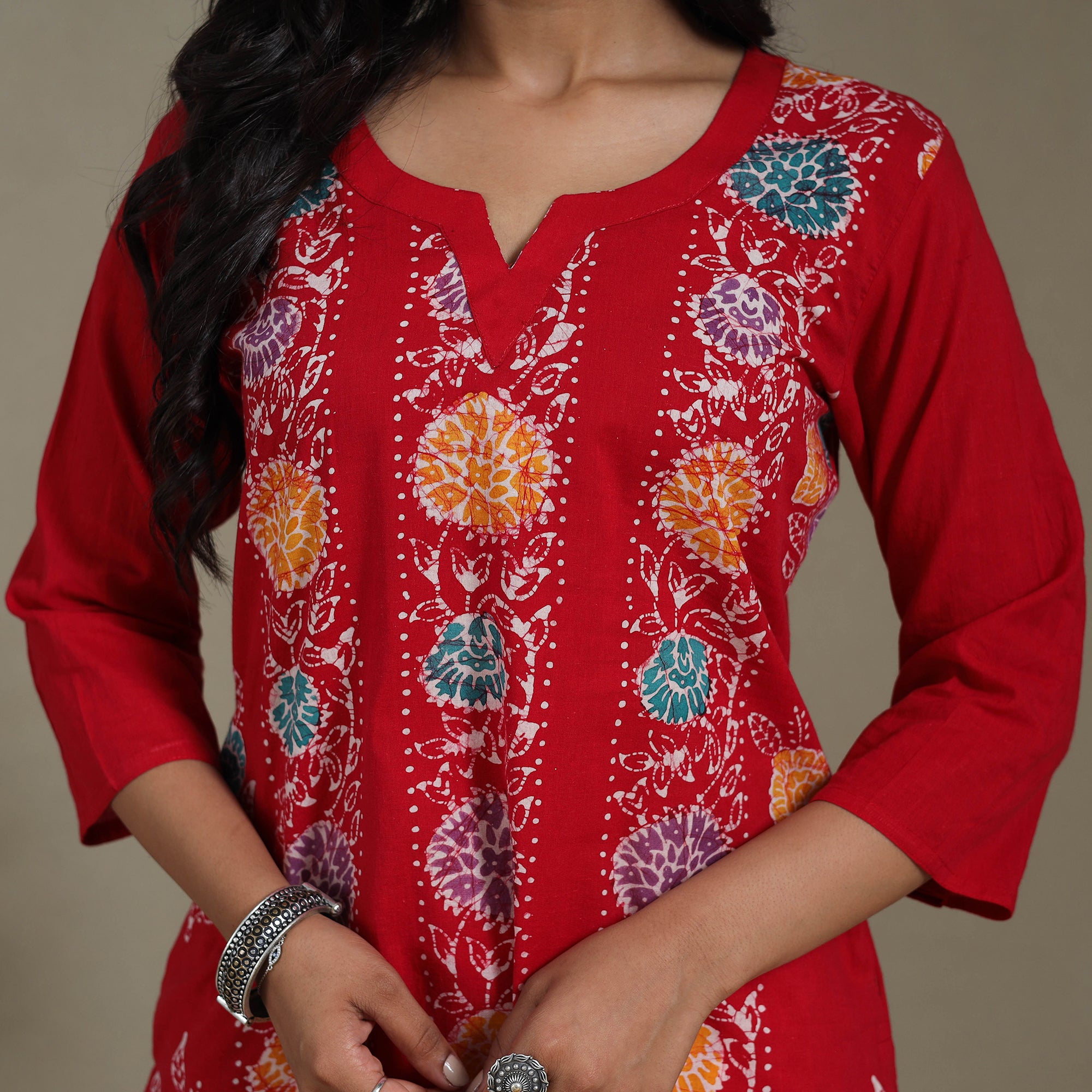 Elevate your everyday style with this red cotton kurta set featuring indonesian batik block prints. Made using the wax-resist dyeing method, the set includes a kurta with a handy side pocket, relaxed-fit palazzo pants with two pockets, and a soft cotton dupatta. Thoughtfully designed, it offers breathable comfort with artisanal beauty—perfect for festive charm or casual elegance.