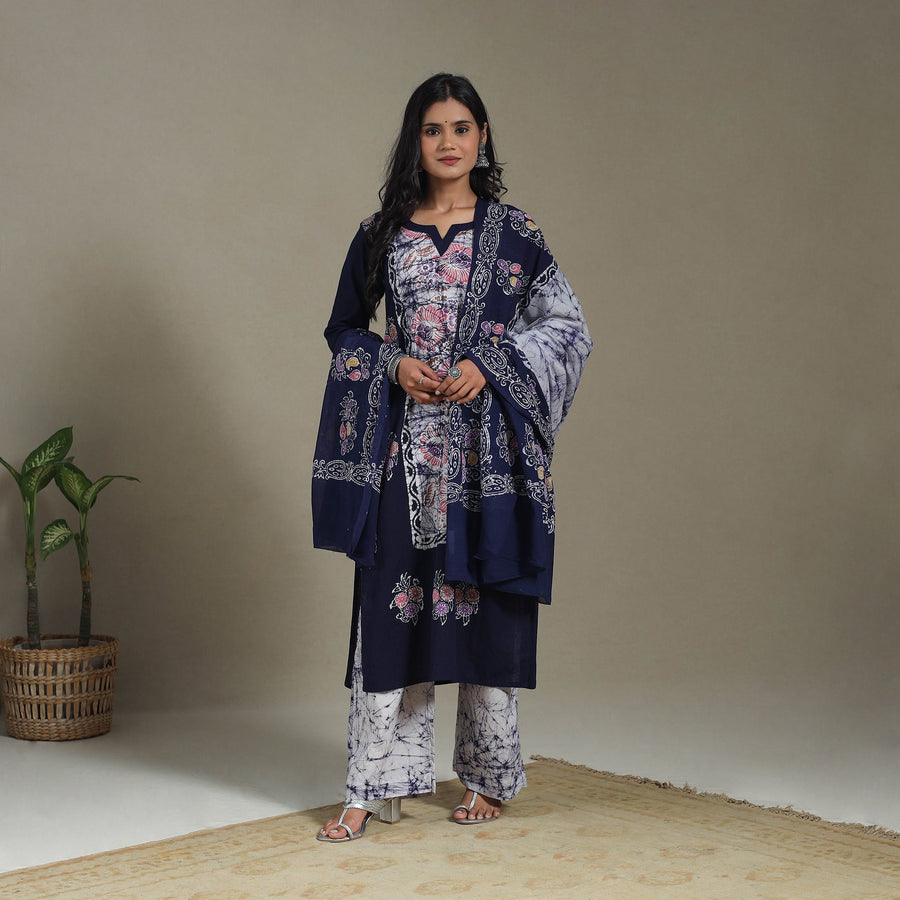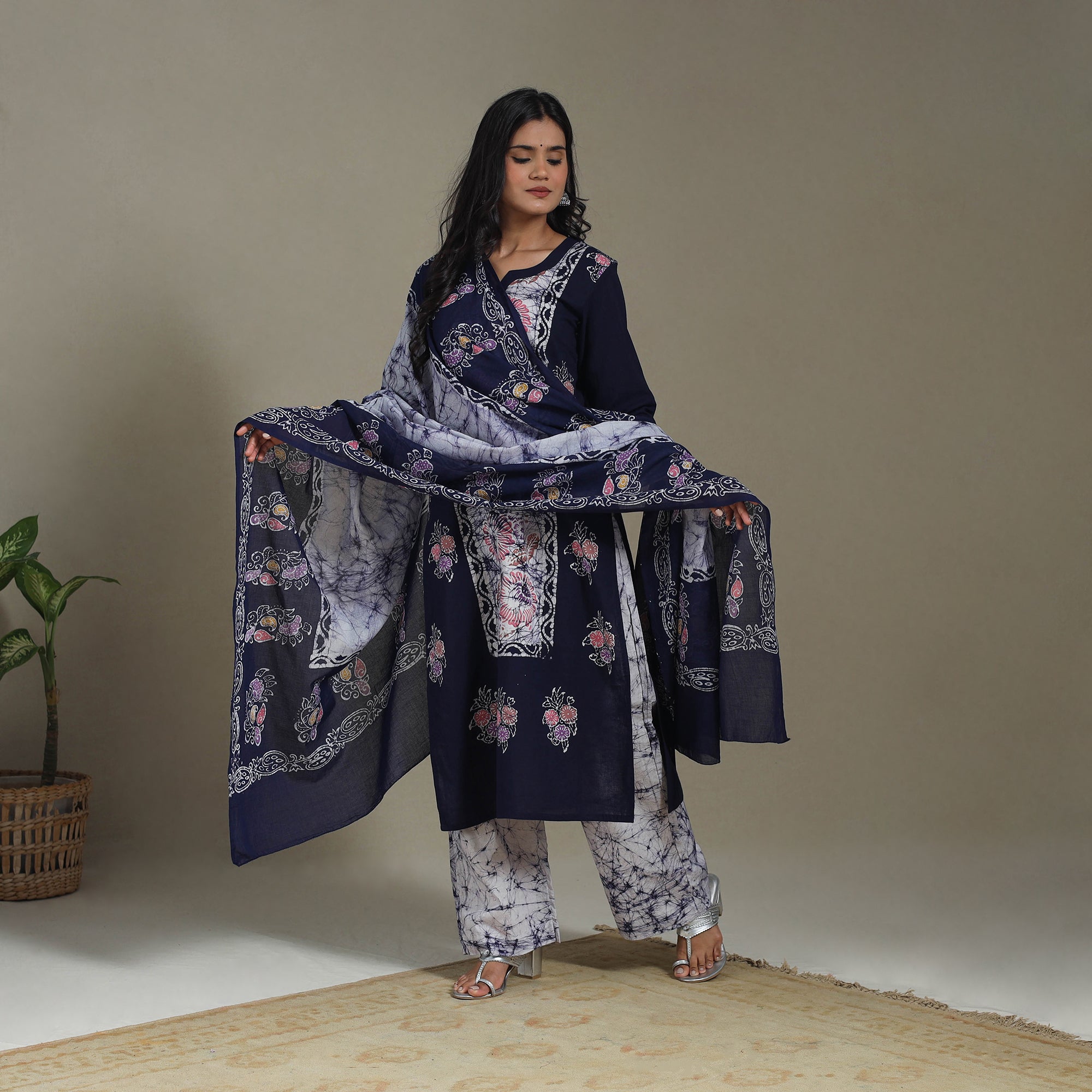 Elevate your everyday style with this blue cotton kurta set featuring indonesian batik block prints. Made using the wax-resist dyeing method, the set includes a kurta with a handy side pocket, relaxed-fit palazzo pants with two pockets, and a soft cotton dupatta. Thoughtfully designed, it offers breathable comfort with artisanal beauty—perfect for festive charm or casual elegance.