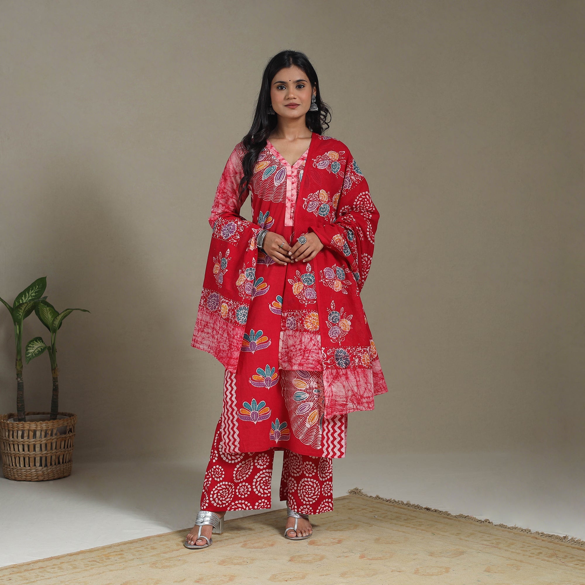 Elevate your everyday style with this red cotton kurta set featuring indonesian batik block prints. Made using the wax-resist dyeing method, the set includes a kurta with a handy side pocket, relaxed-fit palazzo pants with two pockets, and a soft cotton dupatta. Thoughtfully designed, it offers breathable comfort with artisanal beauty—perfect for festive charm or casual elegance.