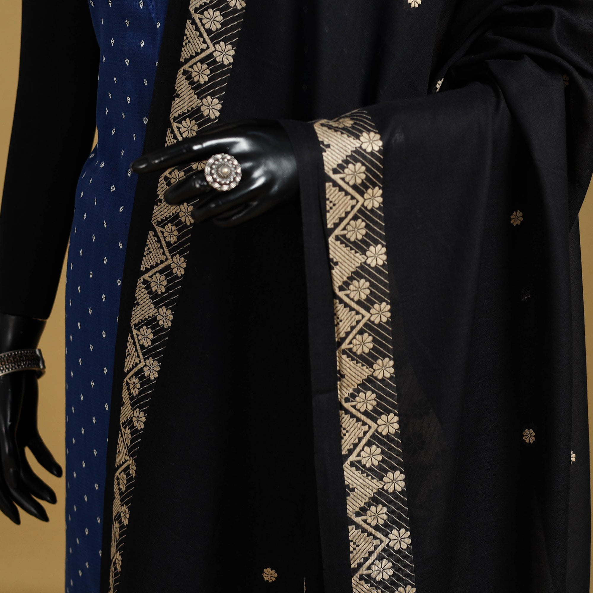 This black cotton jacquard dupatta with thread buti motifs beautifully blends tradition with everyday elegance. Woven on jacquard looms, the fabric displays intricate thread buti patterns across its surface, showcasing the finesse of this weaving technique. A finely detailed thread border enhances the design, adding subtle charm and durability. Lightweight yet graceful, this dupatta pairs effortlessly with both ethnic and contemporary outfits, making it a versatile addition to your wardrobe.
