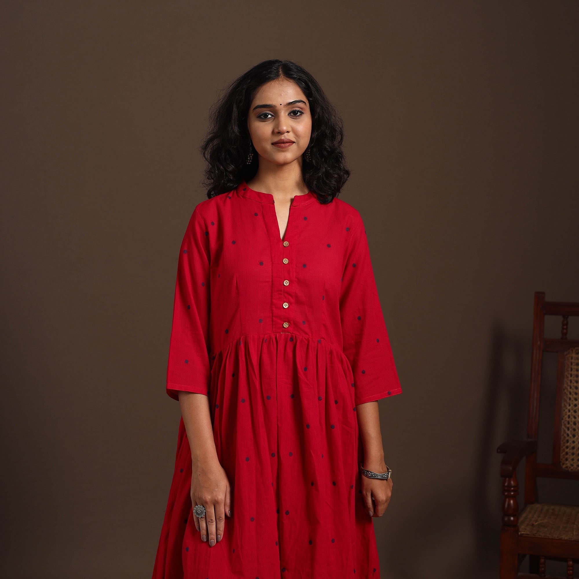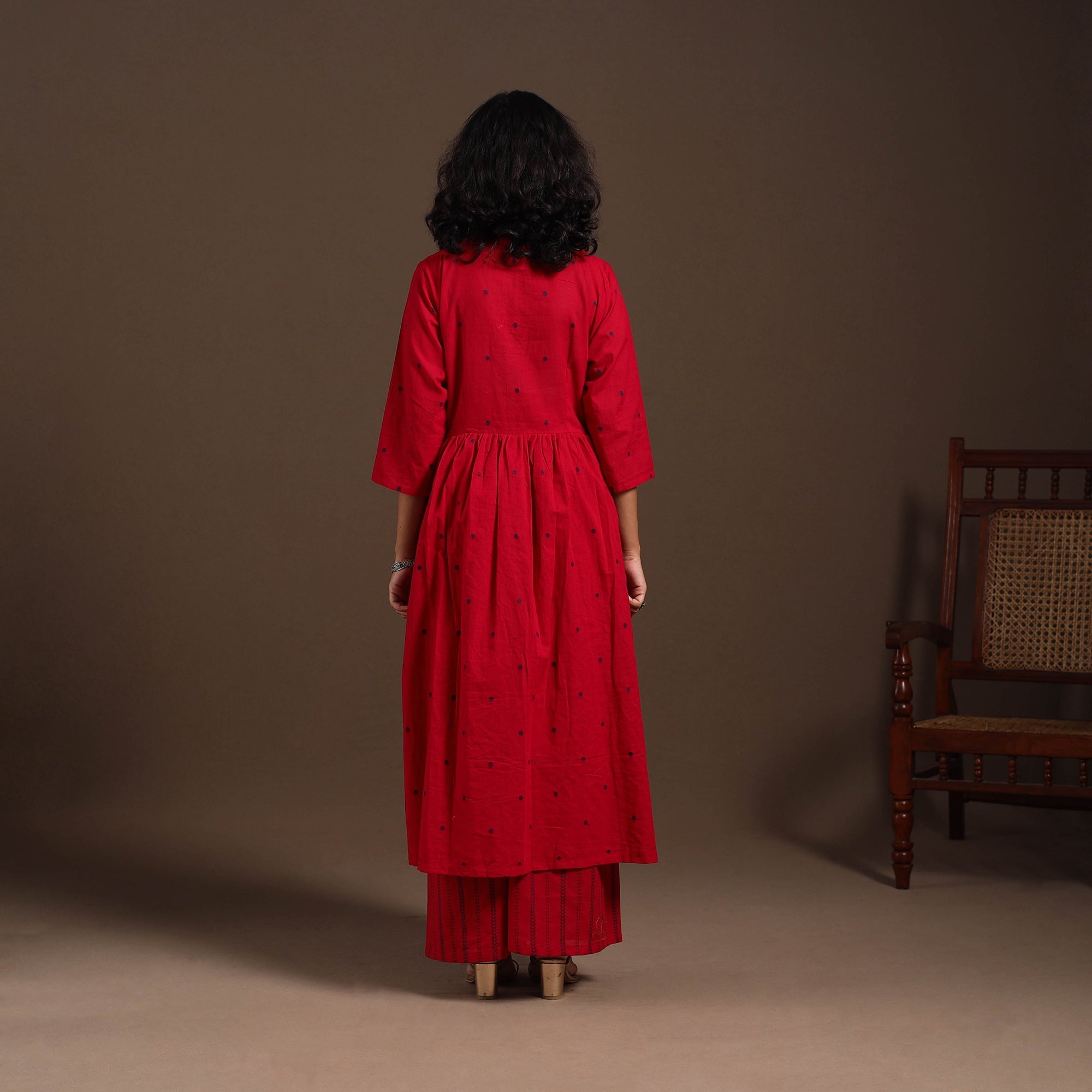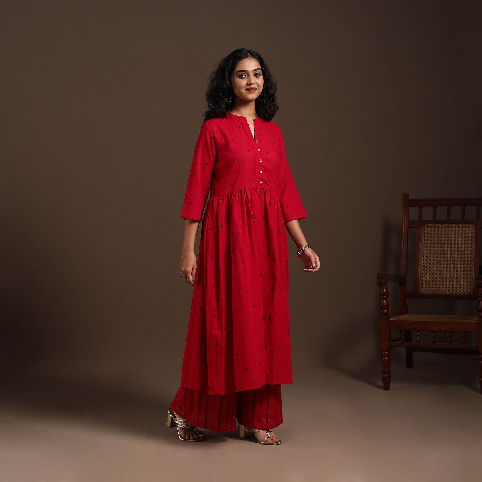 Step into grace with this beautifully crafted red jacquard kurta set, blending timeless heritage with modern comfort. The soft cotton fabric ensures ease of wear, while the woven patterns add refined elegance. A flared kurta paired with a coordinated palazzo featuring a flexible waistband creates a flattering silhouette. Perfect for a relaxed outing or a festive celebration, this ensemble radiates effortless charm.