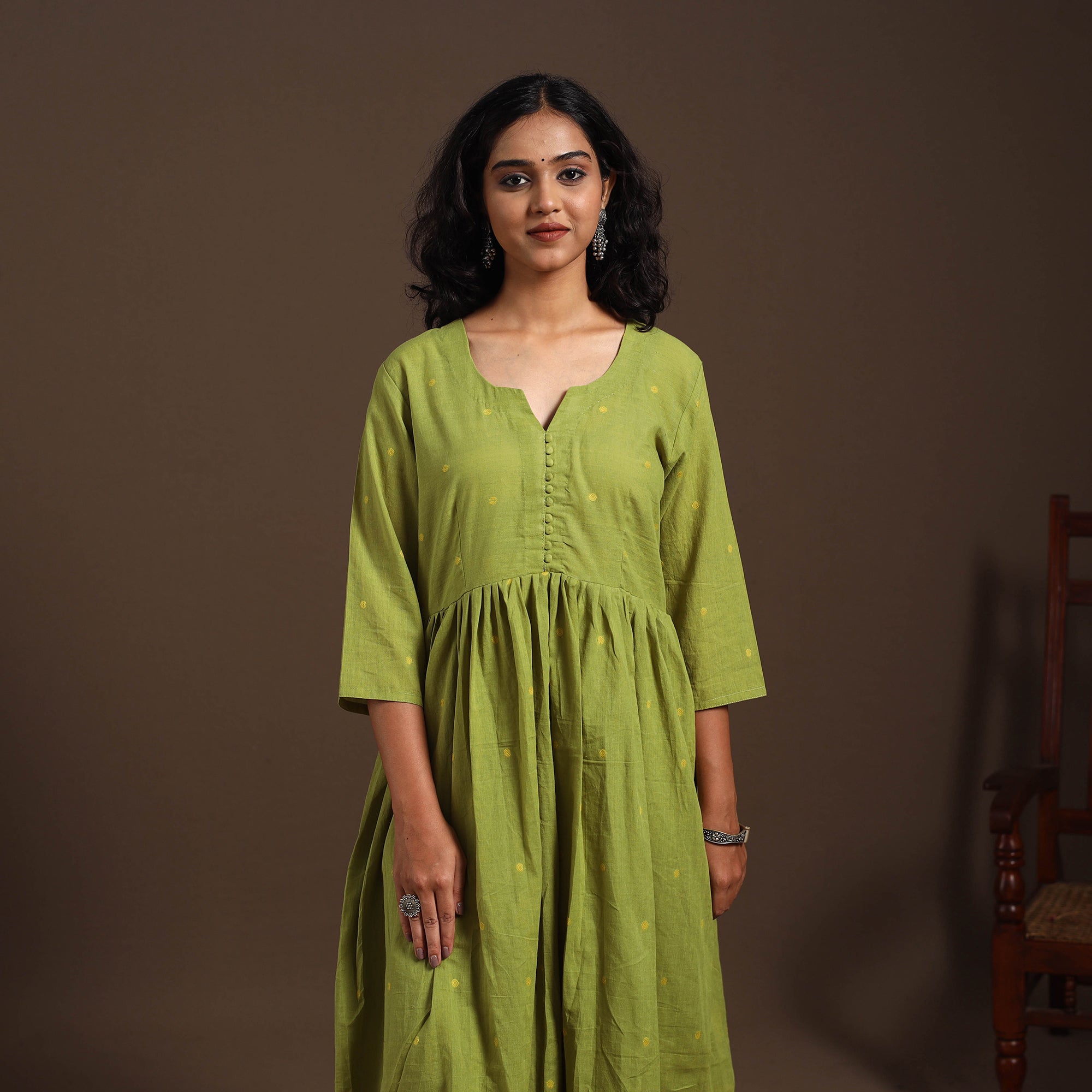 Step into grace with this beautifully crafted green jacquard kurta set, blending timeless heritage with modern comfort. The soft cotton fabric ensures ease of wear, while the woven patterns add refined elegance. A flared kurta paired with a coordinated palazzo featuring a flexible waistband creates a flattering silhouette. Perfect for a relaxed outing or a festive celebration, this ensemble radiates effortless charm.
