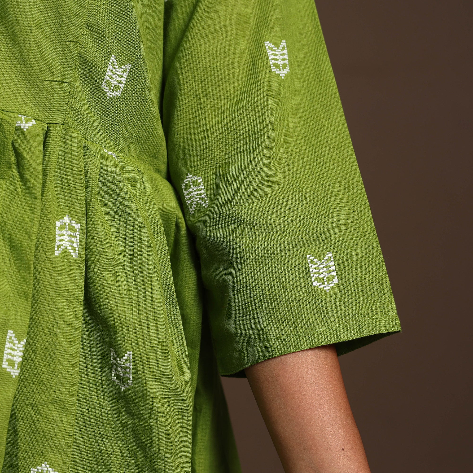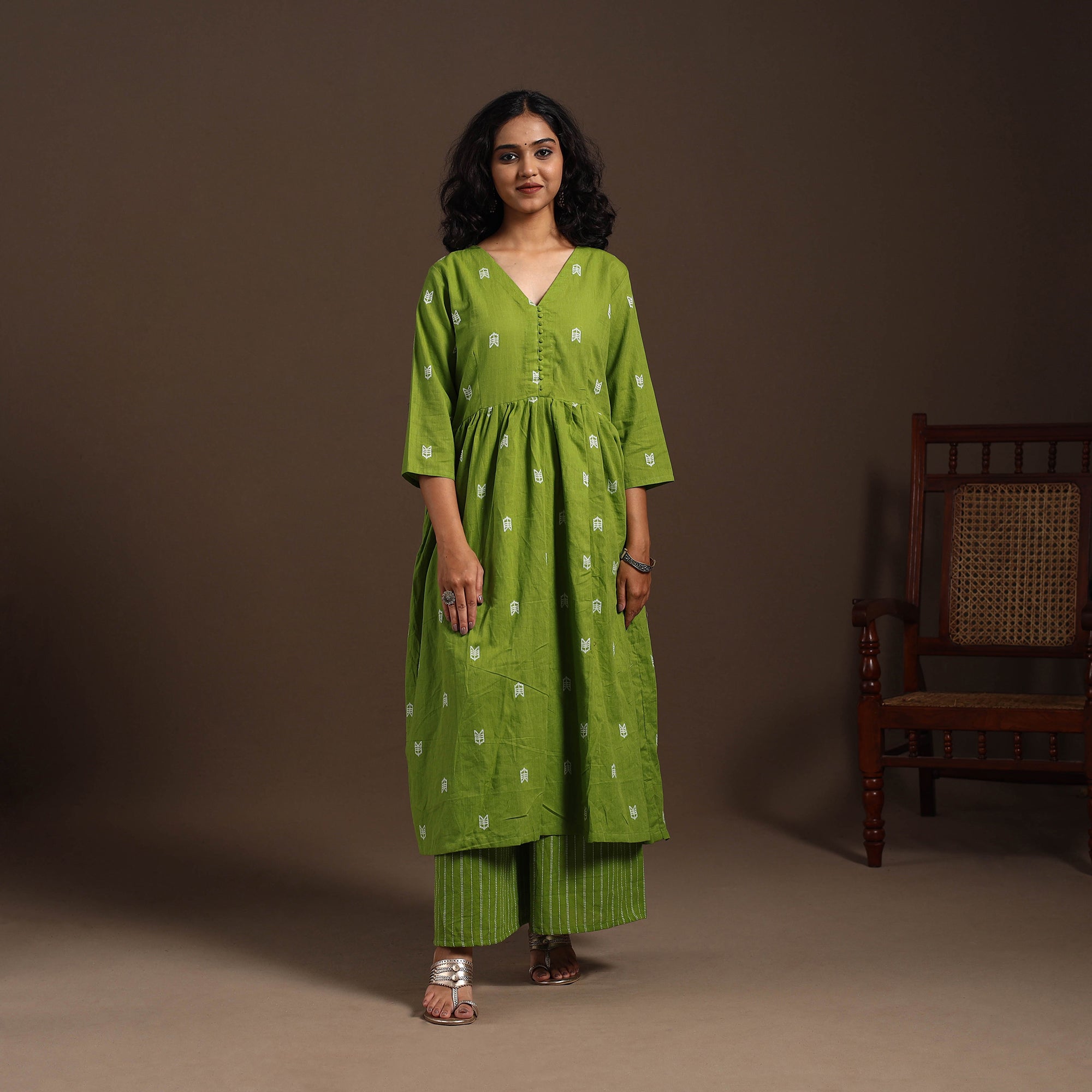 Step into grace with this beautifully crafted green jacquard kurta set, blending timeless heritage with modern comfort. The soft cotton fabric ensures ease of wear, while the woven patterns add refined elegance. A flared kurta paired with a coordinated palazzo featuring a flexible waistband creates a flattering silhouette. Perfect for a relaxed outing or a festive celebration, this ensemble radiates effortless charm.