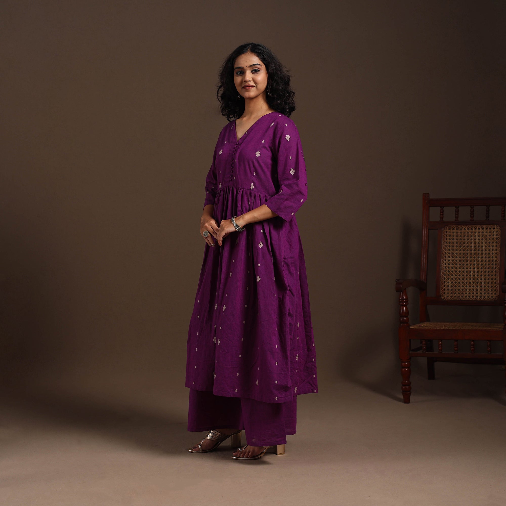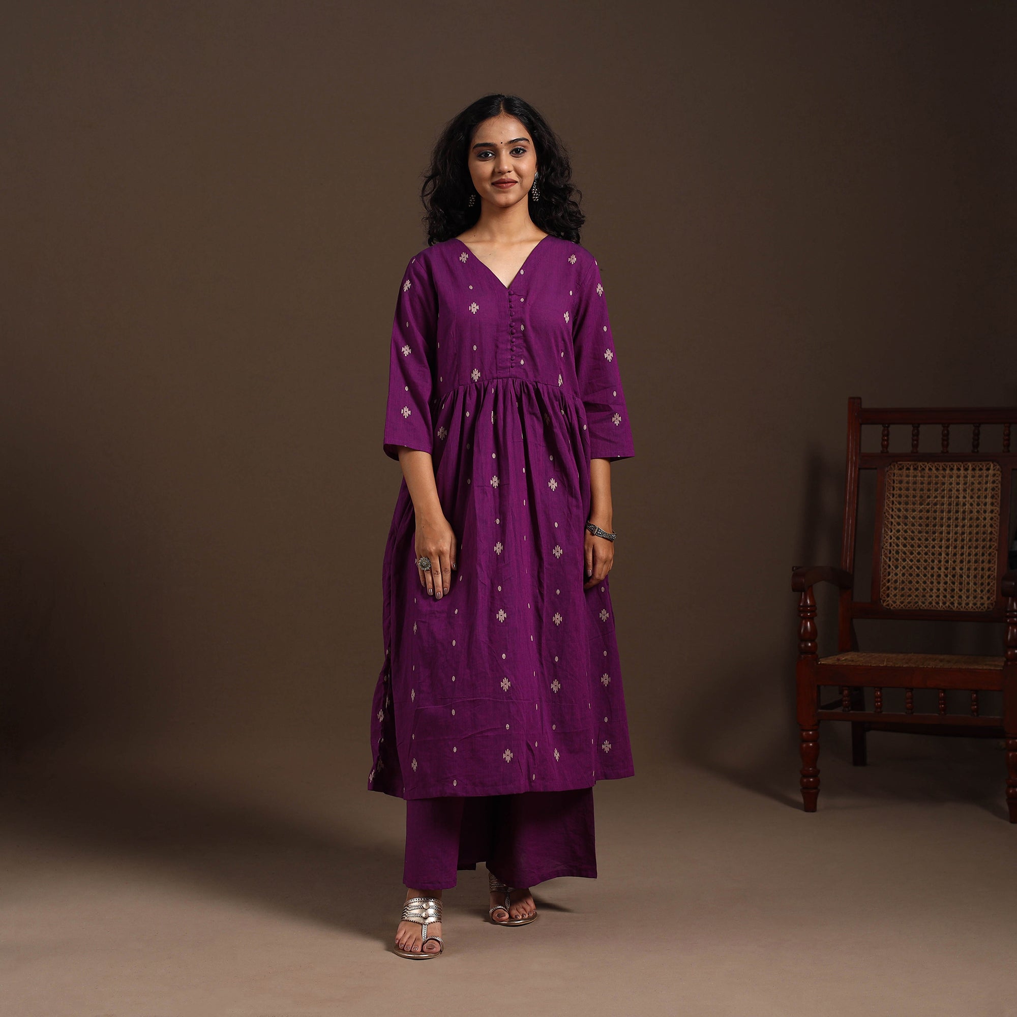 Step into grace with this beautifully crafted purple jacquard kurta set, blending timeless heritage with modern comfort. The soft cotton fabric ensures ease of wear, while the woven patterns add refined elegance. A flared kurta paired with a coordinated palazzo featuring a flexible waistband creates a flattering silhouette. Perfect for a relaxed outing or a festive celebration, this ensemble radiates effortless charm.