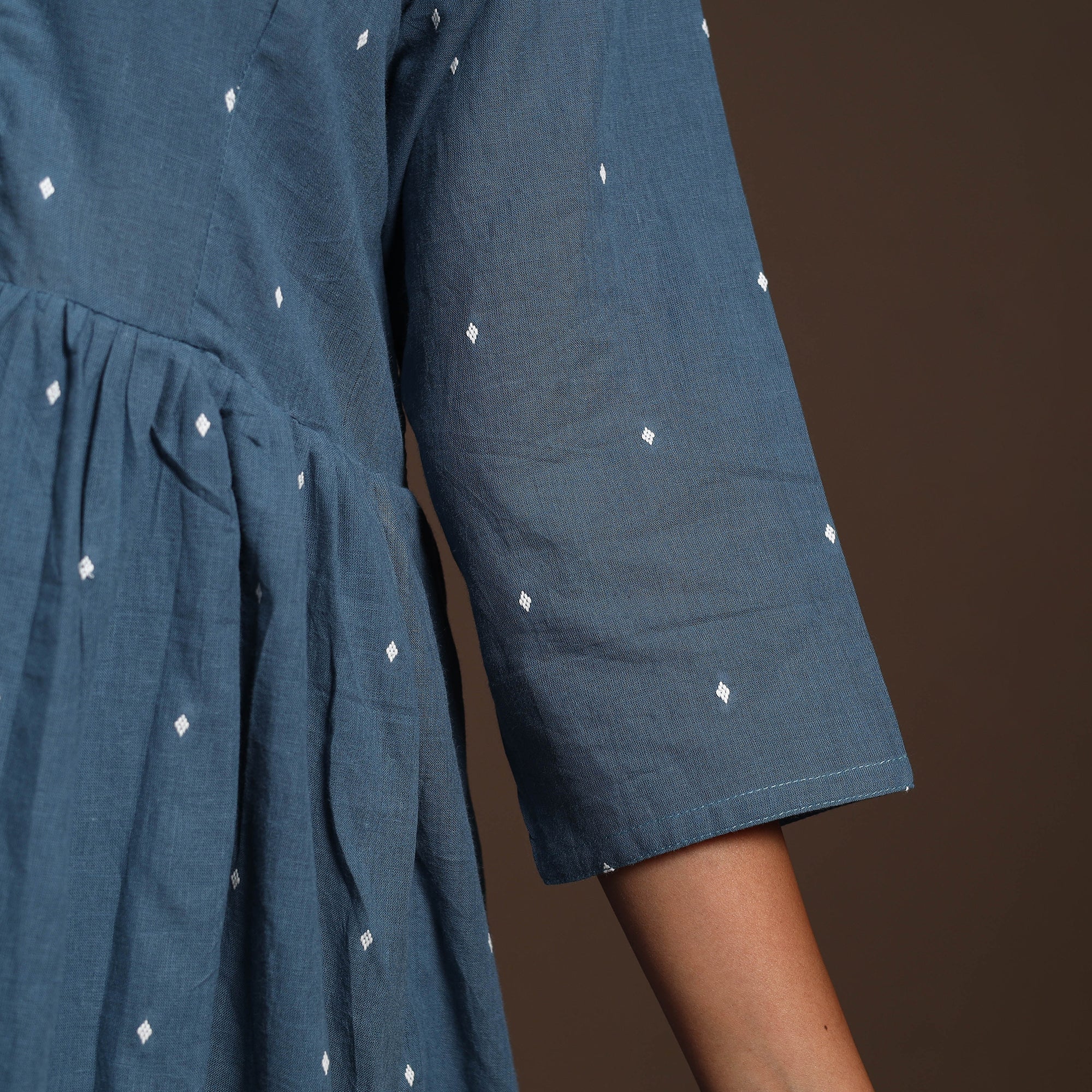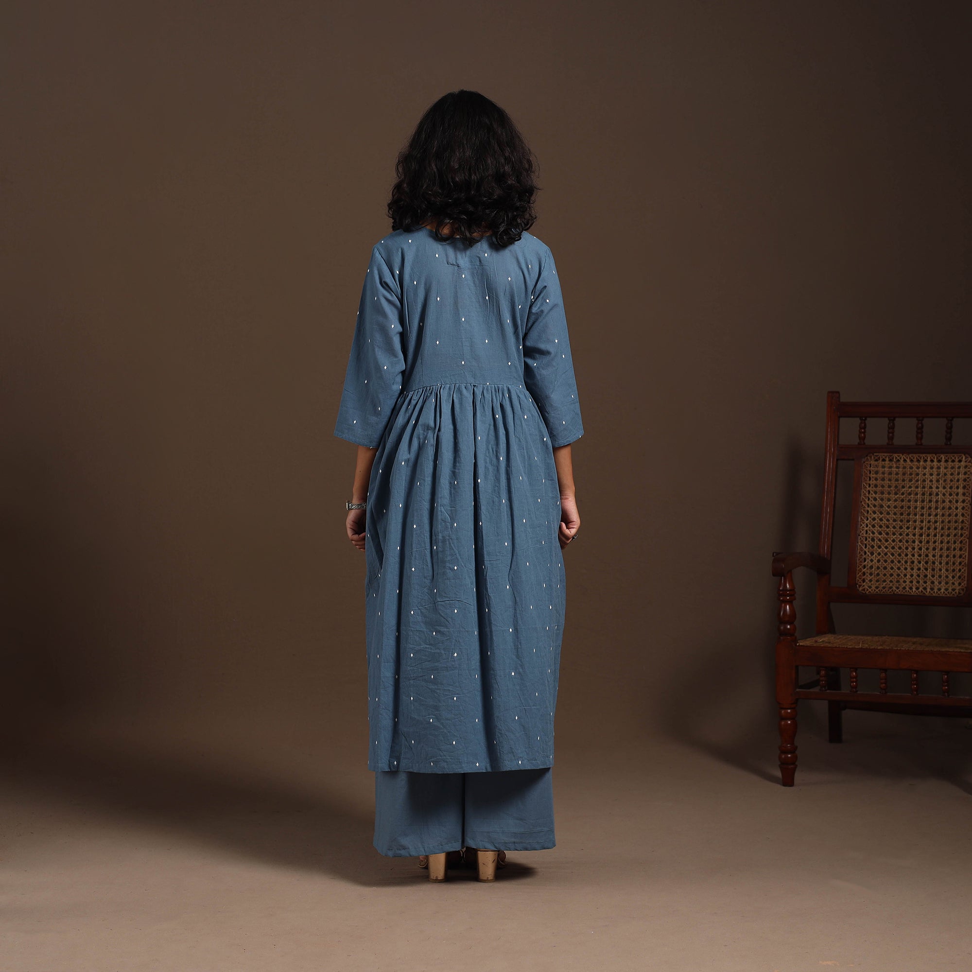 Step into grace with this beautifully crafted blue jacquard kurta set, blending timeless heritage with modern comfort. The soft cotton fabric ensures ease of wear, while the woven patterns add refined elegance. A flared kurta paired with a coordinated palazzo featuring a flexible waistband creates a flattering silhouette. Perfect for a relaxed outing or a festive celebration, this ensemble radiates effortless charm.