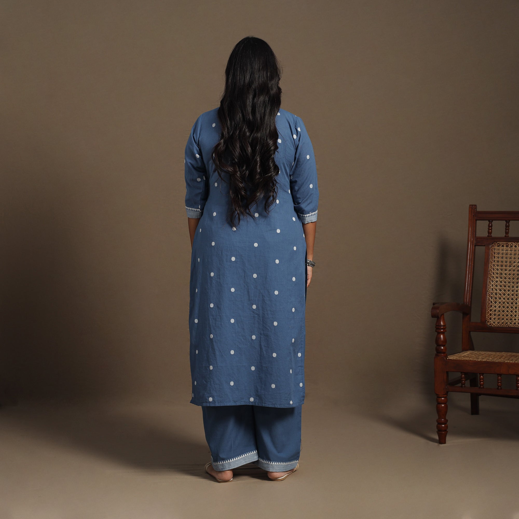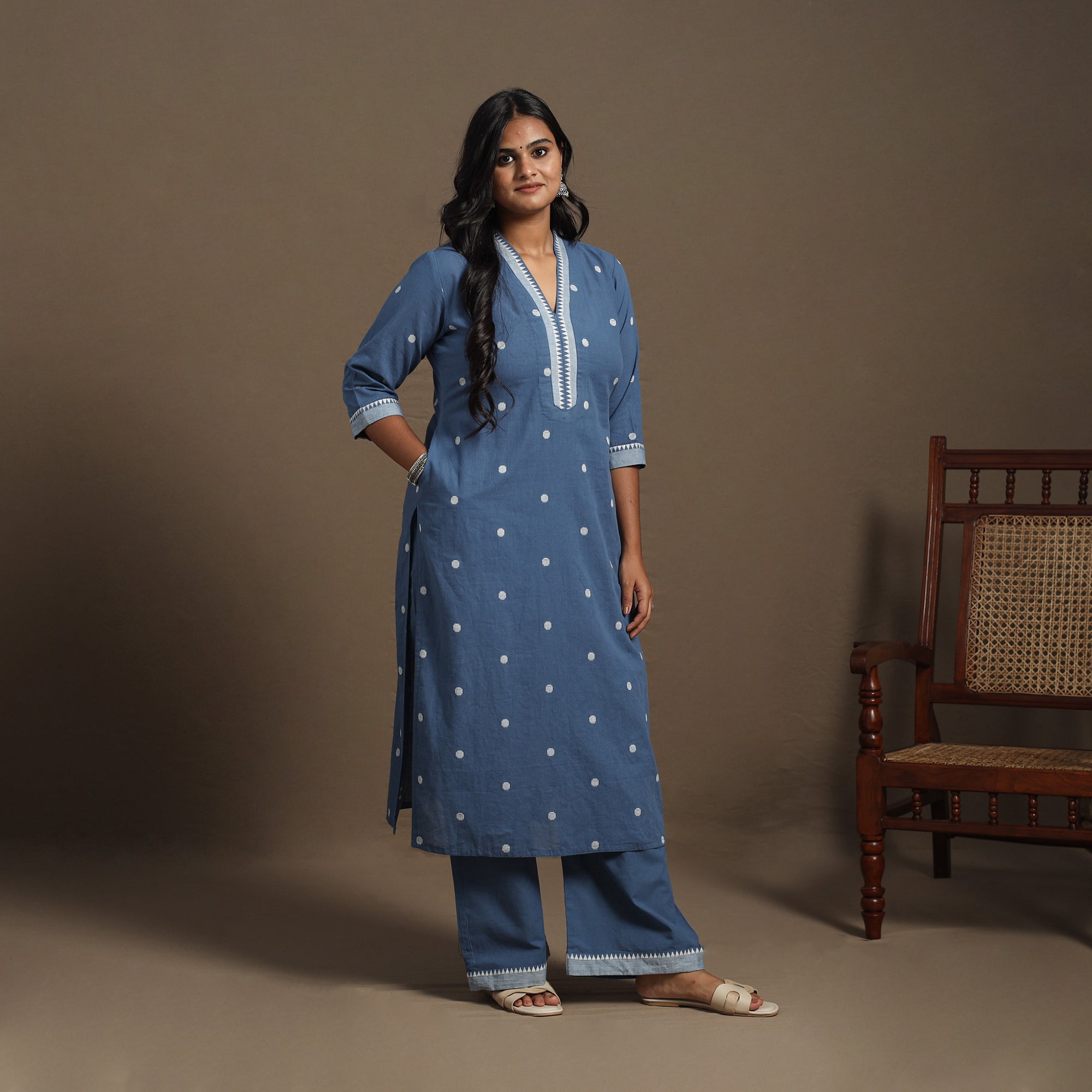 Elevate your everyday style with this blue straight cotton jacquard kurta set, crafted for effortless charm and comfort. Jacquard weaving integrates elegant patterns directly into the fabric, offering a subtle textured feel. The kurta features a practical side pocket for daily ease. It comes paired with a plain palazzo with an elastic waistband and two side pockets for added functionality. Ideal for workdays, casual brunches, or laid-back evenings with friends.