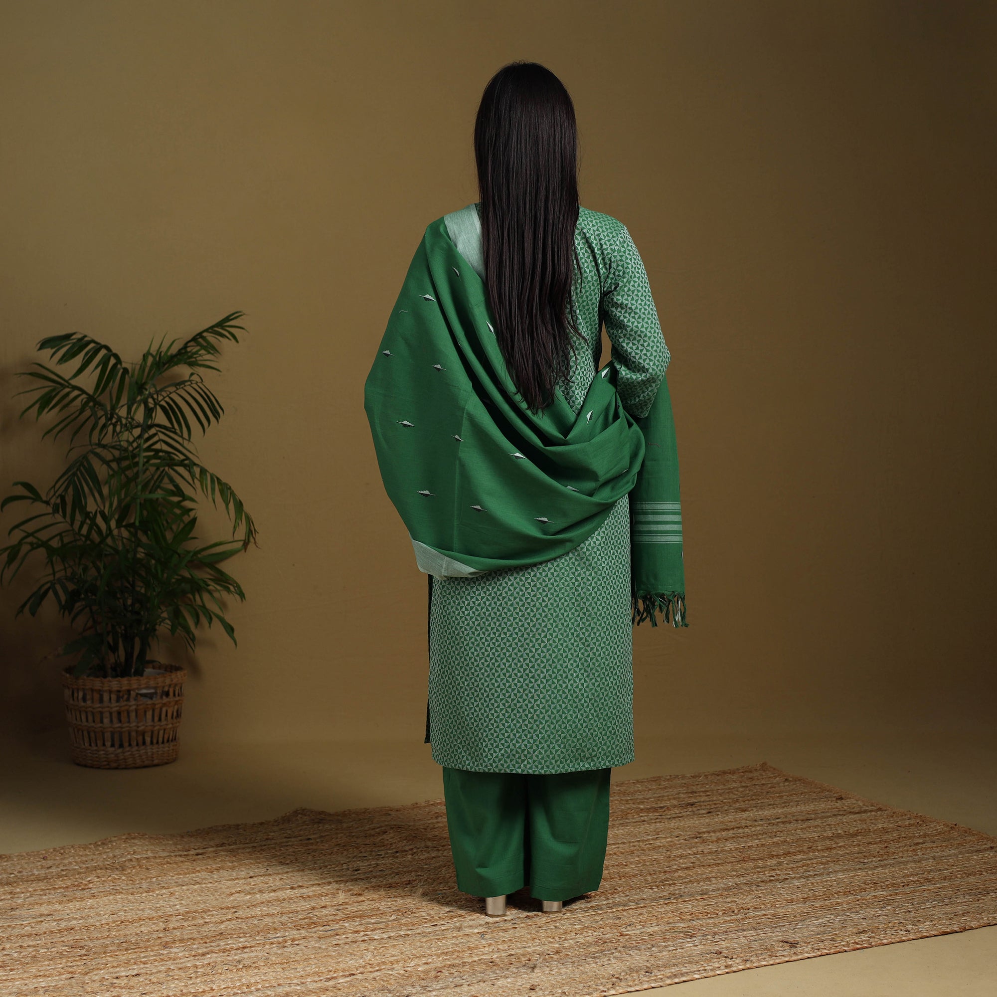 Elevate your wardrobe with this green cotton jacquard kurta set. Crafted from soft cotton, the straight-fit kurta features a functional pocket on one side for ease. It is paired with a matching palazzo designed with an elastic waistband and two side pockets for added comfort. The ensemble is completed with a graceful dupatta, making it perfect for festive gatherings as well as casual everyday wear.
