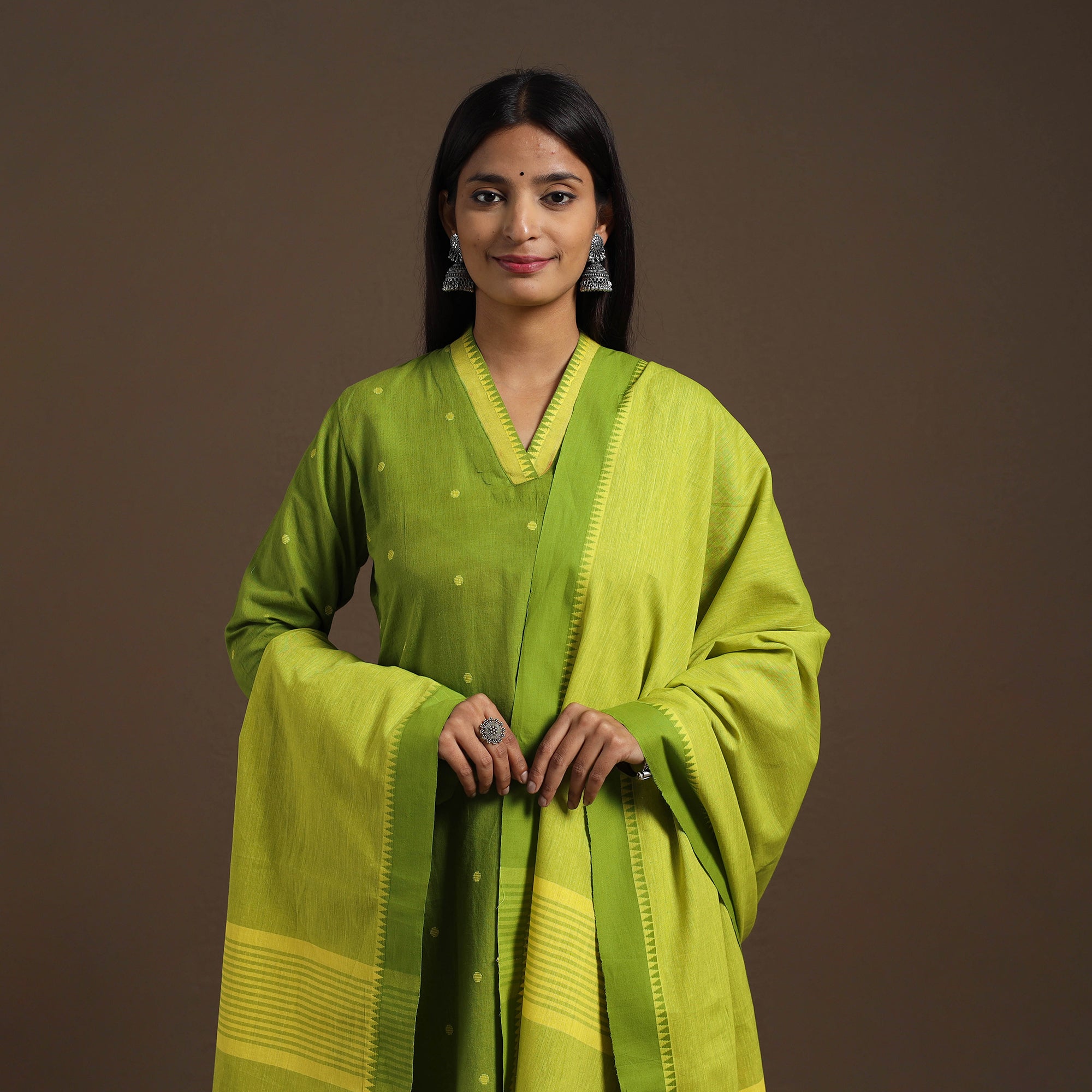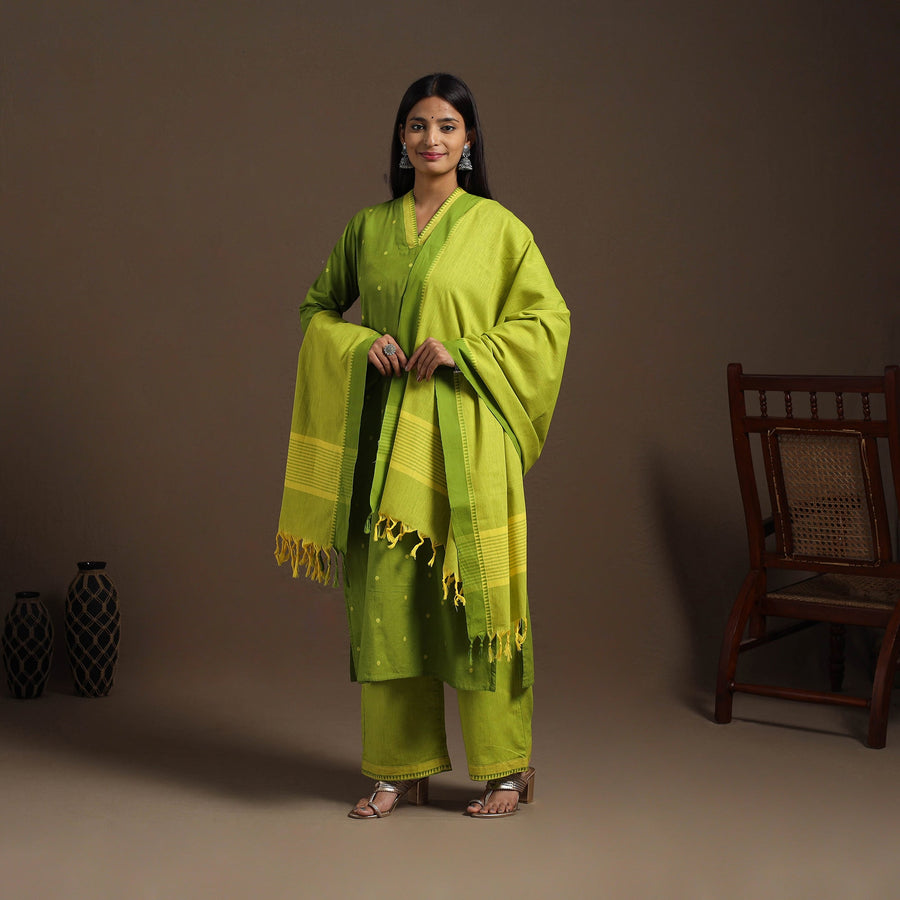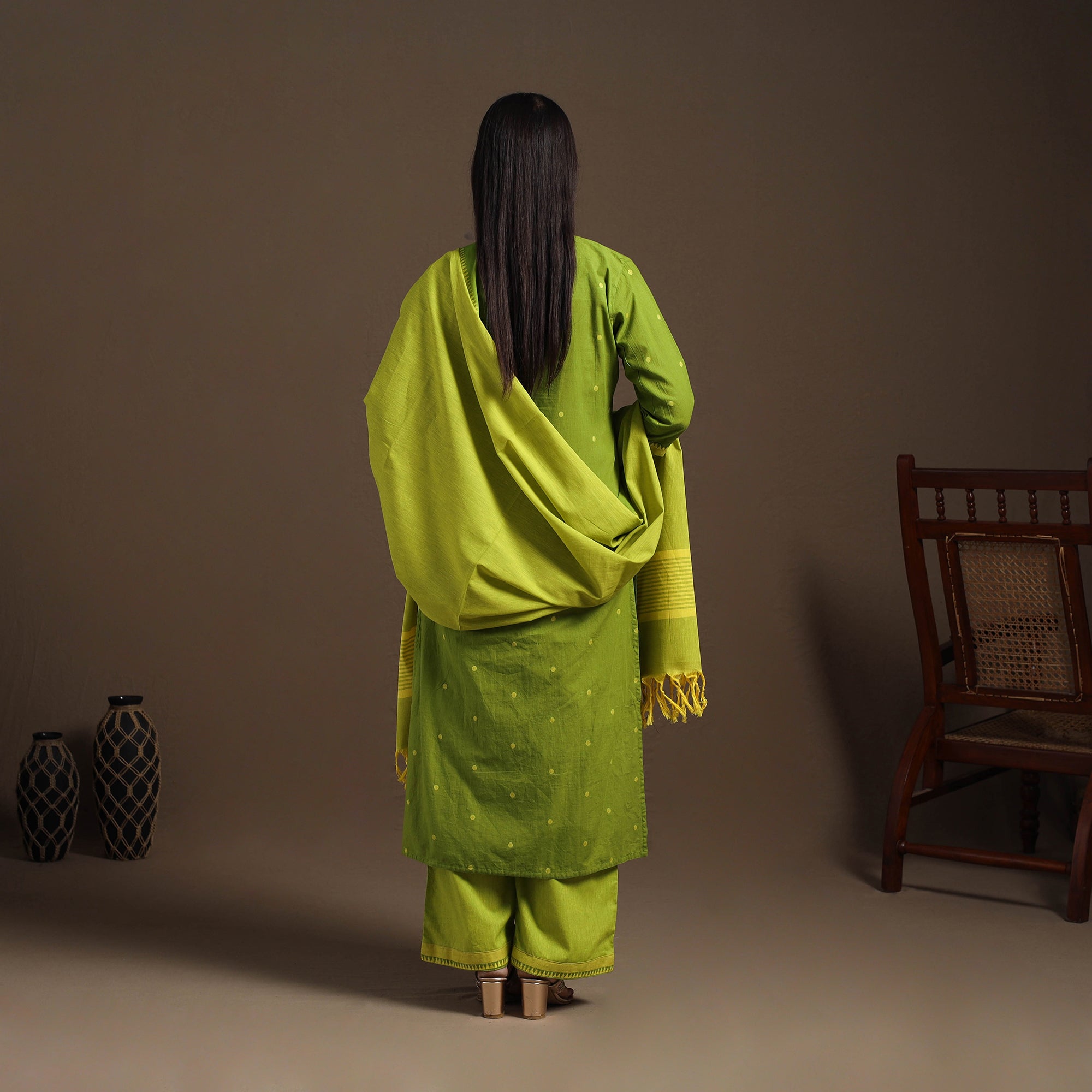 Elevate your wardrobe with this beautifully woven green jacquard kurta set. Crafted from soft cotton, the straight-fit kurta includes a functional one-side pocket for ease. It is paired with a coordinating palazzo featuring an elastic waistband and two side pockets for added comfort. The look is completed with a graceful dupatta, making it ideal for festive occasions or relaxed everyday wear.