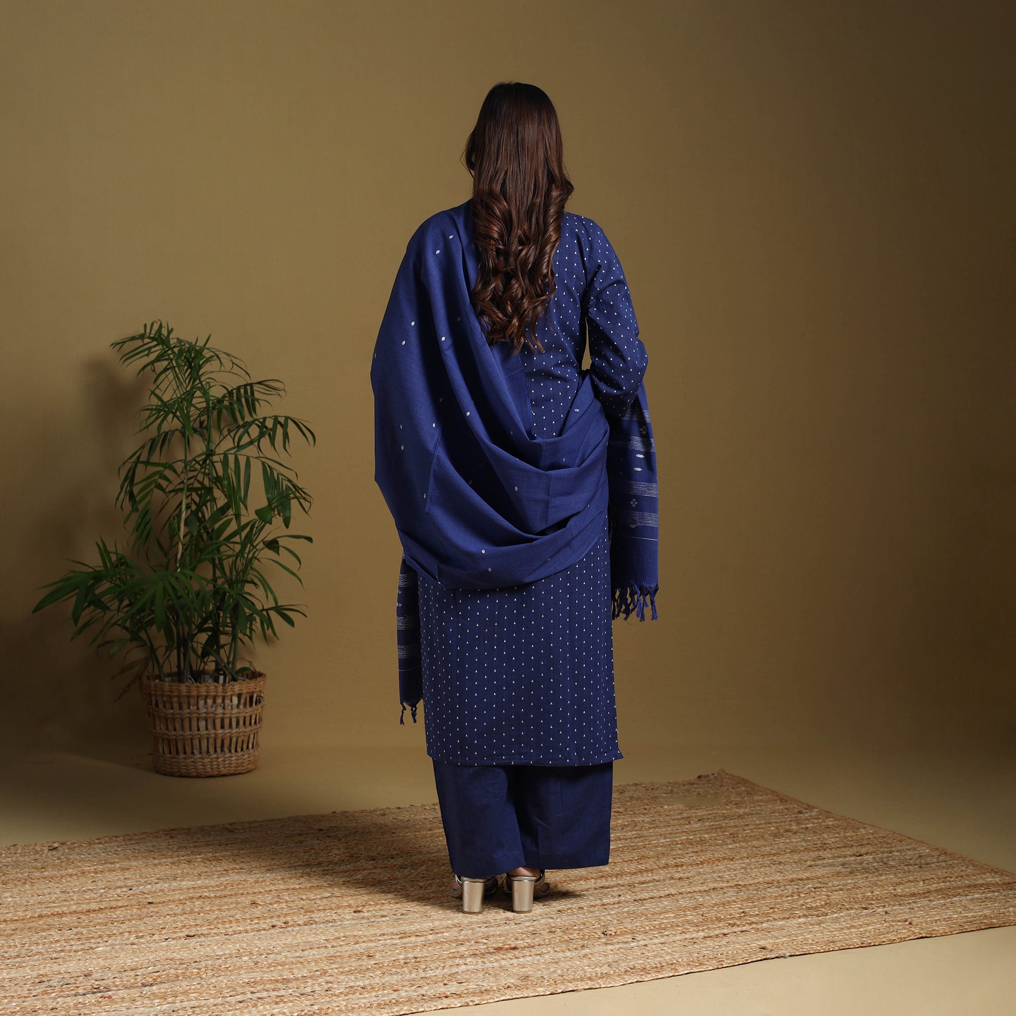 Elevate your wardrobe with this blue cotton jacquard kurta set. Crafted from soft cotton, the straight-fit kurta features a functional pocket on one side for ease. It is paired with a matching palazzo designed with an elastic waistband and two side pockets for added comfort. The ensemble is completed with a graceful dupatta, making it perfect for festive gatherings as well as casual everyday wear.