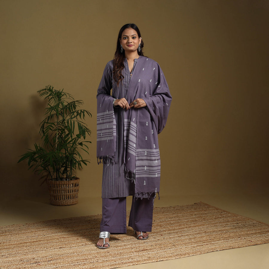Elevate your wardrobe with this purple cotton jacquard kurta set. Crafted from soft cotton, the straight-fit kurta features a functional pocket on one side for ease. It is paired with a matching palazzo designed with an elastic waistband and two side pockets for added comfort. The ensemble is completed with a graceful dupatta, making it perfect for festive gatherings as well as casual everyday wear.