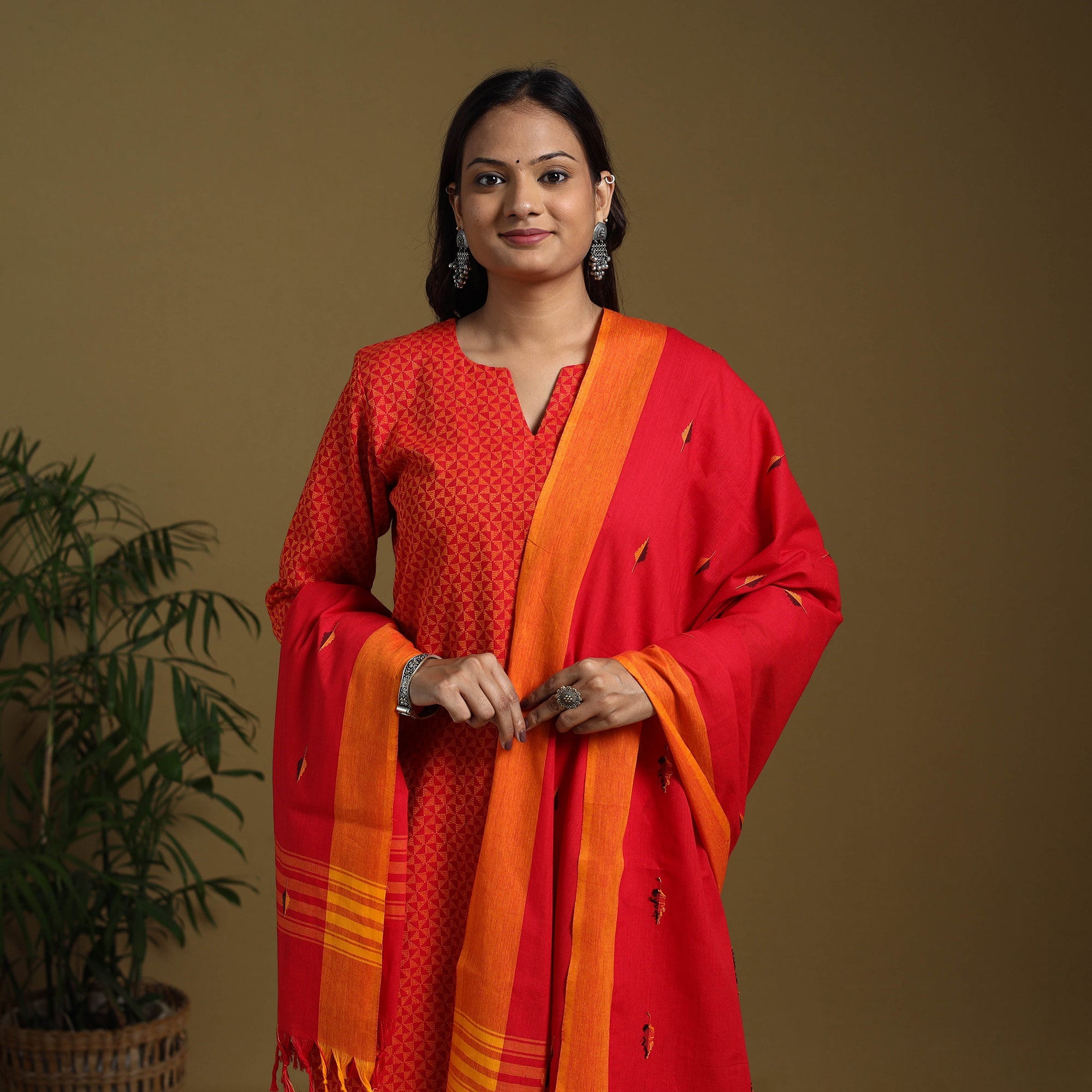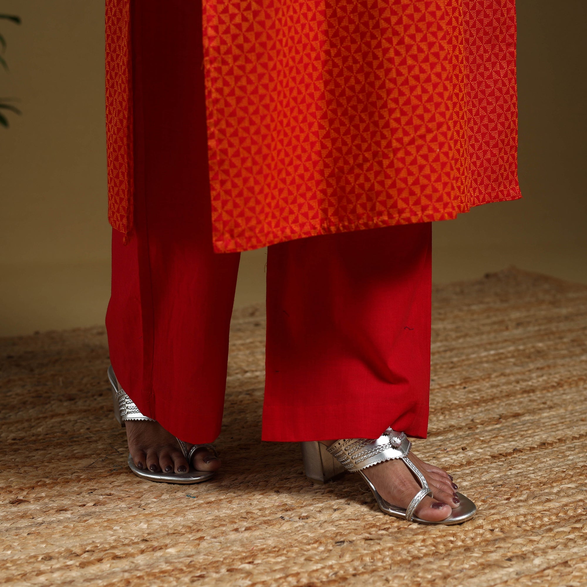 Elevate your wardrobe with this red cotton jacquard kurta set. Crafted from soft cotton, the straight-fit kurta features a functional pocket on one side for ease. It is paired with a matching palazzo designed with an elastic waistband and two side pockets for added comfort. The ensemble is completed with a graceful dupatta, making it perfect for festive gatherings as well as casual everyday wear.