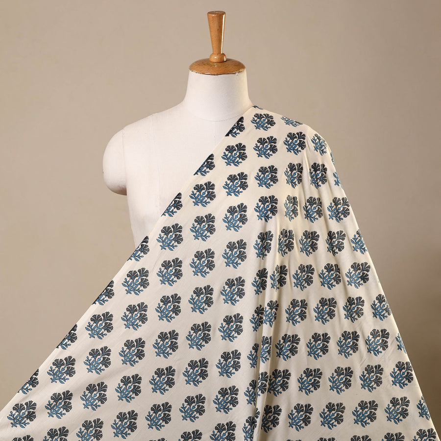 This white screen-printed cotton fabric from Rajasthan features vibrant jaipur-style motifs. Crafted with bleed-free VAT dyes, it's lightweight and breathable, perfect for dresses, tunics, or creative home projects.