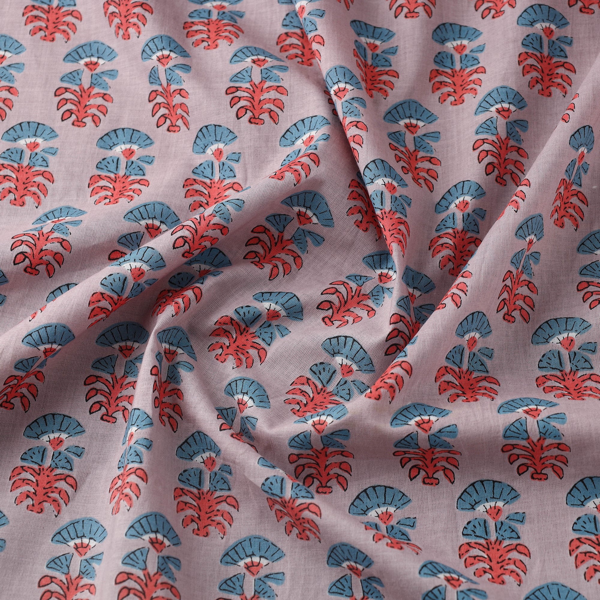 This purple screen-printed cotton fabric from Rajasthan features vibrant jaipur-style motifs. Crafted with bleed-free VAT dyes, it's lightweight and breathable, perfect for dresses, tunics, or creative home projects.