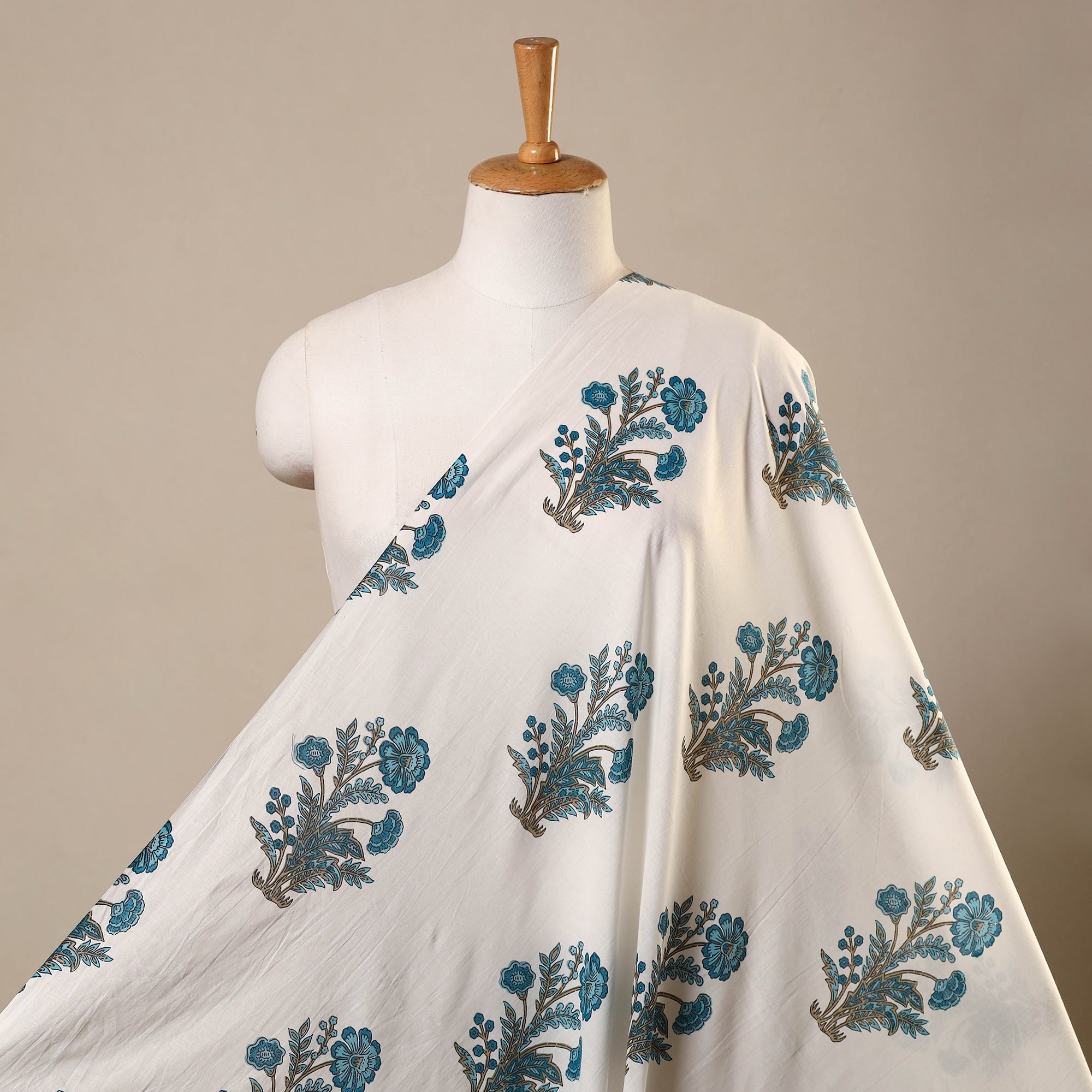 This white screen-printed cotton fabric from Rajasthan features vibrant jaipur-style motifs. Crafted with bleed-free VAT dyes, it's lightweight and breathable, perfect for dresses, tunics, or creative home projects.