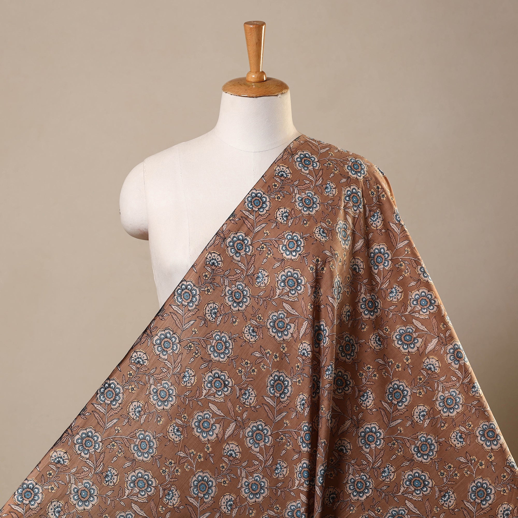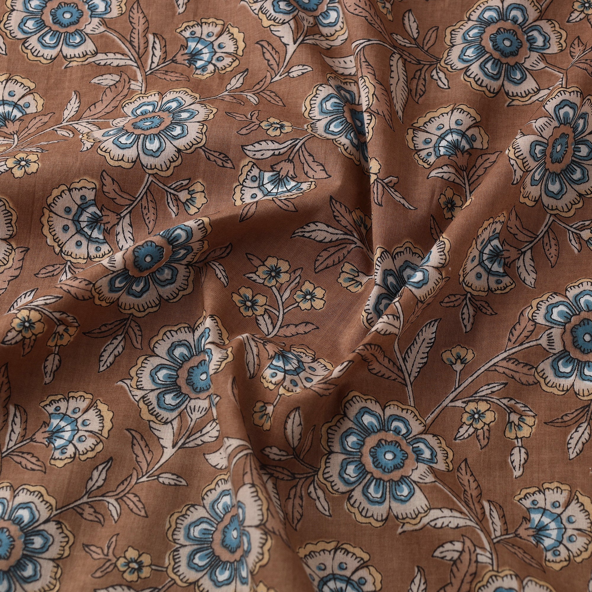 This brown screen-printed cotton fabric from Rajasthan features vibrant jaipur-style motifs. Crafted with bleed-free VAT dyes, it's lightweight and breathable, perfect for dresses, tunics, or creative home projects.