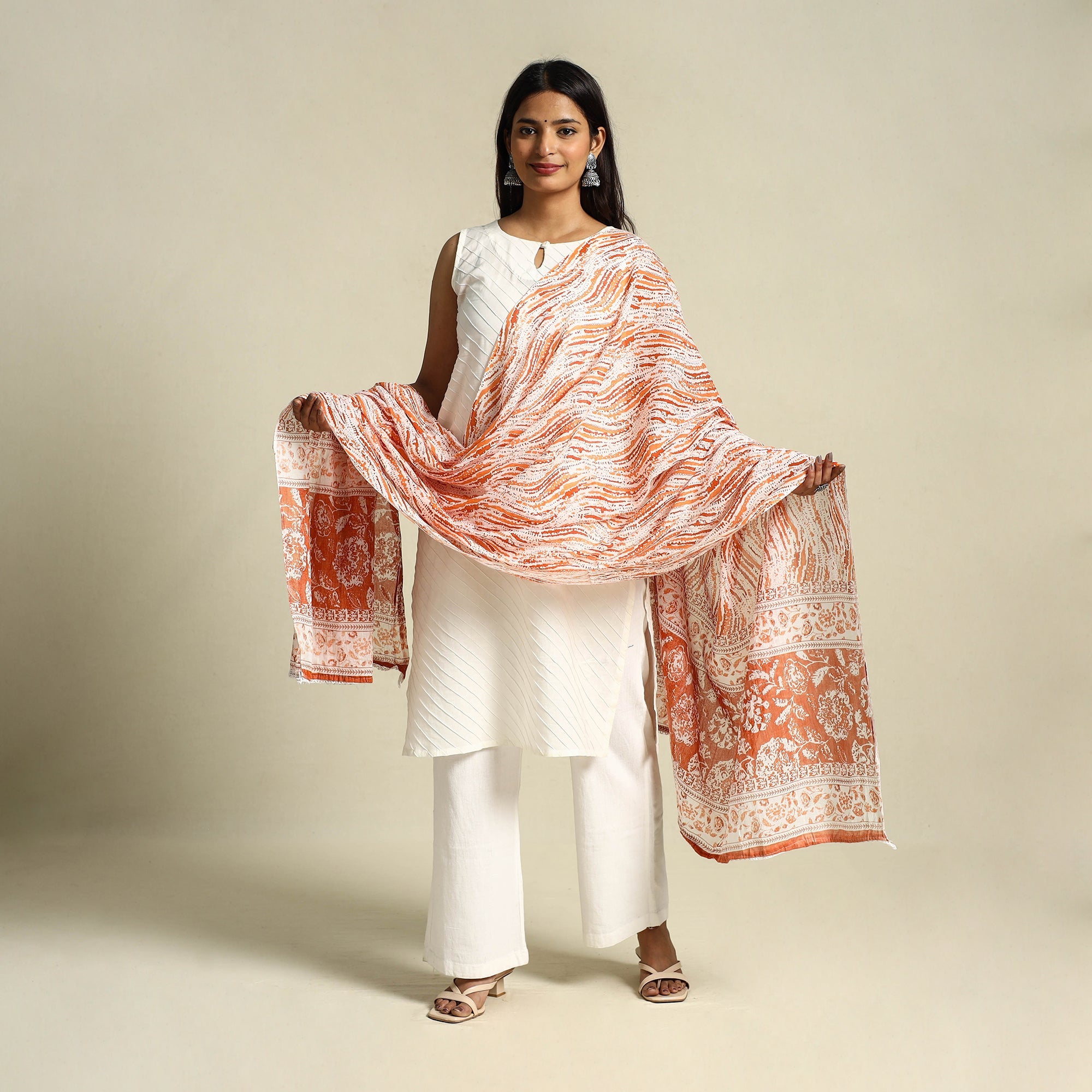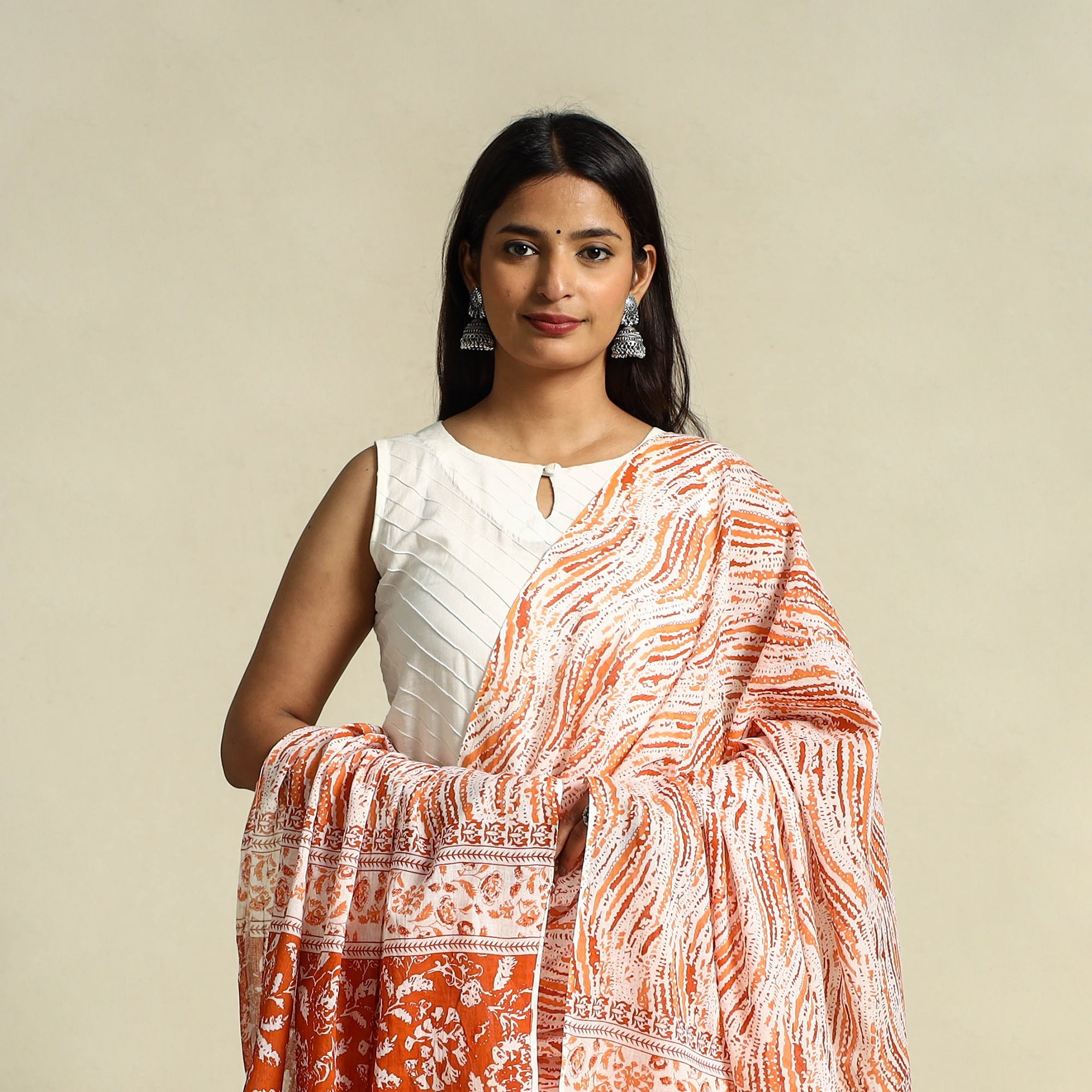 Elevate your look with this orange jaipur printed cotton dupatta featuring intricate screen prints. Designed for all-day comfort, the breathable cotton fabric makes it ideal for everyday wear alike.